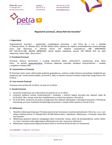 Petra Sp. z o.o. Pl. Matejki 20/2 65-056 Zielona Góra Infolinia: 801 00 70 15 68 410 40 45 NIP 929-18-21-389 REGON 080402644 [email protected] Regulamin promocji „Nowy Rok bez kosztów” I. Organizator Organizatorem promocji – podmiotem urządzającym promocję – jest Petra Sp. z o.o. z siedzibą w Zielonej Górze, Pl. Matejki 20/2, 65-056 Zielona Góra, wpisana do rejestru przedsiębiorców prowa-dzonego przez Sąd Rejonowy w Zielonej Górze, VIII Wydział Gospodarczy, KRS 0000346645, NIP 929-18-21-389, REGON 080402644, której kapitał zakładowy wynosi 100 000,00 PLN (w pełni wpłacony), zwana dalej „Biuro Petra”. II. Przedmiot Promocji Promocja dotyczy korzystania z e-usługi Petra24.pl (dalej „Petra24.pl”), świadczonej przez Biuro Petra na portalu www.petra24.pl. Promocja obejmuje wszystkie dostępne funkcjonalności i moduły, z wyjątkiem modułu SMS. III. Uczestnictwo w Promocji W Promocji może wziąć udział każdy podmiot gospodarczy, zarówno osoba fizyczna prowadząca działalność gospodarczą, jak i osoba prawna (dalej „Uczestnik”), która w okresie trwania Promocji zarejestruje swoją firmę w Petra24.pl. IV. Czas trwania Promocji Promocja trwa od dnia 03.12.2012r. do dnia 21.12.2012r. V. Zasady Promocji 1. Uczestnik zarejestruje się w Petra24.pl nie później niż 21.12.2012r. 2. Uczestnik wybierze zestaw funkcjonalności i modułów, z których będzie korzystał bez żadnych opłat do 31.03.2012. Ww. zestaw może być modyfikowany w trakcie korzystania z Petra24.pl 3. Po 31.03.2012. Uczestnik ma prawo zrezygnować bez żadnych zobowiązań z dalszego korzystania z Petra24.pl, zachowując przy tym możliwość bezpłatnego korzystania z modułu Fakturowanie w wersji of-line. VI. Reklamacje 1. 2. 3. Wszelkie reklamacje dotyczące Promocji powinny być kierowane na piśmie pod adresem: Petra Sp. z o.o. z sie dzibą w Zielonej Górze, Pl. Matejki 20/2, 65-056 Zielona Góra, z dopiskiem „Reklamacja – Promocja: Nowy Rok bez kosztów”. Reklamacja powinna zawierać następujące dane Uczestnika: nazwa, adres do korespondencji, numer telefo nu, imię i nazwisko osoby zgłaszającej reklamację oraz opis i przyczyny reklamacji. Reklamacje rozpatrywane będą przez Biuro Petra w terminie 30 dni od dnia ich otrzymania. www.petra24.pl – księgowość internetowa Petra Sp. z o.o. NIP: PL 929-18-21-389, REGON: 080402644, Sąd Rejonowy w Zielonej Górze,VIII Wydział Gospodarczy Krajowego Rejestru Sądowego KRS 0000346645 Wysokość Kapitału Zakładowego: 100 000,00 zł – kapitał opłacony w całości Strona 1 z 2 Petra Sp. z o.o. Pl. Matejki 20/2 65-056 Zielona Góra 4. Infolinia: 801 00 70 15 68 410 40 45 NIP 929-18-21-389 REGON 080402644 [email protected] Uczestnik zostanie poinformowany o wyniku postępowania reklamacyjnego pisemnie, na adres korespondencyjny podany w reklamacji. VII. Postanowienia końcowe 1. Treść niniejszego Regulaminu jest dostępna w siedzibie Biura Petra i na stronie internetowej www.petra24.pl. 2. Niniejszy Regulamin jest jedynym dokumentem określającym szczegółowe zasady Promocji. 3. Uczestnicy Promocji związani są postanowieniami Regulaminu śwadczenia usług za pomocą strony www.petra24.pl oraz Umowy Licencyjnej. 4. Każda promocja organizowana przez Biuro Petra stanowi odrębną ofertę, której zasady określa odrębny regulamin. 5. Biuro Petra zastrzega sobie prawo do wprowadzania zmian w niniejszym regulaminie, w tym do przedłużenia okresu Promocji. www.petra24.pl – księgowość internetowa Petra Sp. z o.o. NIP: PL 929-18-21-389, REGON: 080402644, Sąd Rejonowy w Zielonej Górze,VIII Wydział Gospodarczy Krajowego Rejestru Sądowego KRS 0000346645 Wysokość Kapitału Zakładowego: 100 000,00 zł – kapitał opłacony w całości Strona 2 z 2