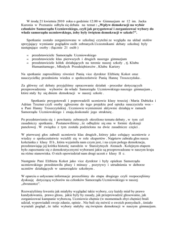 W środę 21 kwietnia 2010 roku o godzinie 12.00 w Gimnazjum nr 12 im. Jacka Kuronia w Poznaniu odbyła się debata na temat : „Wpływ demokracji na wybór członków Samorządu Uczniowskiego, czyli jak przygotować i zorganizować wybory do władz samorządu uczniowskiego, żeby były świętem demokracji w szkole?”. Spotkanie zostało zorganizowane w szkolnej czytelni ze względu na układ stołów sprzyjający wymianie poglądów osób zebranych.Uczestnikami debaty szkolnej były następujące osoby : (łącznie 21 osób ) • • • przedstawiciele Samorządu Uczniowskiego przedstawiciele klas pierwszych i drugich naszego gimnazjum przedstawiciele kółek działających na terenie naszej szkoły , tj. Klubu Humanitarnego , Młodych Przedsiębiorców , Klubu Kariery Na spotkanie zaprosiliśmy również Panią vice dyrektor Elżbietę Kokot oraz nauczycielkę przedmiotu wiedza o społeczeństwie Panią Hannę Troszczyńska . Za główny cel debaty przyjęliśmy opracowanie działań - procedur dotyczących przeprowadzenia wyborów do władz Samorządu Uczniowskiego naszego gimnazjum , które stały by się dniem demokracji w naszej szkole . Spotkanie przygotowali i poprowadzili uczniowie klasy trzeciej : Maria Dubicka i Adrian Teszner czyli osoby zgłoszone do tego projektu pod opieka nauczyciela wos – u Pani Hanny Troszczyńskiej . Uczniowie wymienieni aktywnie działają w ramach Samorządu Uczniowskiego i znają doskonale jego strukturę . Po przedstawieniu się i powitaniu zebranych określono tematu debaty , w tym cel zasadniczy spotkania . Postanowiliśmy , że odbędzie się ona w formie dyskusji panelowej . W związku z tym została podzielona na dwie zasadnicze części . W pierwszej głos zabrali uczniowie klas drugich , którzy jako celujący uczniowie z wiedzy o społeczeństwie wcielili się w role ekspertów . Najpierw zabrała głos nasza koleżanka z klasy II h , która wyjaśniła nam czym jest, i na czym polega demokracja, przedstawiając jej krótka historię narodzin w Starożytnych Atenach . Kolejnym etapem było zapoznanie się z demokratycznymi wyborami jakie są przeprowadzane w naszym kraju na różne stanowiska. O nich opowiedział nam drugi uczeń z klasy II c. Następnie Pani Elżbieta Kokot jako vice dyrektor i były opiekun Samorządu uczniowskiego przedstawiła plusy i minusy , pozytywy i utrudnienia w doborze uczniów działających w samorządzie szkolnym . W oparciu o usłyszane informacje przeszliśmy do etapu drugiego czyli rozpoczęliśmy dyskusję dotyczącą wyborów na członków Samorządu Uczniowskiego w naszej „dwunastce”. Rozważyliśmy kwestie jak miałyby wyglądać takie wybory, czy każdy miał by prawo kandydowania, prawo głosu, jakie były by zasady, jak przeprowadzić głosowanie, jak zorganizować kampanie wyborczą. Uczniowie chętnie (w momentach zbyt chętnie) brali udział, wypowiadali swoje zdanie, opinie . Nie bali się mówić o swoich pomysłach , śmiało wyrażali pogląd , że talie wybory stałyby się świętem demokracji w naszym gimnazjum. Pani Dyrektor Elżbieta Kokot wraz z nauczycielem WOS - u równie chętnie wypowiedziały się na dany temat, zwracając uwagę na istotne kwestie podkreślając , że powinien to być czas dla uczniów , ich aktywności i odpowiedzialność w wyborze swoich przedstawicieli w naszej „ małej” szkolnej demokracji . My jako organizatorzy pełniliśmy funkcję moderatorów , którzy czuwali nad płynnością , ale i kultura prowadzenia dyskusji . Udzielaliśmy głosu kolejnym panelistom oraz na zakończenie po upływie prawie dwóch godzin dokonaliśmy podsumowania przedstawiając wnioski z naszej debaty . Ustalono , że : • • • • • udział w wyborach czyli czynne prawo wyborcze będzie posiadał każdy uczeń naszej szkoły wybory odbędą się w ostatni piątek września zgłoszenia kandydatów mogą dokonywać klasy oraz kółka działające na terenie szkoły w drugim tygodniu września kampania wyborcza będzie prowadzona przez cały miesiąc wrzesień do dnia wyborów – „cisza wyborcza” w dniu wyborów na tydzień przed wyborami – piątek będzie zorganizowany SZKOLNY DZIEŃ DEMOKRACJI , który będzie polegał na festynie w czasie którego kandydaci do Samorządu Uczniowskiego zaprezentują się społeczności szkolnej Jedno z najważniejszych ustaleń dotyczyło braku ingerencji Dyrekcji szkoły oraz Grona Pedagogicznego w wybory szkolne . Nadzór merytoryczny maiłby należeć tylko do opiekuna Samorządu Uczniowskiego . Uczniowie podkreślali , że te wybory , aby były w pełni demokratyczne powinny być ich świętem i przywilejem , z którego korzystanie będzie dowodem na nasza odpowiedzialność u progu dorosłego życia . Padały stwierdzenia , że będzie to egzamin dla nas w jaki sposób chcemy o sobie i o naszych sprawach decydować w imię zasady demokratycznej „ Nic o nas bez Nas”. Na zakończenie postanowiliśmy , że 1 czerwca w Dniu Dziecka zorganizujemy druga debatę szkolną , aby ustalić konkretną ordynację wyborcza dotycząca wyboru władz Samorządu uczniowskiego w naszym gimnazjum . Uczestnicy debaty stwierdzili także , że jest to doskonała forma wymiany opinii na ważne tematy dotyczące szkoły i społeczności szkolnej . O jej przebiegu i wnioskach poinformowaliśmy Dyrektor szkoły Panią Beatę Celczyńska – Piętkę , a uczniów zamieszczając artykuł w szkolnej gazetce p.t. „ Nasza 12” . Organizatorzy debaty szkolnej Maria Dubicka i Adrian Teszner pod opieką Hanny Troszczyńskiej nauczyciela wiedzy o społeczeństwie