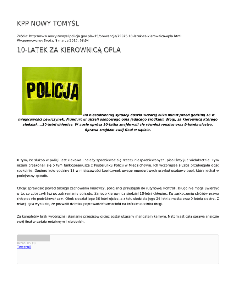 KPP NOWY TOMYŚL Źródło: http://www.nowy-tomysl.policja.gov.pl/w15/prewencja/75375,10-latek-za-kierownica-opla.html Wygenerowano: Środa, 8 marca 2017, 03:54 10-LATEK ZA KIEROWNICĄ OPLA Do niecodziennej sytuacji doszło wczoraj kilka minut przed godziną 18 w miejscowości Lewiczynek. Mundurowi ujrzeli osobowego opla jadącego środkiem drogi, za kierownicą którego siedział…..10-letni chłopiec. W aucie oprócz 10-latka znajdowali się również rodzice oraz 9-letnia siostra. Sprawa znajdzie swój finał w sądzie. O tym, że służba w policji jest ciekawa i należy spodziewać się rzeczy niespodziewanych, pisaliśmy już wielokrotnie. Tym razem przekonali się o tym funkcjonariusze z Posterunku Policji w Miedzichowie. Ich wczorajsza służba przebiegała dość spokojnie. Dopiero koło godziny 18 w miejscowości Lewiczynek uwagę mundurowych przykuł osobowy opel, który jechał w podejrzany sposób. Chcąc sprawdzić powód takiego zachowania kierowcy, policjanci przystąpili do rutynowej kontroli. Długo nie mogli uwierzyć w to, co zobaczyli tuż po zatrzymaniu pojazdu. Za jego kierownicą siedział 10-letni chłopiec. Ku zaskoczeniu stróżów prawa chłopiec nie podróżował sam. Obok siedział jego 36-letni ojciec, a z tyłu siedziała jego 29-letnia matka oraz 9-letnia siostra. Z relacji ojca wynikało, że pozwolił dziecku poprowadzić samochód na krótkim odcinku drogi. Za kompletny brak wyobraźni i złamanie przepisów ojciec został ukarany mandatem karnym. Natomiast cała sprawa znajdzie swój finał w sądzie rodzinnym i nieletnich. Ocena: 0/5 (0) Tweetnij