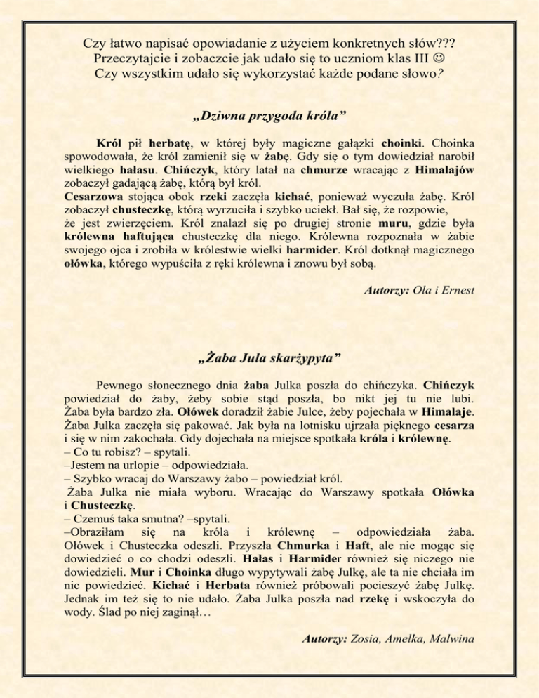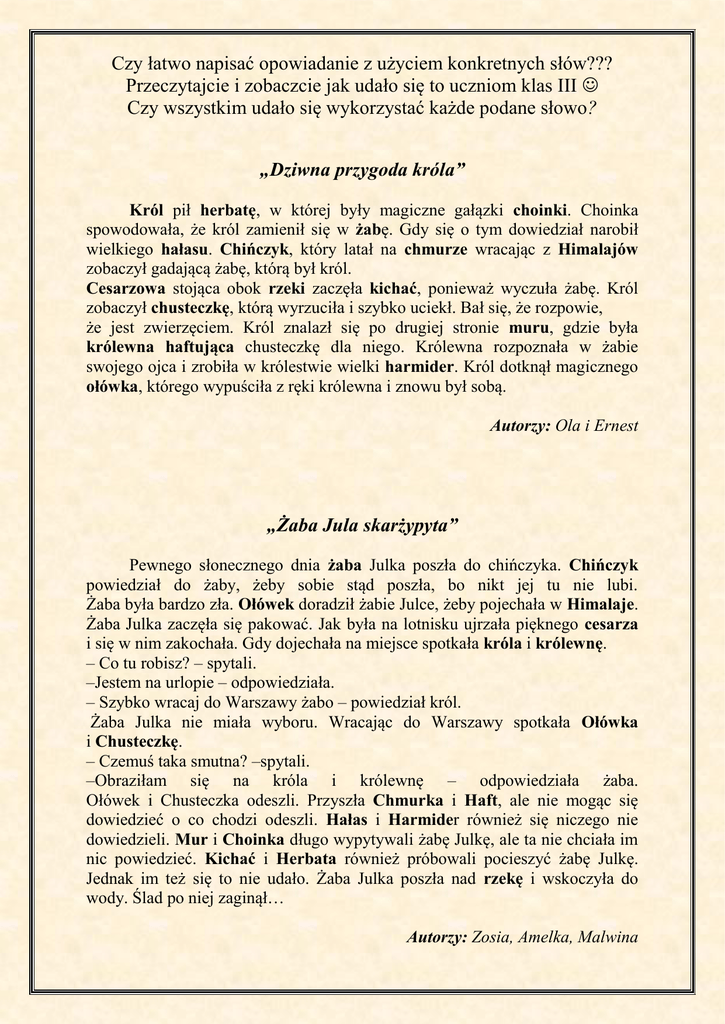 Czy łatwo napisać opowiadanie z użyciem konkretnych słów??? Przeczytajcie i zobaczcie jak udało się to uczniom klas III Czy wszystkim udało się wykorzystać każde podane słowo? „Dziwna przygoda króla” Król pił herbatę, w której były magiczne gałązki choinki. Choinka spowodowała, że król zamienił się w żabę. Gdy się o tym dowiedział narobił wielkiego hałasu. Chińczyk, który latał na chmurze wracając z Himalajów zobaczył gadającą żabę, którą był król. Cesarzowa stojąca obok rzeki zaczęła kichać, ponieważ wyczuła żabę. Król zobaczył chusteczkę, którą wyrzuciła i szybko uciekł. Bał się, że rozpowie, że jest zwierzęciem. Król znalazł się po drugiej stronie muru, gdzie była królewna haftująca chusteczkę dla niego. Królewna rozpoznała w żabie swojego ojca i zrobiła w królestwie wielki harmider. Król dotknął magicznego ołówka, którego wypuściła z ręki królewna i znowu był sobą. Autorzy: Ola i Ernest „Żaba Jula skarżypyta” Pewnego słonecznego dnia żaba Julka poszła do chińczyka. Chińczyk powiedział do żaby, żeby sobie stąd poszła, bo nikt jej tu nie lubi. Żaba była bardzo zła. Ołówek doradził żabie Julce, żeby pojechała w Himalaje. Żaba Julka zaczęła się pakować. Jak była na lotnisku ujrzała pięknego cesarza i się w nim zakochała. Gdy dojechała na miejsce spotkała króla i królewnę. – Co tu robisz? – spytali. –Jestem na urlopie – odpowiedziała. – Szybko wracaj do Warszawy żabo – powiedział król. Żaba Julka nie miała wyboru. Wracając do Warszawy spotkała Ołówka i Chusteczkę. – Czemuś taka smutna? –spytali. –Obraziłam się na króla i królewnę – odpowiedziała żaba. Ołówek i Chusteczka odeszli. Przyszła Chmurka i Haft, ale nie mogąc się dowiedzieć o co chodzi odeszli. Hałas i Harmider również się niczego nie dowiedzieli. Mur i Choinka długo wypytywali żabę Julkę, ale ta nie chciała im nic powiedzieć. Kichać i Herbata również próbowali pocieszyć żabę Julkę. Jednak im też się to nie udało. Żaba Julka poszła nad rzekę i wskoczyła do wody. Ślad po niej zaginął… Autorzy: Zosia, Amelka, Malwina Żaba znalazła rzekę i do niej wskoczyła. Wyleciała ponad chmury i spotkała chińczyka. Chińczyk był królem, a królowa była w tym czasie na targu. Królewna kichała i szukała herbaty. Król oglądał choinki, a żaba uderzyła w mur. Na targu był hałas i sprzedawano tam chusteczki. Żaba znalazła haftowaną chusteczkę i oddała ją królowej. W Himalajach żyła cesarzowa. W jej domu panował harmider, a ona sama za uchem nosiła ołówek. To wszystko brzmi dziwnie i tajemniczo...ponieważ to wszystko przyśniło się żabie… Autorzy: Michał i Patryk