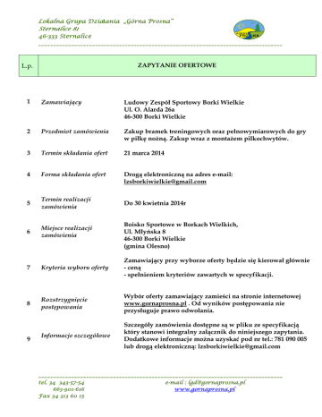 Lokalna Grupa Działania „Górna Prosna” Sternalice 81 46-333 Sternalice __________________________________________________________________________________ ZAPYTANIE OFERTOWE L.p. 1 Zamawiający Ludowy Zespół Sportowy Borki Wielkie Ul. O. Alarda 26a 46-300 Borki Wielkie 2 Przedmiot zamówienia Zakup bramek treningowych oraz pełnowymiarowych do gry w piłkę nożną. Zakup wraz z montażem piłkochwytów. 3 Termin składania ofert 21 marca 2014 4 Forma składania ofert Drogą elektroniczną na adres e-mail: [email protected] 5 Termin realizacji zamówienia 6 Miejsce realizacji zamówienia Do 30 kwietnia 2014r Boisko Sportowe w Borkach Wielkich, Ul. Młyńska 8 46-300 Borki Wielkie (gmina Olesno) 7 Kryteria wyboru oferty Zamawiający przy wyborze oferty będzie się kierował głównie - ceną - spełnieniem kryteriów zawartych w specyfikacji. 8 Rozstrzygnięcie postępowania Wybór oferty zamawiający zamieści na stronie internetowej www.gornaprosna.pl . Od wyników postępowania nie przysługuje prawo odwołania. Informacje szczegółowe Szczegóły zamówienia dostępne są w pliku ze specyfikacją który stanowi integralny załącznik do niniejszego zapytania. Dodatkowe informacje można uzyskać pod nr tel.: 781 090 005 lub drogą elektroniczną: [email protected] 9 __________________________________________________________________________________ tel. 34 343-57-54 663-901-616 Fax 34 313 60 15 e-mail : [email protected] www.gornaprosna.pl
