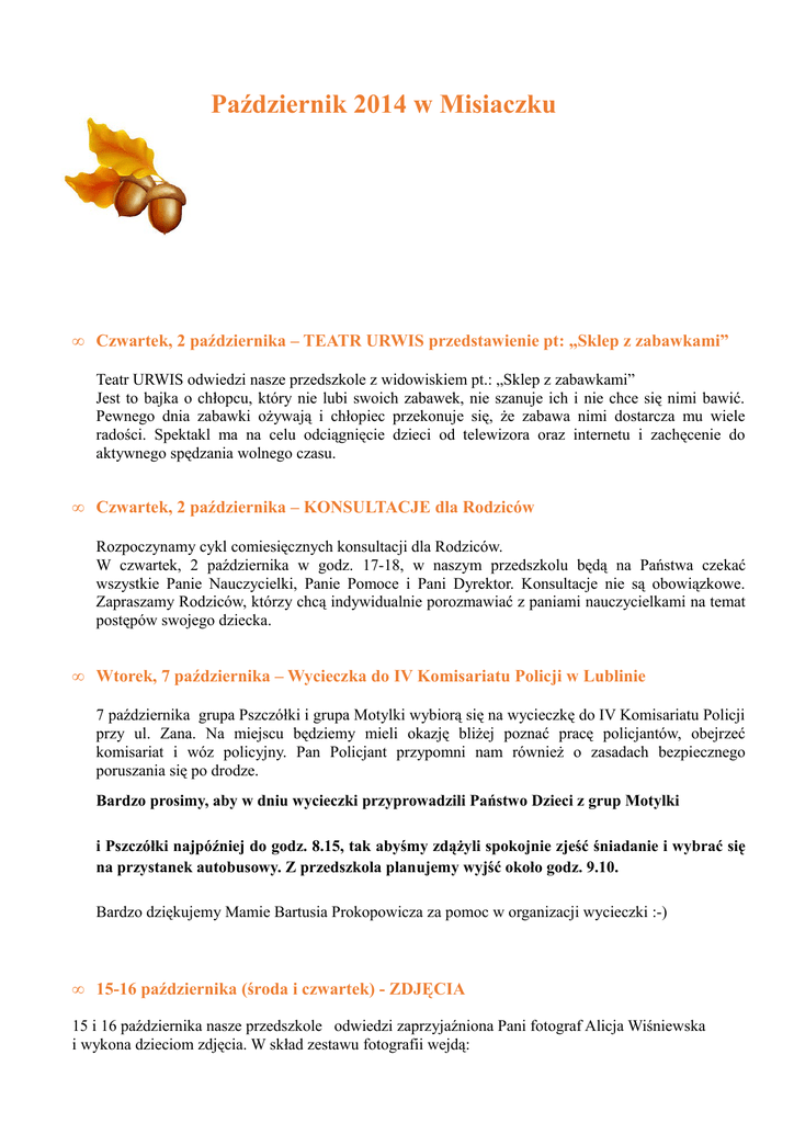 Październik 2014 w Misiaczku • Czwartek, 2 października – TEATR URWIS przedstawienie pt: „Sklep z zabawkami” Teatr URWIS odwiedzi nasze przedszkole z widowiskiem pt.: „Sklep z zabawkami” Jest to bajka o chłopcu, który nie lubi swoich zabawek, nie szanuje ich i nie chce się nimi bawić. Pewnego dnia zabawki ożywają i chłopiec przekonuje się, że zabawa nimi dostarcza mu wiele radości. Spektakl ma na celu odciągnięcie dzieci od telewizora oraz internetu i zachęcenie do aktywnego spędzania wolnego czasu. • Czwartek, 2 października – KONSULTACJE dla Rodziców Rozpoczynamy cykl comiesięcznych konsultacji dla Rodziców. W czwartek, 2 października w godz. 17-18, w naszym przedszkolu będą na Państwa czekać wszystkie Panie Nauczycielki, Panie Pomoce i Pani Dyrektor. Konsultacje nie są obowiązkowe. Zapraszamy Rodziców, którzy chcą indywidualnie porozmawiać z paniami nauczycielkami na temat postępów swojego dziecka. • Wtorek, 7 października – Wycieczka do IV Komisariatu Policji w Lublinie 7 października grupa Pszczółki i grupa Motylki wybiorą się na wycieczkę do IV Komisariatu Policji przy ul. Zana. Na miejscu będziemy mieli okazję bliżej poznać pracę policjantów, obejrzeć komisariat i wóz policyjny. Pan Policjant przypomni nam również o zasadach bezpiecznego poruszania się po drodze. Bardzo prosimy, aby w dniu wycieczki przyprowadzili Państwo Dzieci z grup Motylki i Pszczółki najpóźniej do godz. 8.15, tak abyśmy zdążyli spokojnie zjeść śniadanie i wybrać się na przystanek autobusowy. Z przedszkola planujemy wyjść około godz. 9.10. Bardzo dziękujemy Mamie Bartusia Prokopowicza za pomoc w organizacji wycieczki :-) • 15-16 października (środa i czwartek) - ZDJĘCIA 15 i 16 października nasze przedszkole odwiedzi zaprzyjaźniona Pani fotograf Alicja Wiśniewska i wykona dzieciom zdjęcia. W skład zestawu fotografii wejdą: - 1 zdjęcie grupowe formatu 15 x 21 cm - 1 zdjęcie portretowe formatu 15 x 21 cm - 1 zdjęcie z przyjacielem lub ulubioną zabawką formatu 15 x 21 cm Cena takiego zestawu zdjęć to 25 zł. Przypominamy, że zakup zdjęć nie jest obowiązkowy. Po obejrzeniu gotowych fotografii, zdecydują Państwo czy chcą je kupić czy nie. Jeżeli nie życzą sobie Państwo żeby Wasze dziecko brało udział w sesji to prosimy poinformować o tym panią wychowawczynię. Istnieje możliwość umówienia się z Panią fotograf na dodatkową, prywatną sesję zdjęciową (z rodzeństwem, z rodzicami), która odbyłaby się w przedszkolu. W tym celu należy skontaktować się z Panią Alicja pod numerem telefonu: 728 806 088. • Piątek, 17 października, godz. 9.30 – TEATR URWIS przedstawienie pt: „Eko-Bartek” Tym razem Teatr URWIS wystąpi dla nas z przedstawieniem pt.: „Eko-Bartek”. Jest to opowieść o zabawnym Misiu Bartku, który w przystępny sposób uczy dzieci ekologicznego podejścia do otaczającego świata. Z bajki dowiadujemy się jakie są podstawowe zasady dbania o środowisko (segregacja śmieci, oszczędzanie wody, energii itp.) • Poniedziałek, 20 października, godz. 11.00 – CYRK FOCUS. 20 października, nasze przedszkole odwiedzi CYRK FOCUS. W programie występy klauna, pokazy iluzjonistyczne i akrobatyczne. • Wtorek, 21 października – POMARAŃCZOWY DZIEŃ Kontynuujemy cykl kolorowych dni. W październiku zajmiemy się kolorem pomarańczowym. Prosimy, aby w tym dniu wszystkie Dzieci ubrane były na pomarańczowo (wystarczą pomarańczowe akcenty typu wzorek na bluzce itp.) oraz przyniosły do przedszkola pomarańczową zabawkę. • Środa, 29 października, godz. 10.00 – JESIENNY KABARECIK Leszka Orzeszka Na koniec października nasze przedszkole odwiedzi zaprzyjaźniony artysta Leszek Orzeszek i zabierze nas na wesołe spotkanie z Panią Jesienią. Będzie dużo śmiechu, wspólnego śpiewania i tańca, jednym słowem – dobrej zabawy :-) • Piątek, 31 października, godz. 11.00 WARSZTATY BĘBNÓW AFRYKAŃSKICH „Szczypta Afryki” W czasie warsztatów dzieci poznają budowę i historię bębnów afrykańskich. Wysłuchają koncertu gry na bębnach w wykonaniu muzyka -pana Adama Sucha. Na koniec będą miały okazję same spróbować gry na bębnach. ZMIANA TERMINU ZAJĘĆ Z RELIGII Od października rozpoczynają się w naszym przedszkolu zajęcia z religii ale zamiast w środę o godz. 15.00, będą się odbywały w poniedziałki o godz. 14.30.