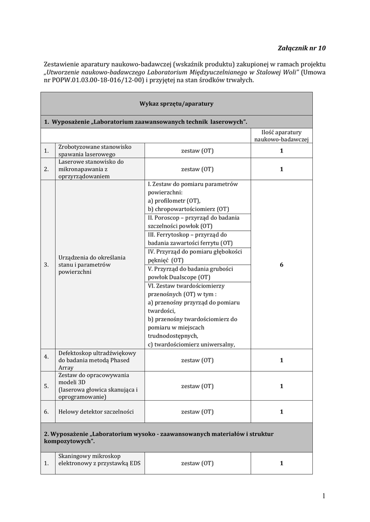 Załącznik nr 10 Zestawienie aparatury naukowo-badawczej (wskaźnik produktu) zakupionej w ramach projektu „Utworzenie naukowo-badawczego Laboratorium Międzyuczelnianego w Stalowej Woli” (Umowa nr POPW.01.03.00-18-016/12-00) i przyjętej na stan środków trwałych. Wykaz sprzętu/aparatury 1. Wyposażenie „Laboratorium zaawansowanych technik laserowych”. Ilość aparatury naukowo-badawczej 1. 2. 3. 4. 5. 6. Zrobotyzowane stanowisko spawania laserowego Laserowe stanowisko do mikronapawania z oprzyrządowaniem Urządzenia do określania stanu i parametrów powierzchni Defektoskop ultradźwiękowy do badania metodą Phased Array Zestaw do opracowywania modeli 3D (laserowa głowica skanująca i oprogramowanie) Helowy detektor szczelności zestaw (OT) 1 zestaw (OT) 1 I. Zestaw do pomiaru parametrów powierzchni: a) profilometr (OT), b) chropowartościomierz (OT) II. Poroscop – przyrząd do badania szczelności powłok (OT) III. Ferrytoskop – przyrząd do badania zawartości ferrytu (OT) IV. Przyrząd do pomiaru głębokości pęknięć (OT) V. Przyrząd do badania grubości powłok Dualscope (OT) VI. Zestaw twardościomierzy przenośnych (OT) w tym : a) przenośny przyrząd do pomiaru twardości, b) przenośny twardościomierz do pomiaru w miejscach trudnodostępnych, c) twardościomierz uniwersalny, 6 zestaw (OT) 1 zestaw (OT) 1 zestaw (OT) 1 2. Wyposażenie „Laboratorium wysoko - zaawansowanych materiałów i struktur kompozytowych”. 1. Skaningowy mikroskop elektronowy z przystawką EDS zestaw (OT) 1 1 2. Spektrometr FT-Raman z zintegrowana przystawką FTIR i mikroskopem podczerwieni 3. Konfokalny spektrometr ramanowski, Mikroskop AFM zestaw (OT) I. Konfokalny spektrometr ramanowski (OT) 1 2 II. Mikroskop AFM (OT) 4. Dyfraktometr rentgenowski z opcja mikro, Mikroanalizator rentgenowski I. Dyfraktometr rentgenowski z opcja mikro (OT) II. Mikroanalizator rentgenowski (OT) 2 5. Spektrometr fotoelektronów zestaw (OT) 1 6. Mikroskopy optyczne - 2 szt. 7. 8. Wysokorozdzielczy skaner wolumetryczny z systemem komputerowym, oprogramowaniem i wyposażeniem. Spektrometr ICP MS i OES z laserową ablacją RAZEM I. Mikroskop optyczny (OT) II. Mikroskop optyczny (OT) zestaw (OT) I. Spektromentr ICP MS (OT) II. Spektromentr ICP OES (OT) 2 1 2 23 szt. 2