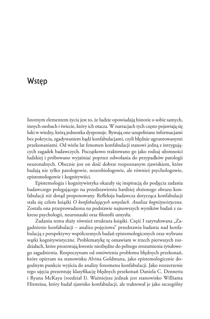 Wstęp Istotnym elementem życia jest to, że ludzie opowiadają historie o sobie samych, innych osobach i świecie, który ich otacza. W narracjach tych często pojawiają się luki w wiedzy, którą jednostka dysponuje. Bywają one uzupełniane informacjami bez pokrycia, zgadywaniem bądź konfabulacjami, czyli błędnie ugruntowanymi przekonaniami. Od wielu lat fenomen konfabulacji stanowi jedną z intrygujących zagadek badawczych. Początkowo traktowano go jako rodzaj ułomności ludzkiej i próbowano wyjaśniać poprzez odwołania do przypadków patologii neuronalnych. Obecnie jest on dość dobrze rozpoznanym zjawiskiem, które badają nie tylko patologowie, neurobiologowie, ale również psychologowie, epistemologowie i kognitywiści. Epistemologia i kognitywistyka okazały się inspiracją do podjęcia zadania badawczego polegającego na przedstawieniu bardziej złożonego obrazu konfabulacji niż dotąd proponowany. Refleksja badawcza dotycząca konfabulacji stała się celem książki O konfabulujących umysłach. Analiza kognitywistyczna. Została ona przeprowadzona na podstawie najnowszych wyników badań z zakresu psychologii, neuronauki oraz filozofii umysłu. Zadaniu temu służy również struktura książki. Część I zatytułowana „Zagadnienie konfabulacji – analiza pojęciowa” przedstawia badania nad konfabulacją z perspektywy współczesnych badań epistemologicznych oraz wybrane wątki kognitywistyczne. Problematykę tę omawiam w trzech pierwszych rozdziałach, które prezentują kwestie niezbędne do pełnego zrozumienia tytułowego zagadnienia. Rozpoczynam od omówienia problemu błędnych przekonań, które opieram na stanowisku Alvina Goldmana, jako epistemologicznie dogodnym punkcie wyjścia do analizy fenomenu konfabulacji. Jako rozszerzenie tego ujęcia prezentuję klasyfikację błędnych przekonań Daniela C. Dennetta i Ryana McKaya (rozdział I). Ważniejsze jednak jest stanowisko Williama Hirsteina, który badał zjawisko konfabulacji, ale traktował je jako szczególny 8 wstęp wariant zachowań patologicznych, co – w moim przekonaniu – nie wystarczy do pełnego zrozumienia tego rodzaju ludzkich zachowań (rozdział II). Hirstein nieprecyzyjnie określił jednak właściwości i kategorie konfabulacji, toteż w toku analizy epistemologicznej nasuwa się spostrzeżenie, że przypadki konfabulacji nie ograniczają się do zachowań patologicznych – konfabulują bowiem także ludzie bez dysfunkcji procesów poznawczych. Poprzez wstępną krytykę stanowiska Hirsteina proponuję zatem poszerzenie pojmowania zjawiska konfabulacji o tzw. konfabulacje normalne. Propozycji tej towarzyszy również próba ich wstępnej kategoryzacji. Umożliwia ona nie tylko dokładniejszą charakterystykę pojmowania konfabulacji, ale daje podstawy do wyróżnienia ich odmian oraz sposobów ich wyjaśniania (rozdział III). Zaproponowana typologia przypadków naturalnego konfabulowania pozwala na wyróżnienie pięciu typów konfabulacji ze względu na: rodzaj procesu poznawczego, lokalizację czasową, przedmiot konfabulacji, formę konfabulacji oraz typ procesu konfabulowania. Omawiam również proces i ściśle z nim powiązane mechanizmy konfabulowania oraz zestawiam konfabulację z takimi fenomenami epistemicznymi, jak kłamstwo, fikcjotwórstwo i samooszustwo. Część II zatytułowana „Zagadnienie konfabulacji – zastosowania” w pierwszej kolejności prezentuje konfabulacje pamięciowe jako szczególnie istotne w generowaniu treści konfabulacyjnych. Ze względu na przypadki błędów pamięciowych w zdrowych systemach poznawczych można wyróżnić trzy tryby konfabulowania: wypełniający, scalający i addytywny (rozdział IV). Istotnym uzupełnieniem tych treści jest rozdział V, w którym omawiam konfabulacje socjocentryczne, jakie można zestawić z teorią Mind-Reading Barona-Cohena, czyli teorią „czytania w umysłach”. Szczególnie ważne wydaje się jednak podmiotowe i świadomościowe uwarunkowanie zjawiska konfabulacji. Omawiam je w rozdziale VI, gdzie odwołuję się m.in. do poglądów Neissera (koncepcji pięciu rodzajów „ja”) oraz Dennetta (idei jaźni jako środka „narratywnej ciężkości” oraz orwellowskiego i stalinowskiego modelu świadomości). Ponadto przedstawiam zagadnienie statusu argumentu homunkulusa wobec krytyk wykonawczych teorii pamięciowych, które opisuje Gianfranco Dalla Barba. Pracę zamyka kwestia biologiczno-ewolucyjnego statusu fenomenu konfabulacji, którą traktuję jako szczególny przypadek egzaptacji, czyli formy wytworzonej ewolucyjnie w toku rozwoju filogenetycznego gatunku ludzkiego (rozdział VII). Zaprezentowane argumenty potwierdzają, że działanie umysłu ludzkiego – przy udziale czynników kulturowych – zależy od tak złożonych uwarunkowań, że nie sposób objaśnić wszystkich fenomenów funkcjonowania ludzkiego umysłu za pomocą klasycznych pojęć teorii ewolucji, takich jak adaptacja. Wydaje się więc, że konfabulacyjne zdolności naszego umysłu są raczej wstępnym, bo egzaptacyjnym dopasowaniem do działania w środowisku kulturowym. wstęp 9 W zakończeniu książki podsumowuję uzyskane wyniki badań, a w bibliografii przedstawiam najnowsze prace, w których poruszono zagadnienie konfabulacji oraz tematy nawiązujące do rozumienia tego zjawiska. Problematyka ta znajduje się jeszcze na etapie analiz empirycznych, jak wskazują na to choćby badania Hirsteina. Przedstawionej w pracy problematyce w polskiej literaturze nie poświęcono dotąd szerzej zakrojonych studiów. Jednak rosnące zapotrzebowanie na humanistyczno-biologiczną refleksję nad tym zjawiskiem sprawia, że w ostatnim czasie intensywnie rozwijane są właśnie badania epistemologiczne i kognitywistyczne. Można nawet zaryzykować stwierdzenie, iż wyprzedzają one w tym zakresie usystematyzowane badania eksperymentalne. Książka niniejsza mieści się w nurcie teoretycznym (epistemologiczno-kognityw