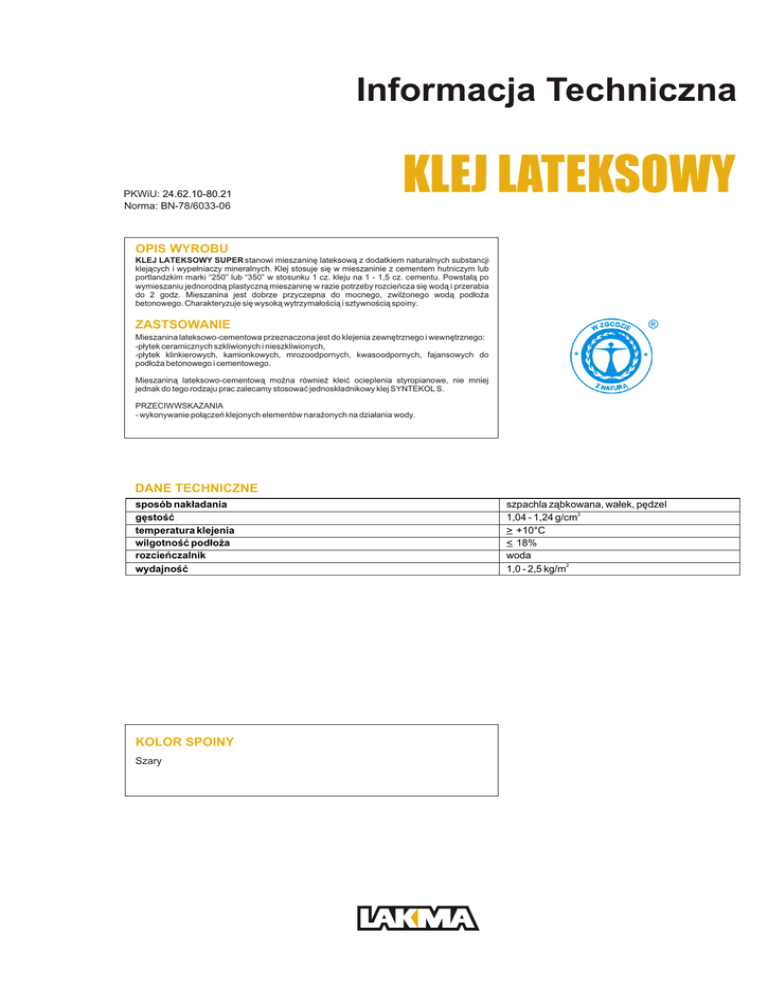 Informacja Techniczna PKWiU: 24.62.10-80.21 Norma: BN-78/6033-06 KLEJ LATEKSOWY OPIS WYROBU KLEJ LATEKSOWY SUPER stanowi mieszaninê lateksow¹ z dodatkiem naturalnych substancji klej¹cych i wype³niaczy mineralnych. Klej stosuje siê w mieszaninie z cementem hutniczym lub portlandzkim marki “250” lub “350” w stosunku 1 cz. kleju na 1 - 1,5 cz. cementu. Powsta³¹ po wymieszaniu jednorodn¹ plastyczn¹ mieszaninê w razie potrzeby rozcieñcza siê wod¹ i przerabia do 2 godz. Mieszanina jest dobrze przyczepna do mocnego, zwil¿onego wod¹ pod³o¿a betonowego. Charakteryzuje siê wysok¹ wytrzyma³oœci¹ i sztywnoœci¹ spoiny. ZASTSOWANIE ® Mieszanina lateksowo-cementowa przeznaczona jest do klejenia zewnêtrznego i wewnêtrznego: -p³ytek ceramicznych szkliwionych i nieszkliwionych, -p³ytek klinkierowych, kamionkowych, mrozoodpornych, kwasoodpornych, fajansowych do pod³o¿a betonowego i cementowego. Mieszanin¹ lateksowo-cementow¹ mo¿na równie¿ kleiæ ocieplenia styropianowe, nie mniej jednak do tego rodzaju prac zalecamy stosowaæ jednosk³adnikowy klej SYNTEKOL S. PRZECIWWSKAZANIA - wykonywanie po³¹czeñ klejonych elementów nara¿onych na dzia³ania wody. DANE TECHNICZNE sposób nak³adania gêstoœæ temperatura klejenia wilgotnoœæ pod³o¿a rozcieñczalnik wydajnoœæ KOLOR SPOINY Szary szpachla z¹bkowana, wa³ek, pêdzel 1,04 - 1,24 g/cm3 _ +10°C > _ 18% < woda 1,0 - 2,5 kg/m2 SPOSÓB STOSOWANIA Przygotowanie pod³o¿a: Powierzchnie klejone powinny byæ oczyszczone, wyrównane, odpylone, mocne i przed klejeniem zwil¿ane. Przyklejanie elementów: Masê nak³adaæ szpachl¹ na powierzchnie nie wiêksz¹ ni¿ 1 m2, a nastêpnie po odczekaniu 2 - 5 minut uk³adaæ p³ytki mocno dociskaj¹c je do pod³o¿a. Zabrudzenia klejem usuwa siê niezw³ocznie tamponem zwil¿onym wod¹. Przy klejeniu du¿ych powierzchni najlepiej stosowaæ szpachle z¹bkowane. Spoina uzyskuje pe³n¹ wytrzyma³oœæ po 28 dniach. Na pod³o¿ach wykonanych z tynków wapiennych prace nale¿y wykonywaæ po 1 tygodniu sezonowania, natomiast z tynków cementowych po 4 tygodniach. SK£ADOWANIE 12 miesiêcy od daty produkcji. Klej przechowywaæ w zamkniêtych opakowaniach w temp. od +5°C do + 35°C. OPAKOWANIA 10 kg, 25 kg, 100 kg BHP i P.Po¿. KLEJ LATEKSOWY SUPER jest niepalny. Przy pracach nale¿y stosowaæ podstawowe zasady BHP. W przypadku stosowania kleju w zamkniêtych pomieszczeniach nale¿y je wietrzyæ do zaniku specyficznego zapachu - nie wydziela szkodliwych substancji lotnych ATESTY Ocena Higieniczna nr B-77/93/95 wydan¹ przez Pañstwowy Zak³ad Higieny Komunalnej w Warszawie. Œwiadectwo nr 30/88 Instytutu Techniki Budowlanej w Warszawie. LAKMA S.A. 43-400 Cieszyn, ul. Frysztacka 173, Dzia³ Sprzeda¿y: tel(033) 85 21 688, fax (033) 85 10 255 LAKMA S.A. nie odpowiada za jakoœæ wymalowañ w przypadku nieprzestrzegania powy¿szych zaleceñ.