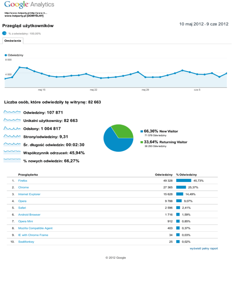 http://w w w .hotparty.plhttp://w w w .h… www.hotparty.pl [DOMYŚLNY] 10 maj 2012 9 cze 2012 Przegląd użytkowników % z odwiedziny : 100,00% Omówienie Odwiedziny 8 000 4 000 maj 15 maj 22 maj 29 cze 5 Liczba osób, które odwiedziły tę witrynę: 82 663 Odwiedziny: 107 871 Unikalni użytkownicy: 82 663 Odsłony: 1 004 817 66,36% New Visitor 71 578 Odw iedziny Strony/odwiedziny: 9,31 33,64% Returning Visitor Śr. długość odwiedzin: 00:02:30 36 293 Odw iedziny Współczynnik odrzuceń: 45,94% % nowych odwiedzin: 66,27% Przeglądarka Odwiedziny % Odwiedziny 1. Firefox 49 328 2. Chrome 27 365 3. Internet Explorer 15 628 4. Opera 9 788 5. Safari 2 596 2,41% 6. Android Browser 1 716 1,59% 7. Opera Mini 912 0,85% 8. Mozilla Compatible Agent 403 0,37% 9. IE with Chrome Frame 34 0,03% SeaMonkey 25 0,02% 10. 45,73% 25,37% 14,49% 9,07% wyświetl pełny raport © 2012 Google