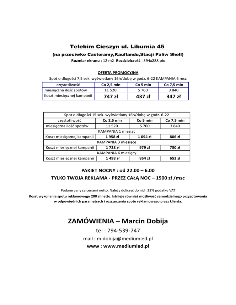 Telebim Cieszyn ul. Liburnia 45 (na przeciwko Castoramy,Kauflandu,Stacji Paliw Shell) Rozmiar ekranu : 12 m2 Rozdzielczość : 394x288 pix OFERTA PROMOCYJNA Spot o długości 7,5 sek. wyświetlany 16h/dobę w godz. 6-22 KAMPANIA 6 msc częstotliwość miesięczna ilość spotów Koszt miesięcznej kampanii Co 2,5 min 11 520 Co 5 min 5 760 Co 7,5 min 3 840 747 zł 437 zł 347 zł Spot o długości 15 sek. wyświetlany 16h/dobę w godz. 6-22 częstotliwość Co 2,5 min Co 5 min Co 7,5 min miesięczna ilość spotów 11 520 5 760 3 840 KAMPANIA 1 miesiąc Koszt miesięcznej kampanii 1 958 zł 1 094 zł 806 zł KAMPANIA 3 miesiące Koszt miesięcznej kampanii 1 728 zł 979 zł 730 zł KAMPANIA 6 miesięcy Koszt miesięcznej kampanii 1 498 zł 864 zł 653 zł PAKIET NOCNY : od 22.00 – 6.00 TYLKO TWOJA REKLAMA - PRZEZ CAŁĄ NOC – 1500 zł /msc Podane ceny są cenami netto. Należy doliczyć do nich 23% podatku VAT Koszt wykonania spotu reklamowego 200 zł netto. Istnieje również możliwość samodzielnego przygotowania w odpowiednich parametrach i rozszerzeniu spotu reklamowego przez klienta. ZAMÓWIENIA – Marcin Dobija tel : 794-539-747 mail : [email protected] www : www.mediumled.pl