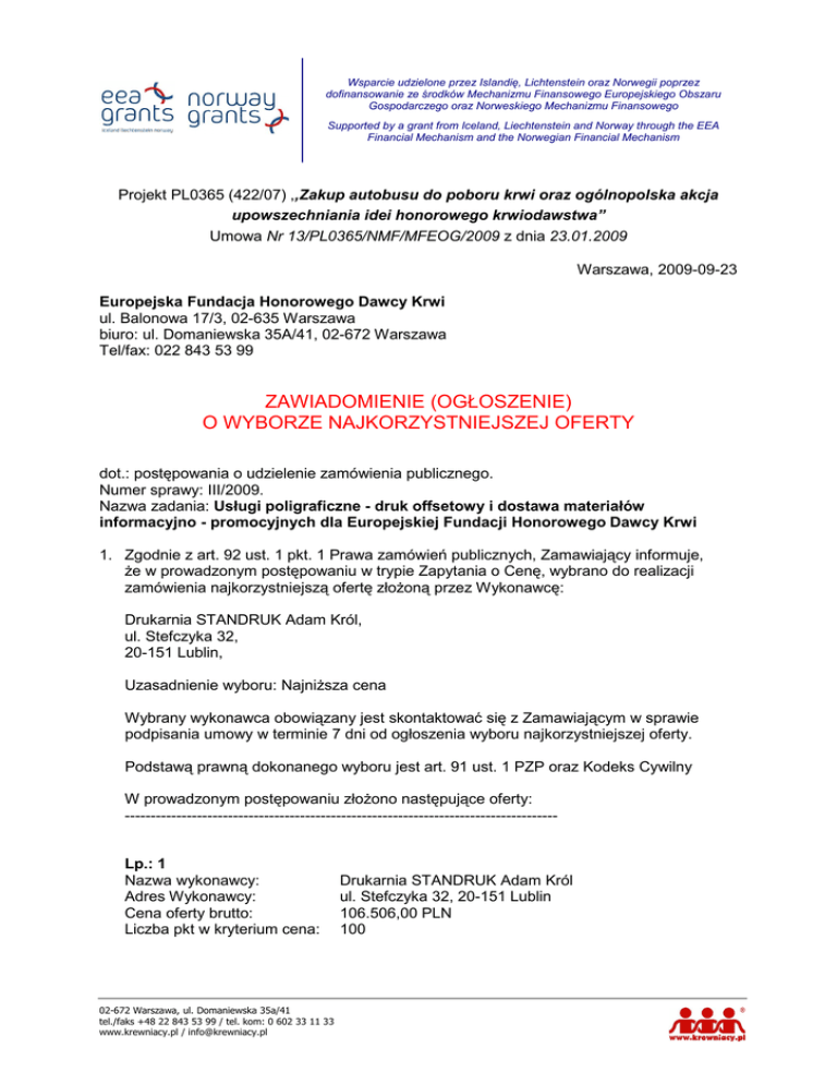 Wsparcie udzielone przez Islandię, Lichtenstein oraz Norwegii poprzez dofinansowanie ze środków Mechanizmu Finansowego Europejskiego Obszaru Gospodarczego oraz Norweskiego Mechanizmu Finansowego Supported by a grant from Iceland, Liechtenstein and Norway through the EEA Financial Mechanism and the Norwegian Financial Mechanism Projekt PL0365 (422/07) ,,Zakup autobusu do poboru krwi oraz ogólnopolska akcja upowszechniania idei honorowego krwiodawstwa” Umowa Nr 13/PL0365/NMF/MFEOG/2009 z dnia 23.01.2009 Warszawa, 2009-09-23 Europejska Fundacja Honorowego Dawcy Krwi ul. Balonowa 17/3, 02-635 Warszawa biuro: ul. Domaniewska 35A/41, 02-672 Warszawa Tel/fax: 022 843 53 99 ZAWIADOMIENIE (OGŁOSZENIE) O WYBORZE NAJKORZYSTNIEJSZEJ OFERTY dot.: postępowania o udzielenie zamówienia publicznego. Numer sprawy: III/2009. Nazwa zadania: Usługi poligraficzne - druk offsetowy i dostawa materiałów informacyjno - promocyjnych dla Europejskiej Fundacji Honorowego Dawcy Krwi 1. Zgodnie z art. 92 ust. 1 pkt. 1 Prawa zamówień publicznych, Zamawiający informuje, Ŝe w prowadzonym postępowaniu w trypie Zapytania o Cenę, wybrano do realizacji zamówienia najkorzystniejszą ofertę złoŜoną przez Wykonawcę: Drukarnia STANDRUK Adam Król, ul. Stefczyka 32, 20-151 Lublin, Uzasadnienie wyboru: NajniŜsza cena Wybrany wykonawca obowiązany jest skontaktować się z Zamawiającym w sprawie podpisania umowy w terminie 7 dni od ogłoszenia wyboru najkorzystniejszej oferty. Podstawą prawną dokonanego wyboru jest art. 91 ust. 1 PZP oraz Kodeks Cywilny W prowadzonym postępowaniu złoŜono następujące oferty: -----------------------------------------------------------------------------------Lp.: 1 Nazwa wykonawcy: Adres Wykonawcy: Cena oferty brutto: Liczba pkt w kryterium cena: 02-672 Warszawa, ul. Domaniewska 35a/41 tel./faks +48 22 843 53 99 / tel. kom: 0 602 33 11 33 www.krewniacy.pl / [email protected] Drukarnia STANDRUK Adam Król ul. Stefczyka 32, 20-151 Lublin 106.506,00 PLN 100 Wsparcie udzielone przez Islandię, Lichtenstein oraz Norwegii poprzez dofinansowanie ze środków Mechanizmu Finansowego Europejskiego Obszaru Gospodarczego oraz Norweskiego Mechanizmu Finansowego Supported by a grant from Iceland, Liechtenstein and Norway through the EEA Financial Mechanism and the Norwegian Financial Mechanism Lp.: 2 Nazwa wykonawcy: Adres Wykonawcy: Cena oferty brutto: Liczba pkt w kryterium cena: BACCARAT Zakład Poligraficzny s.c. Małgorzata Olech, Mirosław Olech ul. Raszyńska 37-39, 20-780 Lublin 127.002,00 PLN 83,86 Lp.: 3 Nazwa wykonawcy: Adres Wykonawcy: Cena oferty brutto: Liczba pkt w kryterium cena: DRONA Sp. z o.o. ul. Janiszewska 9, 02-264 Warszawa - 2. Działając na podstawie art. 92 ust. 1 pkt. 2 Prawa zamówień publicznych Zamawiający informuje, Ŝe w prowadzonym postępowaniu została odrzucona 1 oferta. Nazwa wykonawcy: Adres Wykonawcy: DRONA Sp. z o.o. ul. Janiszewska 9, 02-264 Warszawa Oferty złoŜone przez wykonawców, którzy nie zostali zaproszeni do składania ofert z mocy art. 89 ust. 1 pkt. 5 Prawa zamówień publicznych, podlegają obligatoryjnemu odrzuceniu. W prowadzonym postępowaniu w trybie zapytania o cenę, zamawiający ma obowiązek dokonać oceny ofert tylko tych wykonawców, którzy zostali zaproszeni do składania ofert. 3. Działając na podstawie art. 92 ust. 1 pkt. 3 Prawa zamówień publicznych Zamawiający informuje, Ŝe w prowadzonym postępowaniu nie zostali wykluczeni Ŝadni wykonawcy. Środki ochrony prawnej Od niniejszej decyzji przysługują środki ochrony prawnej określone w ustawie z dnia 29 stycznia 2004 roku Prawo zamówień publicznych (t. j. Dz. U. z 2007 r. Nr 223, poz. 1655 z p. zm) - dział VI "Środki ochrony prawnej". Wobec czynności podjętych przez zamawiającego w toku postępowania oraz w przypadku zaniechania przez zamawiającego czynności, do której jest obowiązany na podstawie ustawy, moŜna wnieść protest do zamawiającego Protest wnosi się w terminie 7 dni od dnia, w którym powzięto lub przy zachowaniu naleŜytej staranności moŜna było powziąć wiadomość o okolicznościach stanowiących podstawę jego wniesienia. ____________________________________ Marcin Velinov 02-672 Warszawa, ul. Domaniewska 35a/41 tel./faks +48 22 843 53 99 / tel. kom: 0 602 33 11 33 www.krewniacy.pl / [email protected]