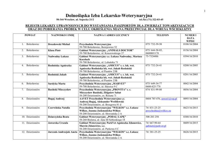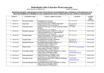 1 Dolnośląska Izba Lekarsko-Weterynaryjna 50-344 Wrocław, ul. Sopocka 21/2 tel./fax (71) 322-03-45 REJESTR LEKARZY UPRAWNIONYCH DO WYSTAWIANIA PASZPORTÓW DLA ZWIERZĄT TOWARZYSZĄCYCH ORAZ DO POBIERANIA PRÓBEK W CELU OKREŚLENIA MIANA PRZECIWCIAŁ DLA WIRUSA WŚCIEKLIZNY POWIAT 1. Bolesławiec 2. Bolesławiec 3. Bolesławiec 4. Bolesławiec 5. Bolesławiec 6. Bolesławiec 7. Dzierżoniów 8. Dzierżoniów 9. Dzierżoniów 10. Dzierżoniów 11. Dzierżoniów 12. Dzierżoniów NAZWISKO I IMIĘ Drozdowski Michał NAZWA I ADRES LECZNICY Przychodnia Weterynaryjna 59-700 Bolesławiec, Bożejowice 52 Klasa Piotr Gabinet Weterynaryjny „ANIMALS DOCTOR” 59-700 Bolesławiec, ul. Kraszewskiego 37 Nadwodny Łukasz Gabinet Weterynaryjny s.c. Łukasz Nadwodny, Mariusz Kocełuch 59-700 Bolesławiec, ul. Lubańska 71 Rosłońska Agnieszka Gabinet Weterynaryjny „AMICUS” s. c. lek. wet. Agnieszka Rosłońska lek. wet. Jakub Rosłoński 59-700 Bolesławiec, ul Piastów 23B Rosłoński Jakub Gabinet Weterynaryjny „AMICUS” s. c. lek. wet. Agnieszka Rosłońska lek. wet. Jakub Rosłoński 59-700 Bolesławiec, ul Piastów 23B Surdyka Marta Przychodnia Weterynaryjna „MARVET” 59-700 Bolesławiec, ul. Staszica 9 C Basiński Mieczysław Przychodnia Weterynaryjna „PROVITA” s. c. Mieczysław Basiński, Zbigniew Sabat 58-200 Dzierżoniów, os. Różane 7i Bugaj Andrzej AAVET Przychodnia Weterynaryjna s.c. Andrzej Bugaj, Aleksander Wróblewski 58-200 Dzierżoniów, ul. Brzegowa 81 d Czerwińska Natalia Przychodnia Weterynaryjna "WILKOS" s.c. Łukasz Wilkos, Joanna Jaskmanicka-Wilkos 58-200 Dzierżoniów, ul. Słowiańska 2 A Dziurzyńska Beata Gabinet Weterynaryjny „PODAL ŁAPĘ” 58-260 Bielawa, ul. Jana III Sobieskiego 18 Jaworska Urszula Gabinet Weterynaryjny ParkVet Agnieszka Zdanowicz, Marcin Zdanowicz, s.c. 58-200 Dzierżoniów, ul. Parkowa 4 C Jurczuk-Andrzejuk Aneta Przychodnia Weterynaryjna "WILKOS" s.c. Łukasz Wilkos, Joanna Jaskmanicka-Wilkos 58-200 Dzierżoniów, ul. Słowiańska 2 A TELEFON 075/ 732-39-50 NUMER I DATA WPISU 0106/16/2004 075/ 644-58-85, 0600801178 75-7324486 0156/16/2004 0394/16/2010 075/ 732-24-41 0200/16/2005 075/ 732-24-41 0201/16/2005 075/ 649-34-77 0600-825-778 074/ 831-99-80 0042/16/2004 0604 785 476, [email protected] 0095/16/2004 74/ 831-25-25 [email protected] 0623/16/2015 508 283 258 0388/16/2010 74/ 667-90-64 [email protected] 0609/16/2015 74/ 381-25-25 0626/16/2015 0056/16/2004 2 13. Dzierżoniów Lorenc Jan Gabinet Weterynaryjny „SYNTAX” Jan Lorenc 58-200 Dzierżoniów, ul. Parkowa 4c 501 848 294 0425/16/2011 14. Dzierżoniów Malka Marek 074/ 833-69-96 0062/16/2004 15. Dzierżoniów Piwko Maciej 074/ 831-02-25 [email protected] 0288/16/2007 16. Dzierżoniów Salamon Marta Sulimowicz Radosław 660-537-808 vetmedica.dzierzoniow@gmail. com 074/ 834-05-88 0590/16/2014 17. Dzierżoniów 18. Dzierżoniów Więckowska-Foina Malwina 787-100-720, [email protected] 0572/16/2014 19. Dzierżoniów Wróblewski Aleksander 20. Dzierżoniów Zdanowicz Agnieszka 21. Głogów Piotr Barna 22. Głogów Buksa Dariusz 23. Głogów Cywińska-Ziobroń Marlena 24. Głogów Drzewiecki Piotr 25. Głogów Kołomyjec Katarzyna 26. Głogów Kowalewska Anna 27. Głogów Kulisch Sławomir 28. Głogów Nowacki Grzegorz 29. Głogów Ilkiewicz Magdalena Przychodnia Weterynaryjna 58-260 Bielawa, ul. Osiedlowa 7 Przychodnia Weterynaryjna 58-200 Dzierżoniów, ul. Grota Roweckiego 1 b Przychodnia Weterynaryjna Vet Medica lek. wet. Jacek Ptak 58-200 Dzierżoniów, os. Tęczowe 20 A - 5 Gabinet Weterynaryjny 58-260 Bielawa, ul. Westerplatte 11 57-400 Nowa Ruda, ul. Spacerowa 21 Gabinet Weterynaryjny „Foina Vet” Malwina Więckowska-Foina 58-250 Pieszyce, ul. Kościuszki 26 AAVET Przychodnia Weterynaryjna s.c. Andrzej Bugaj, Aleksander Wróblewski 58-200 Dzierżoniów, ul. Brzegowa 81 d Gabinet Weterynaryjny ParkVet Agnieszka Zdanowicz, Marcin Zdanowicz, s.c. 58-200 Dzierżoniów, ul. Parkowa 4 C Gabinet Weteryanryjny Udr Piotra, Piotr Barna 67-200 Głogów, ul. Saturna 54A Gabinet Weterynaryjny „ORBIVET” 67-200 Głogów, ul. Piotra Skargi 4 Przychodnia Weterynaryjna BASSET dr n. wet. Katarzyna Kołomyjec 67-200 Głogów, ul. Ogrodowa 13 Gabinet Weterynaryjny s. c. lek. wet. Piotr Drzewiecki, Roman Borkowski 67-200 Głogów, ul. Sikorskiego 45 Przychodnia Weterynaryjna „BASSET” 67-200 Głogów, ul. Ogrodowa 13 Przychodnia Weterynaryjna Katarzyna Ratajska 67-200 Głogów, ul. Galla Anonima 1-3 Przychodnia Weterynaryjna „AS” S. Kulisch 67-200 Głogów Ruszowice, Biała 9 Przychodnia Weterynaryjna „CENTAUR” 67-200 Głogów, ul. Rycerska 23 Przychodnia Weterynaryjna BASSET dr n. wet. Katarzyna Kołomyjec 67-200 Głogów, ul. Ogrodowa 13 0139/16/2004 0179/16/2005 74/ 667-90-64 [email protected] 0544/16/2014 694 533-499 [email protected] 76/ 835-11-46 0571/16/2014 76/ 834-27-23 [email protected] 0498/16/2013 76/ 833-31-05 562/16/2014 076/ 834-27-23 0152/16/2005 076/ 8347461 0332/16/2008 076/ 835-26-23 0271/16/2006 0695 451-515 [email protected] 76/ 834-27-23 [email protected] 0410/16/2010 0113/16/2004 0499/16/2013 3 30. Głogów Słowek Julia 31. Głogów Sroka Krzysztof 32. Głogów Wandycz Marcin 33. Głogów Wisowaty Piotr 34. Głogów Włodarek-Wisowata Karolina 35. Głogów Zielony Magdalena 36. Góra Domaszewska Monika 37. Góra Domaszewski Tomasz 38. Góra Mikrut-Bielecka 39. Jawor Grzeszczuk Jan 40. Jawor Hamala Jerzy 41. Jawor Korda Anna 42. Jawor Łasicki Bartosz 43. Jawor Oktawiec Marianna 44. Jawor Przybyszewska Monika Przychodnia Weterynaryjna „ZWIERZAK” SIMES Sp. z o.o. 67-200 Głogów, ul. Polna 27 Gabinet Weterynaryjny 67-222 Jerzmanowa, ul. Poziomkowa 5 Gabinet Weterynaryjny „Amigo” 67-200 Głogów, ul. Saturna Pawilon 49 Przychodnia Weterynaryjna „ORIVET” lek. wet. Radosław Osiecki 67-200 Głogów, ul. Jedności Robotniczej 18 Przychodnia Weterynaryjna „ORIVET” lek. wet. Radosław Osiecki 67-200 Głogów, ul. Jedności Robotniczej 18 Prz