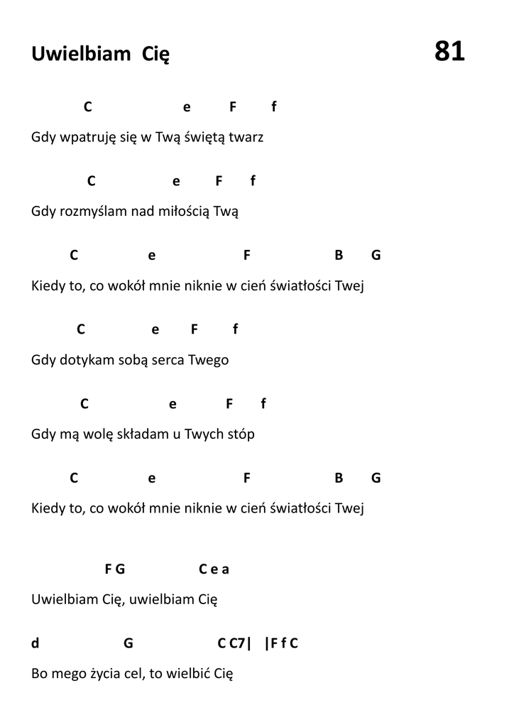 81 Uwielbiam Cię C e F f Gdy wpatruję się w Twą świętą twarz C e F f Gdy rozmyślam nad miłością Twą C e F B G Kiedy to, co wokół mnie niknie w cień światłości Twej C e F f Gdy dotykam sobą serca Twego C e F f Gdy mą wolę składam u Twych stóp C e F B Kiedy to, co wokół mnie niknie w cień światłości Twej FG Cea Uwielbiam Cię, uwielbiam Cię d G C C7| |F f C Bo mego życia cel, to wielbić Cię G