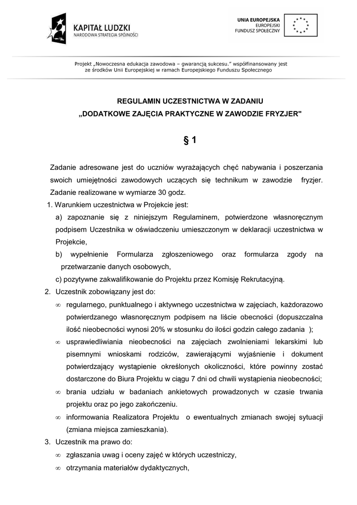 Projekt „Nowoczesna edukacja zawodowa – gwarancją sukcesu.” współfinansowany jest ze środków Unii Europejskiej w ramach Europejskiego Funduszu Społecznego REGULAMIN UCZESTNICTWA W ZADANIU „DODATKOWE ZAJĘCIA PRAKTYCZNE W ZAWODZIE FRYZJER" §1 Zadanie adresowane jest do uczniów wyrażających chęć nabywania i poszerzania swoich umiejętności zawodowych uczących się technikum w zawodzie fryzjer. Zadanie realizowane w wymiarze 30 godz. 1. Warunkiem uczestnictwa w Projekcie jest: a) zapoznanie się z niniejszym Regulaminem, potwierdzone własnoręcznym podpisem Uczestnika w oświadczeniu umieszczonym w deklaracji uczestnictwa w Projekcie, b) wypełnienie Formularza zgłoszeniowego oraz formularza zgody na przetwarzanie danych osobowych, c) pozytywne zakwalifikowanie do Projektu przez Komisję Rekrutacyjną. 2. Uczestnik zobowiązany jest do: • regularnego, punktualnego i aktywnego uczestnictwa w zajęciach, każdorazowo potwierdzanego własnoręcznym podpisem na liście obecności (dopuszczalna ilość nieobecności wynosi 20% w stosunku do ilości godzin całego zadania ); • usprawiedliwiania nieobecności na zajęciach zwolnieniami lekarskimi lub pisemnymi wnioskami rodziców, zawierającymi wyjaśnienie i dokument potwierdzający wystąpienie określonych okoliczności, które powinny zostać dostarczone do Biura Projektu w ciągu 7 dni od chwili wystąpienia nieobecności; • brania udziału w badaniach ankietowych prowadzonych w czasie trwania projektu oraz po jego zakończeniu. • informowania Realizatora Projektu o ewentualnych zmianach swojej sytuacji (zmiana miejsca zamieszkania). 3. Uczestnik ma prawo do: • zgłaszania uwag i oceny zajęć w których uczestniczy, • otrzymania materiałów dydaktycznych, Projekt „Nowoczesna edukacja zawodowa – gwarancją sukcesu.” współfinansowany jest ze środków Unii Europejskiej w ramach Europejskiego Funduszu Społecznego • rezygnacji z udziału w projekcie bez ponoszenia odpowiedzialności, w przypadku gdy rezygnacja nastąpiła z ważnych powodów losowych niemożliwych do przewidzenia w chwili podpisania niniejszego regulaminu (np. długotrwała choroba). 4. Warunki rezygnacji z udziału w projekcie: • w przypadku rezygnacji Uczestnika z udziału w zajęciach objętych projektem z przyczyn nieuzasadnionych lub skreślenia z listy uczestników projektu spowodowanego niewypełnieniem postanowień zawartych w niniejszym regulaminie, Wnioskodawca zobowiązuje Uczestnika do zwrotu otrzymanych materiałów dydaktycznych, • przekroczenie 20% nieobecności zajęć (bez usprawiedliwienia) będzie wiązało się z nieotrzymaniem zaświadczeń (certyfikatów) o ukończonych zajęciach. §2 REKRURACJA KANDYDATÓW 1. Zasady rekrutacji Uczestników a) I etap – akcja informacyjno-promocyjna przeprowadzona bezpośrednio w klasach oraz za pośrednictwem strony internetowej szkoły, tablicy informacyjnej, b) II etap – wypełnianie formularzy zgłoszeniowych i złożenie ich za pośrednictwem wychowawców klas lub nauczycieli prowadzących zajęcia wyrównawcze w Biurze Projektu, c) III etap – kwalifikacja Uczestników – na podstawie wypełnionych formularzy zgłoszeniowych Komisja Rekrutacyjna zakwalifikuje uczestników. W skład Komisji Rekrutacyjnej wchodzą: Koordynator Projektu, Asystent ds. logistycznych, Asystent ds. monitoringu i sprawozdawczości. 2. Komisja Rekrutacyjna dokonuje kwalifikacji uczniów, biorąc pod uwagę: a) kryteria ramowe: • uczestnik projektu w danym zadaniu jest uczniem do zakończenia zajęć ( czerwiec 2014), Projekt „Nowoczesna edukacja zawodowa – gwarancją sukcesu.” współfinansowany jest ze środków Unii Europejskiej w ramach Europejskiego Funduszu Społecznego • wyłonione do uczestnictwa w zadaniu zobowiązane są do posiadania aktualnej książeczki zdrowia. • chęć uczestnictwa w zadaniu potwierdzona wypełnionym formularzem zgłoszeniowym i formularzem zgody na przetwarzanie danych osobowych, • Komisja Rekrutacyjna w pierwszej kolejności kwalifikować będzie osoby z technikum fryzjerskiego, • na potrzeby Projektu utworzona zostanie lista rezerwowa, • kwalifikowane będą osoby z najwyższą liczba punktów. b) kryteria szczegółowe: • średnia ocen. : • Średnia ocen Liczba punktów pow. 4 10 3,91 - 4 8 3,61 – 3,9 7 3,41 – 3,6 6 3,1 – 3,4 5 2,81 – 3 4 2,51 – 2,8 3 2,21 – 2,5 2 2 – 2,2 1 Poniżej 2 0 zachowanie Zachowanie Liczba punktów wzorowe 10 bardzo dobre 8 dobre 6 Poprawne 4 Projekt „Nowoczesna edukacja zawodowa – gwarancją sukcesu.” współfinansowany jest ze środków Unii Europejskiej w ramach Europejskiego Funduszu Społecznego • nieodpowiednie 2 naganne 0 liczba godzin opuszczonych nieusprawiedliwionych w I semestrze w roku szkolnym 2013/2014. Nieobecność na zajęciach Liczba punktów 0 - 8 godz. 10 9 - 12 godz. 9 13 - 15 godz. 8 16 - 18 godz. 7 19 - 21 godz. 6 22 - 24 godz. 5 25 – 27 godz. 4 28 - 30 godz. 3 31 - 35 godz. 2 Powyżej 36 godz. 0 3. Osoby z list rezerwowych będą kwalifikowane w przypadku rezygnacji osób z list podstawowych na zasadach jw. 6. Informowanie kandydatów o zakwalifikowaniu do grupy docelowej odbywać się będzie ustnie przez wychowawcę klasy. 7. W przypadku nie stawienia się kandydata na zajęciach w dniu ich rozpoczęcia na jego miejsce zostanie wpisany kandydat z listy rezerwowej. 8. Po zakończeniu procedury rekrutacyjnej kandydaci zakwalifikowani do projektu zobowiązani będą do podpisania deklaracji uczestnictwa w zadaniu, 9. Kandydaci, którzy złożą w/w dokumenty rekrutacyjne stają się Uczestnikami zadania. 10. Złożone przez kandydata dokumenty nie podlegają zwrotowi. Projekt „Nowoczesna edukacja zawodowa – gwarancją sukcesu.” współfinansowany jest ze środków Unii Europejskiej w ramach Europejskiego Funduszu Społecznego §3 POSTANOWIENIA KOŃCOWE 1. Regulamin wchodzi w życie z dniem 21.01.2013 r. 2. Wnioskodawca zastrzega sobie prawo do wprowad