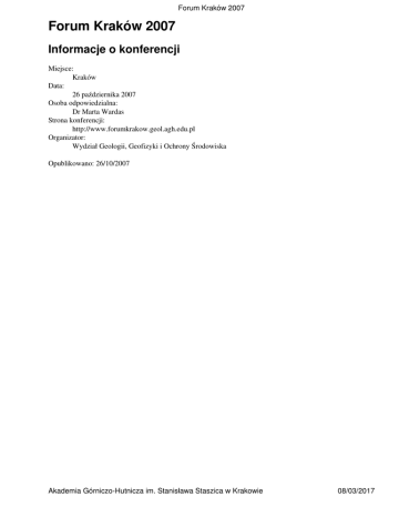 Forum Kraków 2007 Forum Kraków 2007 Informacje o konferencji Miejsce: Kraków Data: 26 października 2007 Osoba odpowiedzialna: Dr Marta Wardas Strona konferencji: http://www.forumkrakow.geol.agh.edu.pl Organizator: Wydział Geologii, Geofizyki i Ochrony Środowiska Opublikowano: 26/10/2007 Akademia Górniczo-Hutnicza im. Stanisława Staszica w Krakowie 08/03/2017