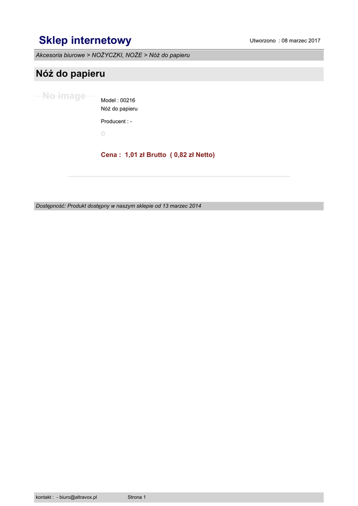 Sklep internetowy Akcesoria biurowe > NOŻYCZKI, NOŻE > Nóż do papieru Nóż do papieru No image Model : 00216 Nóż do papieru Producent : � Cena : 1,01 zł Brutto ( 0,82 zł Netto) Dostępność: Produkt dostępny w naszym sklepie od 13 marzec 2014 kontakt : - [email protected] Strona 1 Utworzono : 08 marzec 2017