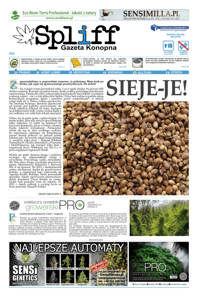 WERSJA ONLINE: spliff.pl Gazeta Konopna #51 pełnoletnich Z PRAWO strona S4 3 HEMP LOBBY S.5 strona MEDYCYNA S.8 apowiadaliśmy w poprzednim numerze, że pokażemy Wam krok po kroku, jak zająć się uprawą konopi przemysłowych. Do dzieła! Na wstępie warto powiedzieć sobie, o co w ogóle chodzi. Na pewno NIE chodzi o palenie. Konopie są cudem natury, boską rośliną, posiadającą niezliczone zastosowania. Palenie do celów rekreacyjnych jest jedynie niewielkim wycinkiem większej całości – ale i o tym kilka słów będzie. Przez lata roślina ta padała ofiarą bezmyślnych przepisów, lęków i strachów przed „narkotykami”, w efekcie czego stała się w Polsce rośliną egzotyczną. Nic bardziej mylnego. Bardziej egzotyczny od konopi jest kartofel, przywieziony do Polski zaledwie kilkaset lat temu. Konopie na polskiej ziemi rosły, rosną i rosnąć będą, a my zadbamy o to, żeby było ich jak najwięcej. Można też pójść okrężną drogą i osobiście wystąpić do odpowiednich władz o zezwolenia. Przecierając szlaki, skróciliśmy dla Was nieco drogę, uzyskując pozytywną opinię Ministerstwa Rolnictwa i Rozwoju Wsi w tej sprawie. Do 2012 r. funkcjonował unijny mechanizm dopłat do przetwórstwa konopi, a organizacją tego zajmowała się Agencja Rynku Rolnego, która prowadziła specjalny rejestr pierwszych przetwórców słomy konopnej. Chcąc działać na rynku, trzeba było posiadać wpis do rejestru. Po 2012 r. rejestr zniknął, a wymóg bycia na liście pozostał. Absurd? Polska! dalszy ciąg na str. 4 całość znajdziesz na stronie 9 P oradnik dla początkujących. Część I - wegetacja Bazując na swoim wieloletnim doświadczeniu w uprawie INDOOR postanowiłem podzielić się z innymi kilkoma uwagami, które będą pomocne dla każdego, kto rozpoczął zabawę z grow. Poniższy poradnik zawiera wskazówki, które mogą dla niektórych wydać się banalne, osobiście uważam, że dobrze wykonany grow składa się w większości właśnie z takich małych i banalnych czynności, które musimy wykonać poprawnie, aby zapewnić naszym roślinom jak najlepsze warunki do szybkiego rozwoju. W tej części poradnika skupimy się na fazie wegetatywnej roślin, do której wielu growerów nie przykłada zbyt dużej wagi. Jest to wielkim błędem, bo to właśnie od fazy wegetatywnej zależy jak duże i mocne korzenie wykształcą nasze rośliny, jak duże urosną i czy zdrowe i mocne wejdą w fazę kwitnienia, aby dać maksymalny plon. Ten poradnik skierowany jest raczej dla początkujących farmerów, którzy chcieliby się dowiedzieć, co zrobić aby uprawa przebiegła bezproblemowo i przyjemnie, jednak mam nadzieję, że wytrawny i doświadczony rolnik nie odmówi sobie przyjemności odświeżenia wiedzy lub podyskutowania o problematyce ‘wega’ na forum growlike.pro, na które serdecznie zapraszam. R E K LA M A BEZPŁATNA S.11 KULTURA strona S.13 STREFA 16 Sieje-je! Dobra, my tu gadu-gadu, a gleba stygnie. Co trzeba zrobić, żeby móc cieszyć oko widokiem kilku milionów (!) roślin na hektarze? W pierwszej kolejności, jak to w Polsce, niestety trzeba załatwić formalności. Potencjalny rolnik nie ma tu zbyt wielkiego wyboru, bo organizacje zajmujące się kontraktacją upraw można policzyć na palcach jednej kalekiej ręki. Na terenie całego kraju działają w zasadzie tylko dwie – Instytut Włókien Naturalnych i Roślin Zielarskich z Poznania i HemPoland.eu, jak również kilka firm i organizacji (m.in. Włókniści czy Efa G.) w poszczególnych regionach Polski. 12 GROWING GAZETA W budownictwie konopie wykorzystuje się głównie jako zaprawę oraz płyty paździerzowe. Są one wydajnym, oszczędnym i przyjaznym środowisku materiałem. Trzeba przyznać, że Acid Dreams jest najbardziej wyczerpującą dostępną syntezą tej niezwykłej dekady i roli jakiej w tumulcie lat sześćdziesiątych odegrał król psychedelików. Najistotniejsza w Twojej sprawie będzie opinia biegłego dotycząca roślin. Trzeba się z nią szczegółowo zapoznać, aby zgłosić ewentualne uwagi w trakcie procesu. S.2 Dla osób 2 Spliff Gazeta Konopna Prawo Marokański haszysz ciągle za kratkami. Budzi się Jamajka zwiększony poziom dobrobytu, a także większe profity (wyborcze) dla polityków oraz likwidacja czarnego rynku. Być może brak w tym zestawie także legalizacji marihuany do celów rekreacyjnych, ale tutaj wkrada się polityka. Jak mawiają: sztuka kompromisu. To przynosi efekty. Teraz także w nacjonalistycznym ugrupowaniu politycznym Istiqal jest wstępna zgoda. Wyliczenia matematyczne bowiem pozbywają skrupułów prawie wszystkich. Do tego dochodzą oficjalne szacunki tamtejszego rządu mówiące o ok. 700 tys. osób zajmujących się produkcją konopi. Czy jeszcze w tym roku dojdzie do jakiś konkretnych rozwiązań? Bardzo możliwe. Liczenie ma to do siebie, że prawie zawsze na jego końcu dostajemy odpowiedź na pytanie: czy się opłaca, czy nie. Religia i polityka tutaj nie mają zbyt dużo do gadania. Wynik to wynik. Dlatego jeszcze w tym roku można spodziewać się porozumienia wśród największych frakcji politycznych w Maroku w sprawie legalizacji marihuany. Szacuje się roczny zysk ze sprzedaży zioła w tym kraju na 10 mld dolarów B ardzo możliwe, że Maroko jest na końcu bardzo długiej drogi. W XIX wieku państwo tolerowało prywatne uprawy marihuany – głównie na północy, w górach Rif. W latach 20. minionego stulecia doszło do zmiany trendu. Nagle marihuana stała się szkodliwa, a jej hodowanie ostro karane. Patrząc w tym czasie na cały świat, widzimy właśnie wycofywanie marihuany kosztem alkoholu. Posiadacz większej ilości na Jamajce od teraz będzie musiał liczyć się z… karą grzywny. W 1992 r. ówczesny król Maroko Hassan II wypowiada narkotykom wojnę. Po paru latach w praktyce wszystko wraca do normy: państwo niby karnie grozi palcem, ale o plantacjach na południu doskonale wie i nie robi tak nap