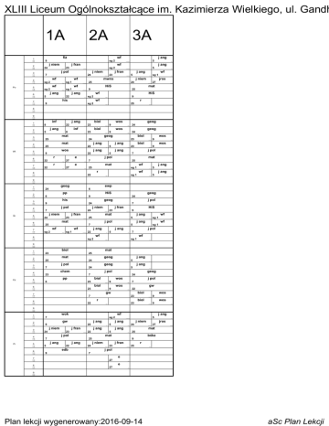 XLIII Liceum Ogólnokształcące im. Kazimierza Wielkiego, ul. Gandh 1A 1 8:00 8:45 2 8:50 9:35 3 9:45 10:30 4 10:40 11:25 Po 5 11:45 12:30 6 12:40 13:25 7 13:35 14:20 2A 3A fiz wf 9 sg 2 j niem 24 j fran j. niemiecki 23 wf sg 2 j. francuski j pol j niem 7 24 wf sg 2 Chłopcy sg 1 Chłopcy sg 1 Dziewczęta 25 Dziewczęta 9 22 5 sg 2 his j.niemiecki 27 j.rosyjski mat HiS 9 Chłopcy wf 9 Gr.2 jros 25 wf gr.2 sg 1 j niem 24 Gr.2 wf Gr.1 HiS j ang gr.1 j ang j.francuski mwns wf j ang 5 5 Dziewczęta 23 Gr.2 j ang j fran j.niemiecki wf wf sg 2 j ang 5 Dziewczęta sg 2 r 25 Chłopcy religia 8 14:25 15:10 9 15:15 16:00 1 8:00 8:45 2 8:50 9:35 3 9:45 10:30 4 10:40 11:25 Wt 5 11:45 12:30 6 12:40 13:25 7 13:35 14:20 inf 8 j ang gr.1 22 gr.1 8 j ang 5 biol gr.2 23 gr.2 23 inf wos biologia 9 biologia 9 biol mat geog WOS 24 WOS 24 wos geog geog 25 biol 24 23 mat j ang 25 22 wos 22 r 27 22 27 Gr.2 WOS wos WOS mat 25 wf 25 sg 1 r 8 22 14:25 15:10 9 7 mat etyka biologia j pol 7 e religia 23 j pol etyka r 5 9 biol Gr.2 j ang Gr.1 e religia 5 j ang 9 22 j ang Gr.1 wos biologia j ang Gr.1 5 Gr.1 5 wf sg 1 religia Gr.2 j ang Gr.2 9 15:15 16:00 1 8:00 8:45 2 8:50 9:35 3 9:45 10:30 4 10:40 11:25 Śr 5 11:45 12:30 6 12:40 13:25 7 13:35 14:20 geog ewp 24 6 pp HiS 6 geog 9 24 his geog 9 j pol 24 j pol 7 j niem 7 24 j niem 24 j.niemiecki j fran j. niemiecki 23 j fran 23 HiS j.francuski mat j. francuski j ang 25 5 mat j pol 25 wf 5 wf Chłopcy sg 1 j ang Dziewczęta 22 j ang Gr.1 sg 2 sg 1 Gr.1 sg 1 5 Gr.2 wf Gr.2 j pol Gr.2 7 wf 8 14:25 15:10 wf Gr.1 j ang 7 sg 2 9 wf sg 1 Chłopcy Gr.1 9 15:15 16:00 1 8:00 8:45 2 8:50 9:35 3 9:45 10:30 4 10:40 11:25 Cz 5 11:45 12:30 biol mat 23 25 mat geog 25 j ang 24 5 j pol geog 7 Gr.1 j ang 24 5 chem Gr.1 j pol 23 geog 7 pp 24 biol 6 23 wos biologia 9 biol 6 23 12:40 13:25 j pol WOS 7 WOS 22 wos biologia 9 gw gw 7 biol 7 13:35 14:20 23 r 8 22 14:25 15:10 wos biologia 9 biologia 9 biol 23 religia WOS wos WOS 9 15:15 16:00 1 8:00 8:45 2 8:50 9:35 3 9:45 10:30 4 10:40 11:25 Pi 5 11:45 12:30 6 12:40 13:25 7 13:35 14:20 8 14:25 15:10 wok wf 7 sg 2 gw j ang 9 22 j niem 24 j fran j. niemiecki 23 22 j pol Gr.1 5 Gr.2 j ang gr.1 22 gr.2 24 27 j.rosyjski mat Gr.2 25 bśkz 9 j niem edb Gr.2 jros j.niemiecki j ang 25 j ang 9 Gr.1 j niem 24 mat 7 5 j ang 5 j ang j. francuski j ang 5 Dziewczęta j fran j.niemiecki 23 r j.francuski 25 religia j pol 7 e 27 etyka e 27 etyka 9 15:15 16:00 Plan lekcji wygenerowany:2016-09-14 aSc Plan Lekcji
