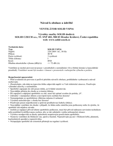Návod k obsluze a údržbě VENTILÁTOR SOLID VSP16 Výrobky značky SOLID dodává: SOLID CZECH a.s., Tř. SNP 402, 500 03 Hradec Králové, Česká republika web: www.solid-czech.cz Technická data: Typ: Napětí: Příkon: Počet rychlostí: Třída ochrany: Krytí: Hladina akustického výkonu (dB)(A): SOLID VSP16 220-240V AC, 50 Hz 40 W 3 rychlosti I IP20 <= 72 dB (A) Ventilátor je možné provozovat pouze v prostředích s normálními vlivy (běžné domácí a kancelářské prostředí). Ventilátor nesmí být uveden v činnost v prostorách s nebezpečím výbuchu a požáru. Bezpečnostní upozornění: • Před uvedením do provozu si pečlivě přečtěte návod k obsluze, prohlédněte vyobrazení a návod uschovejte. • Zkontrolujte, zda údaj na typovém štítku odpovídá napětí ve Vaší elektrické zásuvce. Používejte výhradně zásuvky s uzemněním. • Spotřebič zapojujte do sítě pouze tehdy, je-li řádně smontován. • Neuvádějte přístroj do chodu se svinutou šňůrou. • Při zapojení a odpojení spotřebiče ze sítě, musí být spínač uveden do polohy „0“. • Zabraňte v manipulaci dětem a nesvéprávným osobám bez dozoru! • Nemanipulujte se spotřebičem vlhkýma rukama či nohama! • Výrobek nenechávejte v chodu bez dozoru! • Používejte pouze nepoškozené a správné prodlužovací kabely (šňůry). • Neuvádějte ventilátor do chodu v případě, že šňůra nebo zástrčka jsou poškozeny nebo že zjistíte, že spotřebič má nějakou závadu. • Jestliže je napájecí přívod tohoto spotřebiče poškozen, musí být přívod nahrazen servisním technikem nebo podobně kvalifikovanou osobou, aby se tak zabránilo vzniku nebezpečné situace. • Výrobce neodpovídá za škody způsobené nesprávným používáním spotřebiče. • Nestavte ventilátor do blízkosti van, sprch a bazénů. Nepoužívejte jej ani v blízkosti krbů, plamenů, kuchyňských sporáků a topných těles. • Nezapojujte spotřebič do externích přístrojů na regulaci rychlosti. • Neumísťujte ventilátor v dosahu věcí, které by mohly zapadnout do mřížek. • Dodržujte bezpečnou vzdálenost od šňůr zatahovacích záclon, pokojových květin. • Nevkládejte spotřebič do vody ani do jiné kapaliny. • Po použití ventilátoru odpojte spotřebič ze sítě. Neodpojujte spotřebič ze sítě trháním. • Před čištěním ventilátoru se přesvědčte, zda je odpojen ze sítě. • Výměnu součástí, které vyžadují zásah do elektrické části spotřebiče může provádět jen odborná elektroopravna. Popis ventilátoru: D A C B E F O G H I J K L M A B C D E F G H I J K L M O – přední mřížka – zadní mřížka – motor – tlačítko oscilace – utahovací šroub – lopatky ventilátoru – ovládací panel – utahovací svorka – prodlužovací hřídel – upínací kroužek – noha stojanu – kryt – kříž stojanu – světelný indikátor • Přesvědčte se, zda je ventilátor odpojen ze sítě elektrického napětí. • Sestavte spodní kříž stojanu (M). • Nohu stojanu (K) zasuňte do kříže (M) a pevně zašroubujte. • Nasuňte kryt (L) přes nohu stojanu (K) až na kříž (M). • Uvolněte upínací kroužek (J), umístěte prodlužovací hřídel (I)do požadované polohy a upínací kroužek (J) utáhněte. • Nasaďte zadní mřížku (B) a zajistěte ji maticí. Při jejím nasazení dbejte, aby otvory souhlasily s úchytkami. • Nasuňte lopatky ventilátoru (F) na hřídel motoru. Rukou vyzkoušejte, zda se lopatky volně otáčejí. Zajistěte je maticí. • Smontujte čelní mřížku (A) se zadní. • Přední mřížku (A) přichyťte se zadní mřížkou (B) pomocí klipsu. Natáčení kloubu: Ventilátor umožňuje svislé naklonění o 20°. Úhel sklonu se nastavuje tahem vpřed a vzad. Současně umožňuje vodorovné otáčení o 80°. Vodorovné kmity ventilátoru se nastavují stisknutím tlačítka (D). Otáčení vypnete lehkým tahem za stejné tlačítko. Rychlost volte pomocí ovládacího panelu (G). Údržba a čištění: • Před čištěním se přesvědčte, že je přístroj odpojen ze sítě elektrického proudu. • Čištění stačí provádět vlhkým hadříkem po povrchu. • Nepoužívejte rozpouštědlo ani drátěnku. • Nevkládejte spotřebič do vody ani do jiné kapaliny. Upozornění: Výrobek během provozu podléhá pravidelným revizím. Po ukončení jeho životnosti je nutno jej likvidovat dle platných zákonů o odpadech. Na výrobek bylo vydáno prohlášení o shodě. Likvidace odpadu: Elektrické zařízení z domácností: Nechcete-li váš elektrický přístroj dále používat, odevzdejte ho prosím na veřejném místě určeném pro tyto účely, nebo na místě jejich zpětného odběru. Elektrické přístroje v žádném případě nevhazujte do nádob s netříděným odpadem (viz zobrazený symbol přeškrtnuté popelnice). Další pokyny k likvidaci: Odevzdejte přístroj ve stavu, který umožní jeho pozdější recyklaci nebo znehodnocení. Elektrické přístroje nerozebírejte. ------------------------------------------------------------------------------------------------------------------------------ ZÁRUČNÍ LIST Záruční a pozáruční servis zajišťuje: ATV Moravia s. r. o. Kšírova 45, 619 00 Brno, Česká republika tel/fax.: 541 249 327 email: [email protected] www.atv-servis.cz Záruku lze uplatnit pouze na výrobní vady. Do výrobku nesmí být provedeny žádné úpravy a změny. Záruku nelze uplatnit na vady způsobené nesprávným používáním, které je v rozporu s návodem a vady způsobené vyšší mocí (např. živelné pohromy…). Výrobky k záruční a pozáruční opravě se přijímají pouze v čistém a kompletním stavu. Standardní záruka je poskytována po dobu 24 měsíců od data zakoupení výrobku spotřebitelem. Záruka je poskytov