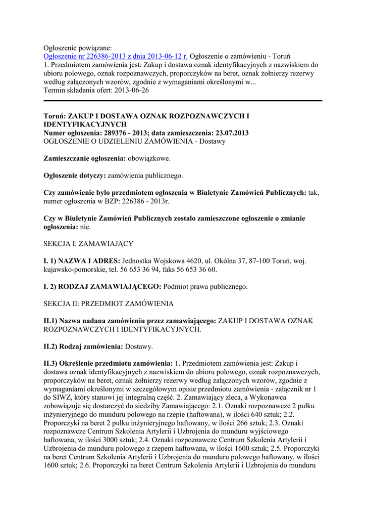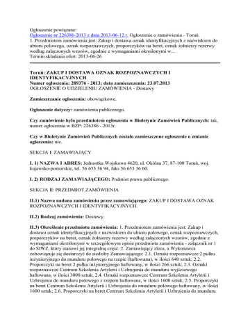 Ogłoszenie powiązane: Ogłoszenie nr 226386-2013 z dnia 2013-06-12 r. Ogłoszenie o zamówieniu - Toruń 1. Przedmiotem zamówienia jest: Zakup i dostawa oznak identyfikacyjnych z nazwiskiem do ubioru polowego, oznak rozpoznawczych, proporczyków na beret, oznak żołnierzy rezerwy według załączonych wzorów, zgodnie z wymaganiami określonymi w... Termin składania ofert: 2013-06-26 Toruń: ZAKUP I DOSTAWA OZNAK ROZPOZNAWCZYCH I IDENTYFIKACYJNYCH Numer ogłoszenia: 289376 - 2013; data zamieszczenia: 23.07.2013 OGŁOSZENIE O UDZIELENIU ZAMÓWIENIA - Dostawy Zamieszczanie ogłoszenia: obowiązkowe. Ogłoszenie dotyczy: zamówienia publicznego. Czy zamówienie było przedmiotem ogłoszenia w Biuletynie Zamówień Publicznych: tak, numer ogłoszenia w BZP: 226386 - 2013r. Czy w Biuletynie Zamówień Publicznych zostało zamieszczone ogłoszenie o zmianie ogłoszenia: nie. SEKCJA I: ZAMAWIAJĄCY I. 1) NAZWA I ADRES: Jednostka Wojskowa 4620, ul. Okólna 37, 87-100 Toruń, woj. kujawsko-pomorskie, tel. 56 653 36 94, faks 56 653 36 60. I. 2) RODZAJ ZAMAWIAJĄCEGO: Podmiot prawa publicznego. SEKCJA II: PRZEDMIOT ZAMÓWIENIA II.1) Nazwa nadana zamówieniu przez zamawiającego: ZAKUP I DOSTAWA OZNAK ROZPOZNAWCZYCH I IDENTYFIKACYJNYCH. II.2) Rodzaj zamówienia: Dostawy. II.3) Określenie przedmiotu zamówienia: 1. Przedmiotem zamówienia jest: Zakup i dostawa oznak identyfikacyjnych z nazwiskiem do ubioru polowego, oznak rozpoznawczych, proporczyków na beret, oznak żołnierzy rezerwy według załączonych wzorów, zgodnie z wymaganiami określonymi w szczegółowym opisie przedmiotu zamówienia - załącznik nr 1 do SIWZ, który stanowi jej integralną część. 2. Zamawiający zleca, a Wykonawca zobowiązuje się dostarczyć do siedziby Zamawiającego: 2.1. Oznaki rozpoznawcze 2 pułku inżynieryjnego do munduru polowego na rzepie (haftowana), w ilości 640 sztuk; 2.2. Proporczyki na beret 2 pułku inżynieryjnego haftowany, w ilości 266 sztuk; 2.3. Oznaki rozpoznawcze Centrum Szkolenia Artylerii i Uzbrojenia do munduru wyjściowego haftowana, w ilości 3000 sztuk; 2.4. Oznaki rozpoznawcze Centrum Szkolenia Artylerii i Uzbrojenia do munduru polowego z rzepem haftowana, w ilości 1600 sztuk; 2.5. Proporczyki na beret Centrum Szkolenia Artylerii i Uzbrojenia do munduru polowego haftowany, w ilości 1600 sztuk; 2.6. Proporczyki na beret Centrum Szkolenia Artylerii i Uzbrojenia do munduru wyjściowego metalowa, w ilości 800 sztuk; 2.7. Oznaki rozpoznawcze 12 Wojskowego Oddziału Gospodarczego do munduru wyjściowego haftowana, w ilości 35 sztuk; 2.8. Oznaki rozpoznawcze 12 Wojskowego Oddziału Gospodarczego do munduru polowego na rzepie haftowana, w ilości 80 sztuk; 2.9. Oznaki rozpoznawcze Żandarmerii Wojskowej w kolorze szkarłatnym haftowana, w ilości 80 sztuk; 2.10. Oznaki rozpoznawcze Żandarmerii Wojskowej w kolorze szkarłatnym na rzepie haftowana, w ilości 60 sztuk; 2.11. Oznaki rozpoznawcze Żandarmerii Wojskowej w kamuflażu pantera na rzepie (haftowana), w ilości 20 sztuk; 2.12. Oznaki identyfikacyjne żołnierza rezerwy wykonana z metalu, przedstawiająca stylizowaną literę R w okrągłym wieńcu z liści laurowych o średnicy 2,7 cm, w kolorze srebrnym (mocowanie - 3 szt. szpilka metalowa jak przy orzełku do czapki futrzanej), w ilości 1100 sztuk; 2.13. Oznaki identyfikacyjne z nazwiskiem do ubioru polowego wz. 93 na rzepie, w ilości 4200 sztuk.. II.4) Wspólny Słownik Zamówień (CPV): 35.12.16.00-4, 35.12.34.00-6. SEKCJA III: PROCEDURA III.1) TRYB UDZIELENIA ZAMÓWIENIA: Przetarg nieograniczony III.2) INFORMACJE ADMINISTRACYJNE Zamówienie dotyczy projektu/programu finansowanego ze środków Unii Europejskiej: nie SEKCJA IV: UDZIELENIE ZAMÓWIENIA Część NR: 1 Nazwa: Zakup i dostawa oznak identyfikacyjnych z nazwiskiem do ubioru polowego, oznak rozpoznawczych, proporczyków na beret IV.1) DATA UDZIELENIA ZAMÓWIENIA: 09.07.2013. IV.2) LICZBA OTRZYMANYCH OFERT: 9. IV.3) LICZBA ODRZUCONYCH OFERT: 1. IV.4) NAZWA I ADRES WYKONAWCY, KTÓREMU UDZIELONO ZAMÓWIENIA: HAKO Sp. z o.o., ul. Borzymowska 30, 03-565 Warszawa, kraj/woj. mazowieckie. IV.5) Szacunkowa wartość zamówienia (bez VAT): 58374,00 PLN. IV.6) INFORMACJA O CENIE WYBRANEJ OFERTY ORAZ O OFERTACH Z NAJNIŻSZĄ I NAJWYŻSZĄ CENĄ Cena wybranej oferty: 26372,60 Oferta z najniższą ceną: 26372,60 / Oferta z najwyższą ceną: 83838,03 Waluta: PLN. Część NR: 2 Nazwa: Zakup i dostawa proporczyków na beret, oznak żołnierzy rezerwy. IV.1) DATA UDZIELENIA ZAMÓWIENIA: 09.07.2013. IV.2) LICZBA OTRZYMANYCH OFERT: 6. IV.3) LICZBA ODRZUCONYCH OFERT: 0. IV.4) NAZWA I ADRES WYKONAWCY, KTÓREMU UDZIELONO ZAMÓWIENIA: P.P.H.U. GRYF Grzegorz GÓRSKI, ul. Taczaka 6/25, 85-799 Bydgoszcz, kraj/woj. kujawsko-pomorskie. IV.5) Szacunkowa wartość zamówienia (bez VAT): 5935,00 PLN. IV.6) INFORMACJA O CENIE WYBRANEJ OFERTY ORAZ O OFERTACH Z NAJNIŻSZĄ I NAJWYŻSZĄ CENĄ Cena wybranej oferty: 11600,00 Oferta z najniższą ceną: 11600,00 / Oferta z najwyższą ceną: 24604,00 Waluta: PLN.