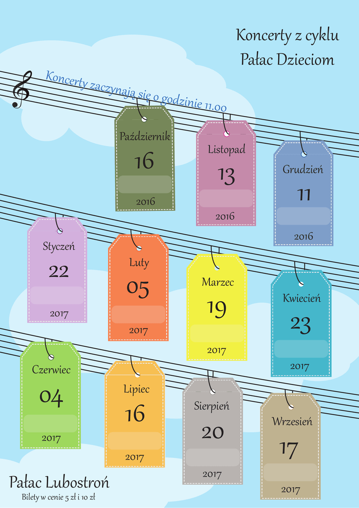 Koncer�� z cyklu Pałac Dzieciom Paździer�ik 16 2016 St�czeń 22 2017 Czer�iec 04 2017 Pałac Lubost�oń Bilet� w cenie 5 zł i 10 zł Lut� 05 2017 Lipiec 16 2017 Listopad 13 2016 Marzec 19 2017 Sier�ień 20 2017 Gr�dzień 11 2016 Kwiecień 23 2017 Wrzesień 17 2017
