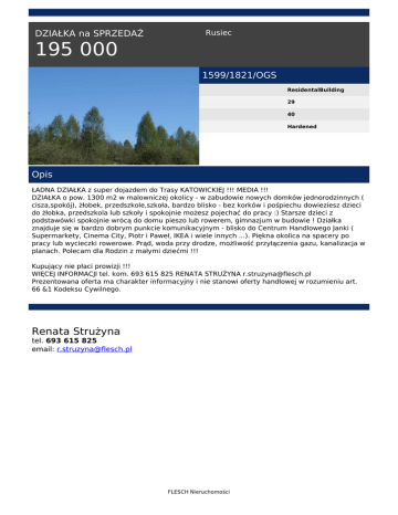 DZIAŁKA na SPRZEDAŻ Rusiec 195 000 1599/1821/OGS ResidentalBuilding 29 40 Hardened Opis ŁADNA DZIAŁKA z super dojazdem do Trasy KATOWICKIEJ !!! MEDIA !!! DZIAŁKA o pow. 1300 m2 w malowniczej okolicy - w zabudowie nowych domków jednorodzinnych ( cisza,spokój), żłobek, przedszkole,szkoła, bardzo blisko - bez korków i pośpiechu dowieziesz dzieci do żłobka, przedszkola lub szkoły i spokojnie możesz pojechać do pracy :) Starsze dzieci z podstawówki spokojnie wrócą do domu pieszo lub rowerem, gimnazjum w budowie ! Działka znajduje się w bardzo dobrym punkcie komunikacyjnym - blisko do Centrum Handlowego Janki ( Supermarkety, Cinema City, Piotr i Paweł, IKEA i wiele innych ...). Piękna okolica na spacery po pracy lub wycieczki rowerowe. Prąd, woda przy drodze, możliwość przyłączenia gazu, kanalizacja w planach. Polecam dla Rodzin z małymi dziećmi !!! Kupujący nie płaci prowizji !!! WIĘCEJ INFORMACJI tel. kom. 693 615 825 RENATA STRUŻYNA [email protected] Prezentowana oferta ma charakter informacyjny i nie stanowi oferty handlowej w rozumieniu art. 66 &1 Kodeksu Cywilnego. Renata Strużyna tel. 693 615 825 email: [email protected] FLESCH Nieruchomości Powered by TCPDF (www.tcpdf.org)