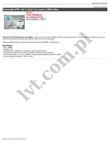 Informacje o produkcie Utworzono 08-03-2017 Przewód UTP cat 5 drut cca szary 100m Box Cena : Ceny dostępne po zalogowaniu Nr katalogowy : 2917 m .p Skrętka znajduje również zastosowanie w budowie przemysłu CCTV - monitoring etc. l Przewód UTP 5kategorii typu drut 100m - popularnie jest nazywany skrętką. Znajduje szereg zastosowań w budowie systemów teleinformatycznych, telekomunikacyjnych w zakresie domostw jak i dużych firm, sieci osiedlowych. lv t. co Specyfikacja: - kolor : szary - kategoria : 5e - przeznaczenie : podtynkowe, natynkowe, wewnątrz pomieszczeń - wewnętrzny przewodnik : drut 0,511 (24AWG) - CCA aluminium miedziowe - przeznaczenie pracy : kat 5e do 155MHz z maksymalnym przesyłem danych do 1GB/s - stosunek napięcia do prądu: 100+/-15Ohm Wygenerowano w programie www.oscGold.com