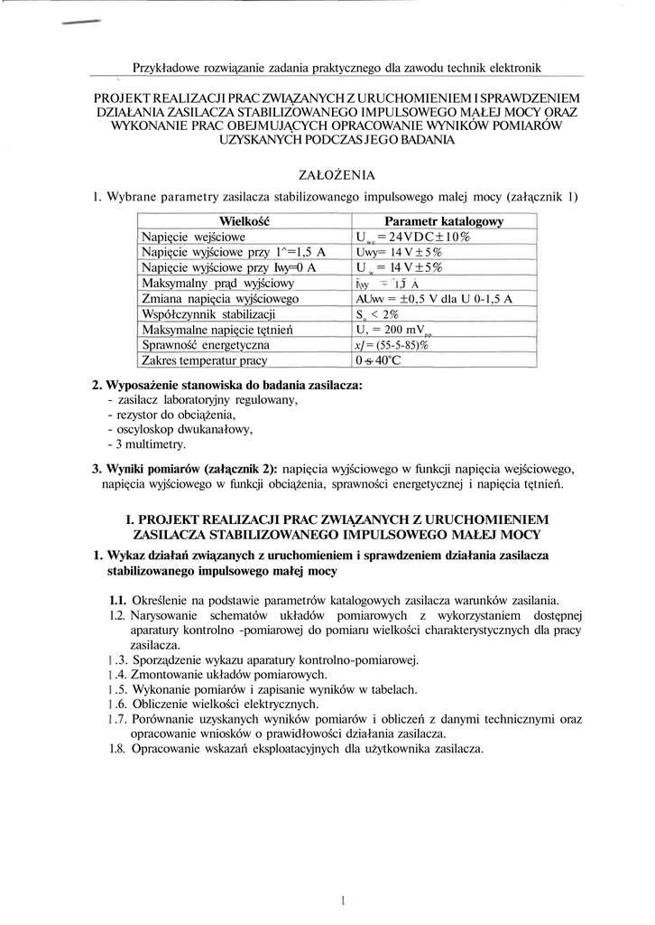 1. Wybrane parametry zasilacza stabilizowanego impulsowego malej mocy (załącznik 1)