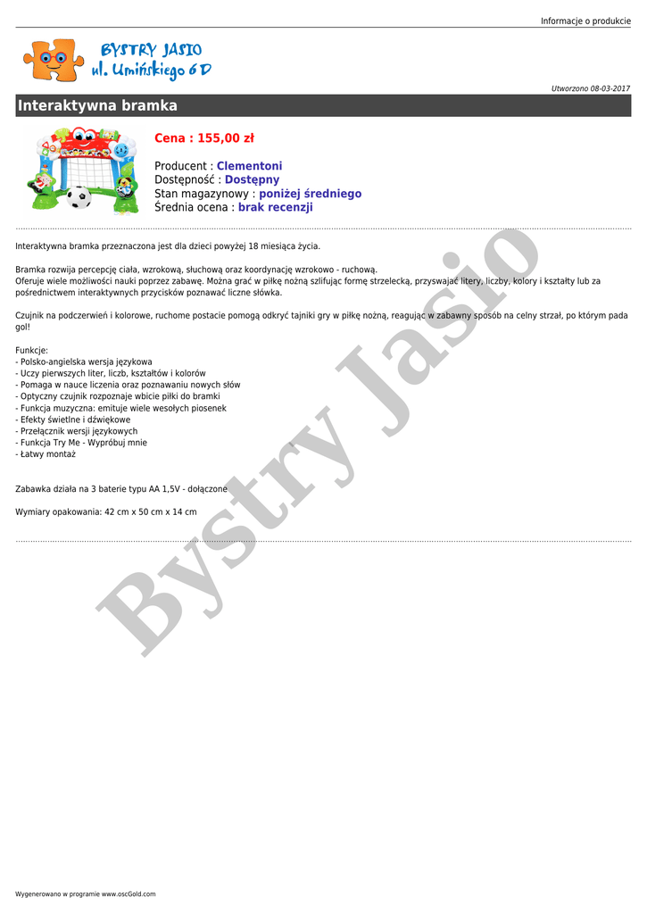 Informacje o produkcie Utworzono 08-03-2017 Interaktywna bramka Cena : 155,00 zł Producent : Clementoni Dostępność : Dostępny Stan magazynowy : poniżej średniego Średnia ocena : brak recenzji si o Interaktywna bramka przeznaczona jest dla dzieci powyżej 18 miesiąca życia. Bramka rozwija percepcję ciała, wzrokową, słuchową oraz koordynację wzrokowo - ruchową. Oferuje wiele możliwości nauki poprzez zabawę. Można grać w piłkę nożną szlifując formę strzelecką, przyswajać litery, liczby, kolory i kształty lub za pośrednictwem interaktywnych przycisków poznawać liczne słówka. tr y Funkcje: - Polsko-angielska wersja językowa - Uczy pierwszych liter, liczb, kształtów i kolorów - Pomaga w nauce liczenia oraz poznawaniu nowych słów - Optyczny czujnik rozpoznaje wbicie piłki do bramki - Funkcja muzyczna: emituje wiele wesołych piosenek - Efekty świetlne i dźwiękowe - Przełącznik wersji językowych - Funkcja Try Me - Wypróbuj mnie - Łatwy montaż Ja Czujnik na podczerwień i kolorowe, ruchome postacie pomogą odkryć tajniki gry w piłkę nożną, reagując w zabawny sposób na celny strzał, po którym pada gol! Zabawka działa na 3 baterie typu AA 1,5V - dołączone B ys Wymiary opakowania: 42 cm x 50 cm x 14 cm Wygenerowano w programie www.oscGold.com