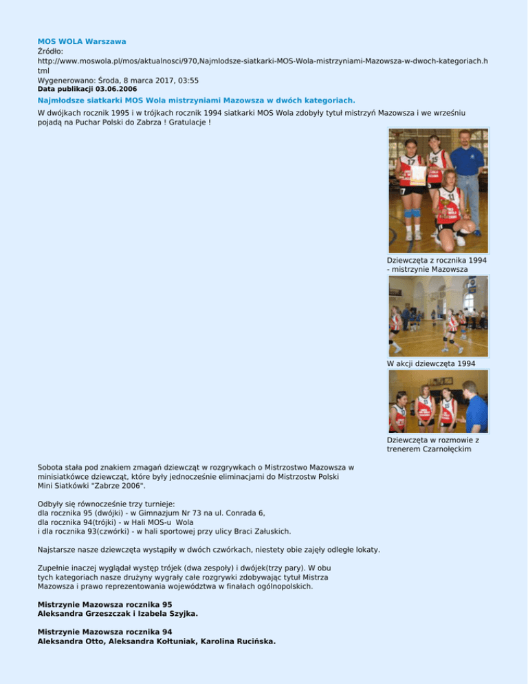 MOS WOLA Warszawa Źródło: http://www.moswola.pl/mos/aktualnosci/970,Najmlodsze-siatkarki-MOS-Wola-mistrzyniami-Mazowsza-w-dwoch-kategoriach.h tml Wygenerowano: Środa, 8 marca 2017, 03:55 Data publikacji 03.06.2006 Najmłodsze siatkarki MOS Wola mistrzyniami Mazowsza w dwóch kategoriach. W dwójkach rocznik 1995 i w trójkach rocznik 1994 siatkarki MOS Wola zdobyły tytuł mistrzyń Mazowsza i we wrześniu pojadą na Puchar Polski do Zabrza ! Gratulacje ! Dziewczęta z rocznika 1994 - mistrzynie Mazowsza W akcji dziewczęta 1994 Dziewczęta w rozmowie z trenerem Czarnołęckim Sobota stała pod znakiem zmagań dziewcząt w rozgrywkach o Mistrzostwo Mazowsza w minisiatkówce dziewcząt, które były jednocześnie eliminacjami do Mistrzostw Polski Mini Siatkówki "Zabrze 2006". Odbyły się równocześnie trzy turnieje: dla rocznika 95 (dwójki) - w Gimnazjum Nr 73 na ul. Conrada 6, dla rocznika 94(trójki) - w Hali MOS-u Wola i dla rocznika 93(czwórki) - w hali sportowej przy ulicy Braci Załuskich. Najstarsze nasze dziewczęta wystąpiły w dwóch czwórkach, niestety obie zajęły odległe lokaty. Zupełnie inaczej wyglądał występ trójek (dwa zespoły) i dwójek(trzy pary). W obu tych kategoriach nasze drużyny wygrały całe rozgrywki zdobywając tytuł Mistrza Mazowsza i prawo reprezentowania województwa w finałach ogólnopolskich. Mistrzynie Mazowsza rocznika 95 Aleksandra Grzeszczak i Izabela Szyjka. Mistrzynie Mazowsza rocznika 94 Aleksandra Otto, Aleksandra Kołtuniak, Karolina Rucińska. Gratulacje dla dziewcząt i ich trenera pana Krzysztofa Czarnołęckiego. Powodzenia na wrześniowych finałach w Zabrzu. Komentarz (0) dodaj komentarz Brak komentarzy dodaj komentarz