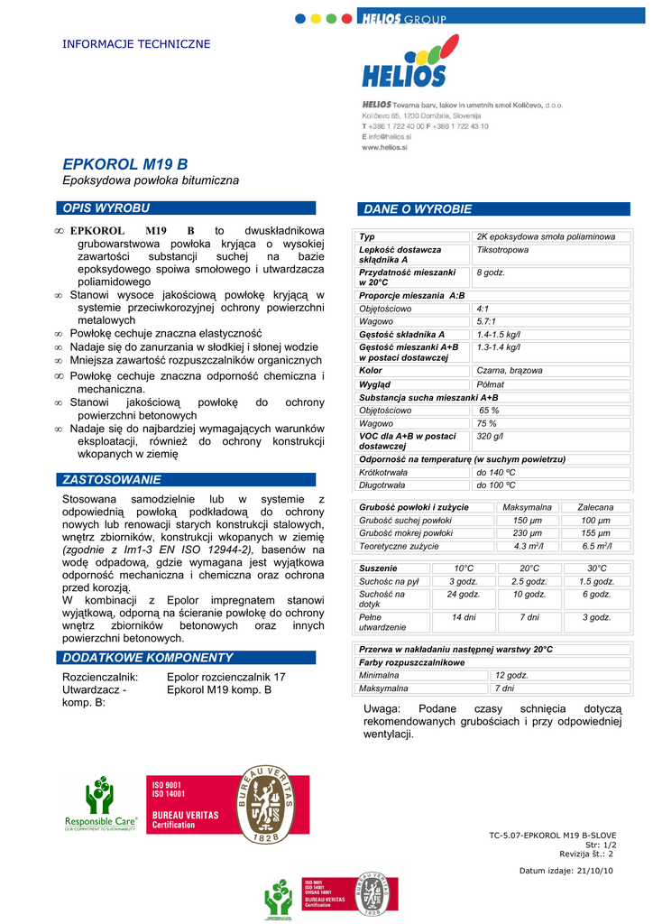 INFORMACJE TECHNICZNE EPKOROL M19 B Epoksydowa powłoka bitumiczna OPIS WYROBU DANE O WYROBIE • EPKOROL • • • • • • • M19 B to dwuskładnikowa grubowarstwowa powłoka kryjąca o wysokiej zawartości substancji suchej na bazie epoksydowego spoiwa smołowego i utwardzacza poliamidowego Stanowi wysoce jakościową powłokę kryjącą w systemie przeciwkorozyjnej ochrony powierzchni metalowych Powłokę cechuje znaczna elastyczność Nadaje się do zanurzania w słodkiej i słonej wodzie Mniejsza zawartość rozpuszczalników organicznych Powłokę cechuje znaczna odporność chemiczna i mechaniczna. Stanowi jakościową powłokę do ochrony powierzchni betonowych Nadaje się do najbardziej wymagających warunków eksploatacji, również do ochrony konstrukcji wkopanych w ziemię ZASTOSOWANIE Stosowana samodzielnie lub w systemie z odpowiednią powłoką podkładową do ochrony nowych lub renowacji starych konstrukcji stalowych, wnętrz zbiorników, konstrukcji wkopanych w ziemię (zgodnie z Im1-3 EN ISO 12944-2), basenów na wodę odpadową, gdzie wymagana jest wyjątkowa odporność mechaniczna i chemiczna oraz ochrona przed korozją. W kombinacji z Epolor impregnatem stanowi wyjątkową, odporną na ścieranie powłokę do ochrony wnętrz zbiorników betonowych oraz innych powierzchni betonowych. DODATKOWE KOMPONENTY Rozcienczalnik: Utwardzacz komp. B: Epolor rozcienczalnik 17 Epkorol M19 komp. B Typ Lepkość dostawcza skłądnika A Przydatność mieszanki w 20°C Proporcje mieszania A:B Objętościowo Wagowo Gęstość składnika A Gęstość mieszanki A+B w postaci dostawczej Kolor 2K epoksydowa smoła poliaminowa Tiksotropowa 8 godz. 4:1 5.7:1 1.4-1.5 kg/l 1.3-1.4 kg/l Czarna, brązowa Wygląd Półmat Substancja sucha mieszanki A+B Objętościowo 65 % Wagowo 75 % VOC dla A+B w postaci 320 g/l dostawczej Odporność na temperaturę (w suchym powietrzu) Krótkotrwała do 140 ºC Długotrwała do 100 ºC Grubość powłoki i zużycie Grubość suchej powłoki Grubość mokrej powłoki Teoretyczne zużycie Suszenie Suchośc na pył Suchość na dotyk Pełne utwardzenie Maksymalna 150 µm 230 µm 4.3 m2/l Zalecana 100 µm 155 µm 6.5 m2/l 10°C 3 godz. 24 godz. 20°C 2.5 godz. 10 godz. 30°C 1.5 godz. 6 godz. 14 dni 7 dni 3 godz. Przerwa w nakładaniu następnej warstwy 20°C Farby rozpuszczalnikowe Minimalna 12 godz. Maksymalna 7 dni Uwaga: Podane czasy schnięcia dotyczą rekomendowanych grubościach i przy odpowiedniej wentylacji. TC-5.07-EPKOROL M19 B-SLOVE Str: 1/2 Revizija št.: 2 Datum izdaje: 21/10/10 PRZYGOTOWANIE POWIERZCHNI SYSTEMY LAKIERNICZE Powierzchnia powinna być czysta, sucha i odtłuszczona. Powierzchnai powinna być przygotowana zgodnie z ISO 8504. Przygotowanie powierzchni do stopnia czystości Sa 2.5 zgodnie z ISO 12944-4. Chropowatośc 40-70 µm (ISO 8503-2). Systemy powłok lakierniczych dobieramy ze względu na rodzaj wpływów klimatycznych, zgodnie z zaleceniami standardu ISO12944. Zalecana powłoka podkładowa: EPOCINK AB B WARUNKI PRACY Minimalna temperatura aplikacji: +5°C. Wilgotnośc względna powietrza od 20% do 85%. Temperatura powierzchni powinna wynosić co najmniej 3ºC powyżej punktu rosy. SPOSÓB NAKŁADANIA Wyrób przed wymeiszany. użyciem musi być dokładnie do 5 % objętościowo 0.53 - 0.79 mm 12.0 - 15.0 MPa PĘDZEL/WAŁEK Rozcienczanie: PRZECHOWYWANIE 24 miesięcy w temperaturze do +35°C. BHP NATRYSK AIRLESS Rozcienczanie: Średnica dyszy: Ciśnienie robocze: Co do aplikacji innych farb podkładowych prosimy poradzić się ekspertów z HELIOS-a do 5 % objętościowo Patrz Karta Charakterystyki Substancji niebezpiecznej oraz etykieta wyrobu. UWAGI Dla każdej szarży farby wydajemy odpowiednie świadectwo jakości. Informacje techniczne są wynikiem wiedzy, opartej na pracy laboratoryjnej i doświadczeniach praktycznych. W przypadku zastosowania powłoki lakierniczej poza naszą kontrolą nie możemy przejąć odpowiedzialności i gwarantujemy tylko jakość powłoki jako takiej. Zastrzegamy sobie prawo do zmian danych bez uprzedniego zawiadomienia. System jakości jest zgodny z ISO 9001. Malowanie pędzlem zaleca się tylko do mniejszych powierzchni i lokalnych napraw. Przy aplikacji pędzlem do osiągania zalecanych grubości warstwy suchej potrzebne jest więcej nałożeń niż w przypadku aplikacji natryskiem. Procent dodanego rozcieńczalnika zależy od temperatury farby. Podana informacja odnosi się do temperatury farby 20ºC. TC-5.07-EPKOROL M19 B-SLOVE Str: 2/2 Revizija št.: 2 Datum izdaje: 21/10/10
