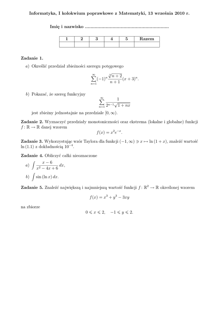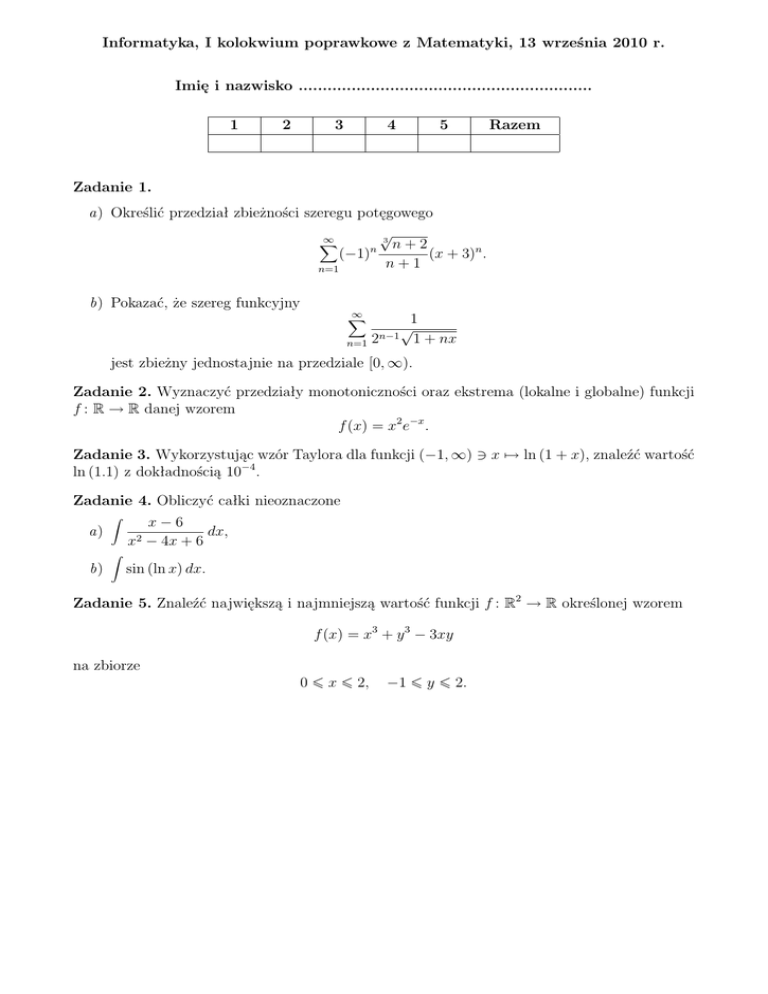 Informatyka, I kolokwium poprawkowe z Matematyki, 13 września 2010 r. Imię i nazwisko ............................................................. 1 2 3 4 5 Razem Zadanie 1. a) Określić przedział zbieżności szeregu potęgowego √ 3 ∞ X n+2 n (−1) (x + 3)n . n + 1 n=1 b) Pokazać, że szereg funkcyjny ∞ X n=1 2n−1 1 √ 1 + nx jest zbieżny jednostajnie na przedziale [0, ∞). Zadanie 2. Wyznaczyć przedziały monotoniczności oraz ekstrema (lokalne i globalne) funkcji f : R → R danej wzorem f (x) = x2 e−x . Zadanie 3. Wykorzystując wzór Taylora dla funkcji (−1, ∞) 3 x 7→ ln (1 + x), znaleźć wartość ln (1.1) z dokładnością 10−4 . Zadanie 4. Obliczyć całki nieoznaczone a) b) Z x2 Z x−6 dx, − 4x + 6 sin (ln x) dx. Zadanie 5. Znaleźć największą i najmniejszą wartość funkcji f : R2 → R określonej wzorem f (x) = x3 + y 3 − 3xy na zbiorze 0 ¬ x ¬ 2, −1 ¬ y ¬ 2.