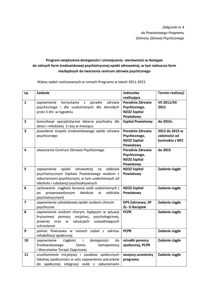 Załącznik nr 4 do Powiatowego Programu Ochrony Zdrowia Psychicznego Program zwiększenia dostępności i zmniejszenia nierówności w dostępie do różnych form środowiskowej psychiatrycznej opieki zdrowotnej, w tym zwłaszcza form niezbędnych do tworzenia centrum zdrowia psychicznego Wykaz zadań realizowanych w ramach Programu w latach 2011-2015 Lp. 1 2 3 4 5 6 7 8 9 10 11 Zadanie Jednostka realizująca zapewnienie korzystania z poradni zdrowia Poradnie Zdrowia psychicznego i dla uzależnionych dla dorosłych Psychicznego, przez 5 dni w tygodniu NZOZ Szpital Powiatowy konsultacje specjalistyczne lekarza psychiatry dla Szpital Powiatowy dzieci i młodzieży 2 razy w miesiącu powołanie zespołu środowiskowego opieki zdrowia Poradnie Zdrowia psychicznego Psychicznego, NZOZ Szpital Powiatowy utworzenie Centrum Zdrowia Psychicznego Poradnie Zdrowia Psychicznego, NZOZ Szpital Powiatowy zapewnienie opieki zdrowotnej na oddziale NZOZ Szpital psychiatrycznym Szpitala Powiatowego osobom z Powiatowy zaburzeniami psychicznymi, w tym uzależnionych od alkoholu i substancji psychoaktywnych zachowanie ciągłości leczenia osób uzależnionych ( NZOZ Szpital po przeprowadzonym detoksie w oddziale Powiatowy psychiatrycznym) zapewnienie całodobowej opieki osobom chorym DPS Zakrzewo, SP psychicznie ZL- O Raciążek zapewnienie osobom chorym, będącym w sytuacji PCPR kryzysowej pomocy socjalnej, psychologicznej, prawnej oraz w sytuacjach uzasadniających schronienie pomoc finansowa w ramach zadań z zakresu PCPR rehabilitacji społecznej zapewnienie ciągłości i dostępności do ośrodki pomocy Środowiskowego Domu Samopomocy społecznej, PCPR i Warsztatów Terapii Zajęciowej uruchomienie inicjatywy i zasobów społecznych wszyscy uczestnicy lokalnej społeczności w celu zapewnienia warunków programu do społecznej integracji osób z zaburzeniami Termin realizacji VII 2011/XII 2015 do 2015r. 2012 do 2015 w zależności od kontraktu z NFZ do 2015 Zadanie ciągłe Zadanie ciągłe Zadanie ciągłe Zadanie ciągłe Zadanie ciągłe Zadanie ciągłe Zadanie ciągłe 12 psychicznymi Zapewnienie osobom uzależnionych i ich rodzinom oraz osobom zagrożonym przemocą fizyczną i psychiczną pomocy psychologiczno - pedagogicznej, fachowych konsultacji oraz interwencji w terenie Miejskie Centrum profilaktyki Uzależnień w Aleksandrowie Kujawskim Zadanie ciągłe Wskaźnik monitorujący – przygotowany program, odsetek placówek biorących udział w programie/rok, realizacja ciągła od lipca 2011 do grudnia 2015r., sprawozdanie roczne z wykonania zadań objętych programem w roku poprzednim, jednostki realizujące składają do dnia 31 marca każdego roku Zarządowi Powiatu.