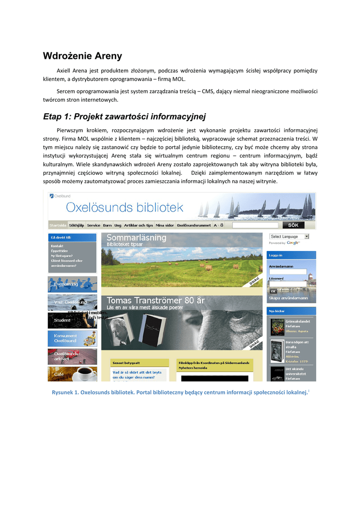 Wdrożenie Areny Axiell Arena jest produktem złożonym, podczas wdrożenia wymagającym ścisłej współpracy pomiędzy klientem, a dystrybutorem oprogramowania – firmą MOL. Sercem oprogramowania jest system zarządzania treścią – CMS, dający niemal nieograniczone możliwości twórcom stron internetowych. Etap 1: Projekt zawartości informacyjnej Pierwszym krokiem, rozpoczynającym wdrożenie jest wykonanie projektu zawartości informacyjnej strony. Firma MOL wspólnie z klientem – najczęściej biblioteką, wypracowuje schemat przeznaczenia treści. W tym miejscu należy się zastanowić czy będzie to portal jedynie biblioteczny, czy być może chcemy aby strona instytucji wykorzystującej Arenę stała się wirtualnym centrum regionu – centrum informacyjnym, bądź kulturalnym. Wiele skandynawskich wdrożeń Areny zostało zaprojektowanych tak aby witryna biblioteki była, przynajmniej częściowo witryną społeczności lokalnej. Dzięki zaimplementowanym narzędziom w łatwy sposób możemy zautomatyzować proces zamieszczania informacji lokalnych na naszej witrynie. Rysunek 1. Oxelosunds bibliotek. Portal biblioteczny będący centrum informacji społeczności lokalnej. i Etap 2: Wygląd witryny Drugim etapem, wykonywanym wspólnie przez MOL i klienta jest stworzenie tzw. layoutu oraz opracowanie graficzne strony. System Arena posiada zestaw standardowych układów elementów strony, posiada również kilka stałych zestawów graficznych gotowych od razu do użycia. Rysunek 2. Polska wersja testowa Areny z zaimplementowanym jednym z 'fabrycznych' układem oraz szatą graficzną. Istnieje oczywiście możliwość stworzenia własnego – sprofilowanego wg. potrzeb klienta układu (layoutu) menu i innych elementów strony. Podobnie w przypadku kolorystyki strony, może być ona dowolna, ograniczona jedynie wyobraźnią. Projekt układu i szaty graficznej powinien korespondować z zawartością informacyjną strony. Rysunek 3. Vesthimmerlands Biblioteker na głównej stronie udostępnia przeglądarkę nowości ii. Arena posiada wiele wbudowanych, aktywnych elementów, ale dzięki swojej elastyczności system stwarza możliwość zaprogramowania i zamieszczania zupełnie nowych elementów podwyższających atrakcyjność naszej witryny. Etap 3: Instalacja Kończąc ustalenia dotyczące wyglądu Areny, możemy przystąpić do instalacji oprogramowania i połączenia jej z bazami katalogowymi klienta. Jedną z ciekawszych cech systemu jest możliwość integracji naszego katalogu z innymi źródłami informacji. Mogą to być bazy o charakterze open access, serwisy informacyjne oraz katalogi innych bibliotek. Arenę można również połączyć z pełnotekstowymi bazami danych, warunkiem takiego podłączenia jest oczywiście posiadanie przez klienta, licencji uprawniającej do dostępu do zasobu. Pierwsze połączenia zewnętrznych zasobów wykonywane są przez firmą MOL, po serii szkoleń, kolejne integracje będą już wykonywane samodzielnie przez klienta. Etap 4: Konfiguracja Kolejnymi etapami wdrożenia systemu Arena jest konfiguracja całości i poszczególnych elementów witryny, zachowania tych elementów oraz praw dostępu do nich. W systemie mamy możliwość stworzenia wielu grup użytkowników o zróżnicowanym poziomie dostępu, dzięki temu system będzie sprofilowany zarówno na obsługę czytelników jak i pracowników, administratorów, bibliotekarzy. Etap 5: Weryfikacja Wdrażany system jest wielofunkcyjnym narzędziem, dlatego po początkowych konfiguracjach, należy uruchomić instalację w formie testowej. Testy powinny trwać kilka tygodni, a witryna prezentowana w systemie Arena może być przez ten czas uruchomiona równolegle z poprzednią stroną instytucji. Po przetestowaniu funkcjonalności, klient już samodzielnie będzie w stanie przenieść treść swojej poprzedniej strony internetowej do nowego systemu, kończąc tym samym proces wdrożenia. i ii http://www.koordinaten.se/web/arena https://www.vhbib.dk/web/arena