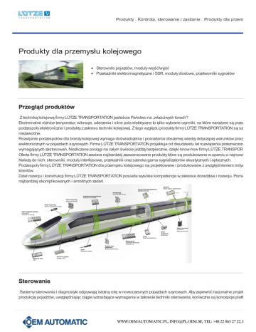 Produkty Kontrola, sterowanie i zasilanie Produkty dla przemysłu ko Produkty dla przemysłu kolejowego Sterowniki pojazdów, moduły wejść/wyjść Przekaźniki elektromagnetyczne i SSR, moduły diodowe, przetworniki sygnałów Przegląd produktów Z techniką kolejową firmy LÜTZE TRANSPORTATION jesteście Państwo na „właściwych torach”! Ekstremalne różnice temperatur, wibracje, uderzenia i silne pola elektryczne to tylko wybrane czynniki, na które narażone są przez dziesią podzespoły elektroniczne i produkty z zakresu techniki kolejowej. Z tego względu produkty firmy LÜTZE TRANSPORTATION są szczególn niezawodne. Rozwijanie podzespołów dla branży kolejowej wymaga doświadczenia i posiadania obszernej wiedzy dotyczącej warunków pracy układó elektronicznych w pojazdach szynowych. Firma LÜTZE TRANSPORTATION projektuje od dwudziestu lat rozwiązania przeznaczone do tak wymagających zastosowań. Niezliczone pociągi na całym świecie jeżdżą bezpiecznie, dzięki know-how firmy LÜTZE TRANSPORTATION Oferta firmy LÜTZE TRANSPORTATION zawiera najbardziej zaawansowane produkty które są produkowane w oparciu o najnowsze tech Należą do nich: sterowniki, moduły interfejsowe, przekaźniki oraz szeroka gama sygnalizatorów akustycznych i optycznych. Podzespoły firmy LÜTZE TRANSPORTATION dla przemysłu kolejowego są projektowane i produkowane z uwzględnieniem indywidualny klientów. Dział rozwoju i konstrukcji firmy LÜTZE TRANSPORTATION posiada wysokie kompetencje w zakresie doradztwa i rozwoju. Pomaga w re najbardziej skomplikowanych i ambitnych zadań. Sterowanie Systemy sterowania i diagnostyki odgrywają istotną rolę w nowoczesnych pojazdach szynowych. Aby zapewnić racjonalne projektowanie produkcję pojazdów, uwzględniając ciągle wzrastające wymagania w zakresie techniki sterowania, konieczne są koncepcje platform, któ WWW.OEMAUTOMATIC.PL, [email protected], TEL: +48 22 863 27 22, FAX: +4 umożliwią adaptację do indywidualnych potrzeb. Wszechstronne komponenty sterownicze firmy LÜTZE TRANSPORTATION konsekwentnie są dostosowywane do tych wymagań. W zwią dostępne są inteligentne rozwiązania specjalne, jak np. systemy sterowania lampami albo kompletne systemy sterownicze zgodne z no 50128 i optymalnym dopasowaniem poszczególnych komponentów. Przykładem takiego rozwiązania jest system DIORAILPC, który obok funkcji sterowania pojazdem zawiera także moduły wej./wyj. z możliw przyłączania sygnałów o wszystkich poziomach napięć występujących na kolei. Sterownik pojazdu DIORAILPC2 • Modułowy komputer sterujący dedykowany do pojazdów szynowych • Kompaktowy, łatwy w obsłudze i wydajny do centralnych lub zdecentralizowanych zadań sterowania • Do 4 magistrali CAN (MVB w uzgodnieniu z klientem) • System programowania IEC 61131 do aplikacji wg EN 50128 • Homologacja wg EN 50155, zakres temperatur Tx (-40 °C do +70 °C) Sterownik kompaktowy DIOLINE PLC • Elastyczna kompaktowa jednostka sterująca do pojazdów szynowych • Możliwość pracy jako sterownik do prostych pojazdów, sterownik podsystemu lub jako wydajna bramka do przetwarzania różnych, spec sygnałów z magistral • System może obsłużyć do 4 magistrali, możliwość elastycznej konfiguracji jako Ethernet, MVB (slave), złącza CANopen lub CANJ1939 • Obsługa protokołów Ethernet: EtherNet/IP i Profinet • Aplikacje IEC 61131-3 do zastosowań wg EN 50128 • Interfejs magistrali L-Bus do lokalnego podłączania modułów wej./wyj. urządzeń DIOLINE • Homologacja wg EN 50155, zakres temperatur Tx (-40 °C do +70 °C) Moduły wejść/wyjść WWW.OEMAUTOMATIC.PL, [email protected], TEL: +48 22 863 27 22, FAX: +4 DIOLINE20 • Solidny system wej./wyj. do zastosowania w pojazdach szynowych • Wszechstronny dzięki zastosowaniu wymiennego interfejsu magistrali z MVB (slave), CANopen lub wariantom Ethernet, EtherNet/IP, Pr • Cyfrowe wej./wyj. DC 24 V / DC 36 V / DC 72 V / DC 110 V • Analogowe wej./wyj. (prąd/napięcie/temperatura) • Homologacja wg. EN 50155, zakres temperatur Tx (-40 °C do +70 °C) Switche Ethernetowe DIOSWITCH IP67 • Switch Ethernetowy 10/100 Mbit/s do zastosowania w pojazdach szynowych • 8 portów • Standard przyłączy M12 • Autonegocjacja • Autokrosowanie • Homologacja wg EN 50155, zakres temperatur Tx (-40 °C do +70 °C) Interfejs Racjonalizacja projektowania i okablowania pojazdów, optymalne wykorzystanie przestrzeni montażowych to zadania, jakie spełniają inte LÜTZE TRANSPORTATION. Różne urządzenia elektryczne stosowane w pojazdach szynowych bardzo często wymagają sygnałów o określonych parametrach (niezak przetworzonych lub wzmocnionych), które pozwalają na komunikację pomiędzy sterownikiem a elementem wykonawczym. W tym celu te interfejsu została zoptymalizowana przez firmę LÜTZE TRANSPORTATION. Innowacyjne, dedykowane dla tego typu pojazdów urządzenia funkcje, które do tej pory wymagały użycia całej serii pojedynczych elementów. Pozwalają one zminimalizować wymaganą powierzchnię i projektowanie oraz okablowanie. Szeroki zakres standardowych produktów obejmuje liczne zastosowania, i jest perfekcyjnie uzupełnion indywidualne dostosowania, które są zaprojektowane zgodnie ze specyfikacją klienta. Filtry przeciwzakłóceniowe WWW.OEMAUTOMATIC.PL, [email protected], TEL: +48 22 863 27 22, FAX: +4 Filtr przeciwzakłóceniowy • Filtr przeznaczony do większości typów styczników powszechnie stosowanych w pojazdach szynowych. Rozwiązanie łatwo zintegrować tłumienia zakłóceń • Dostępne są liczne warianty do różnych typów i różnych napięć, które najczęściej mogą być montowane bezpośrednio przy styczniku, np obudowy S7A, który można instalować m.in. na stycznikach AEG typu LS4, LS7, SH4, SH8 i SH14 oraz stycznikach ABB różnych typów Moduły diodowe i rezystancyjne Moduł diodowy o szerokości 6,2 mm • Moduły diodowe firmy LÜTZE TRANSPORT