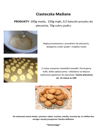 Ciasteczka Maślane PRODUKTY: 200g masła, 250g mąki, 0,5 łyżeczki proszku do pieczenia, 70g cukru pudru Mąkę przesiewamy z proszkiem do pieczenia , dodajemy cukier puder i miękkie masło Z ciasta urywamy niewielkie kawałki i formujemy kulki, lekko spłaszczamy i układamy na blaszce wyłożonej papierem do pieczenia. Ciacha pieczemy ok. 15 minut w 190' Do ciasteczek można dodać, cynamon, kakao, orzechy, wanilię, aromaty itp. Ja robiłam bez niczego i wyszły przepyszne i bardzo delikatne. ~Smacznego~