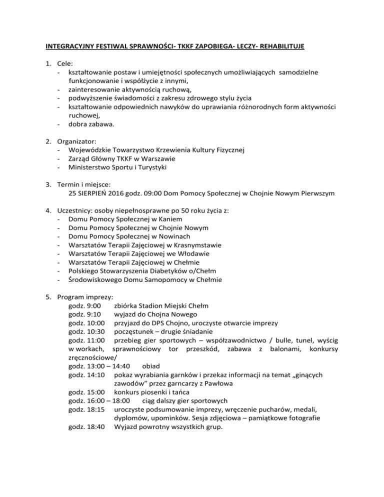 INTEGRACYJNY FESTIWAL SPRAWNOŚCI- TKKF ZAPOBIEGA- LECZY- REHABILITUJE 1. Cele: - kształtowanie postaw i umiejętności społecznych umożliwiających samodzielne funkcjonowanie i współżycie z innymi, - zainteresowanie aktywnością ruchową, - podwyższenie świadomości z zakresu zdrowego stylu życia - kształtowanie odpowiednich nawyków do uprawiania różnorodnych form aktywności ruchowej, - dobra zabawa. 2. Organizator: - Wojewódzkie Towarzystwo Krzewienia Kultury Fizycznej - Zarząd Główny TKKF w Warszawie - Ministerstwo Sportu i Turystyki 3. Termin i miejsce: 25 SIERPIEŃ 2016 godz. 09:00 Dom Pomocy Społecznej w Chojnie Nowym Pierwszym 4. Uczestnicy: osoby niepełnosprawne po 50 roku życia z: - Domu Pomocy Społecznej w Kaniem - Domu Pomocy Społecznej w Chojnie Nowym - Domu Pomocy Społecznej w Nowinach - Warsztatów Terapii Zajęciowej w Krasnymstawie - Warsztatów Terapii Zajęciowej we Włodawie - Warsztatów Terapii Zajęciowej w Chełmie - Polskiego Stowarzyszenia Diabetyków o/Chełm - Środowiskowego Domu Samopomocy w Chełmie 5. Program imprezy: godz. 9:00 zbiórka Stadion Miejski Chełm godz. 9:10 wyjazd do Chojna Nowego godz. 10:00 przyjazd do DPS Chojno, uroczyste otwarcie imprezy godz. 10:30 poczęstunek – drugie śniadanie godz. 11:00 przebieg gier sportowych – współzawodnictwo / bulle, tunel, wyścig w workach, sprawnościowy tor przeszkód, zabawa z balonami, konkursy zręcznościowe/ godz. 13:00 – 14:40 obiad godz. 14:10 pokaz wyrabiania garnków i przekaz informacji na temat „ginących zawodów” przez garncarzy z Pawłowa godz. 15:00 konkurs piosenki i tańca godz. 16:00 – 18:00 ciąg dalszy gier sportowych godz. 18:15 uroczyste podsumowanie imprezy, wręczenie pucharów, medali, dyplomów, upominków. Sesja zdjęciowa – pamiątkowe fotografie godz. 18:40 Wyjazd powrotny wszystkich grup.