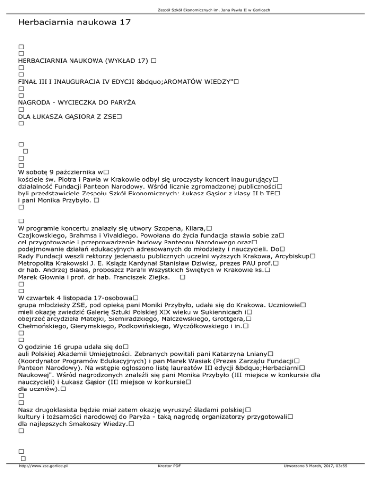 Zespół Szkół Ekonomicznych im. Jana Pawła II w Gorlicach Herbaciarnia naukowa 17 HERBACIARNIA NAUKOWA (WYKŁAD 17) FINAŁ III I INAUGURACJA IV EDYCJI „AROMATÓW WIEDZY" NAGRODA - WYCIECZKA DO PARYŻA DLA ŁUKASZA GĄSIORA Z ZSE W sobotę 9 października w kościele św. Piotra i Pawła w Krakowie odbył się uroczysty koncert inaugurujący działalność Fundacji Panteon Narodowy. Wśród licznie zgromadzonej publiczności byli przedstawiciele Zespołu Szkół Ekonomicznych: Łukasz Gąsior z klasy II b TE i pani Monika Przybyło. W programie koncertu znalazły się utwory Szopena, Kilara, Czajkowskiego, Brahmsa i Vivaldiego. Powołana do życia fundacja stawia sobie za cel przygotowanie i przeprowadzenie budowy Panteonu Narodowego oraz podejmowanie działań edukacyjnych adresowanych do młodzieży i nauczycieli. Do Rady Fundacji weszli rektorzy jedenastu publicznych uczelni wyższych Krakowa, Arcybiskup Metropolita Krakowski J. E. Ksiądz Kardynał Stanisław Dziwisz, prezes PAU prof. dr hab. Andrzej Białas, proboszcz Parafii Wszystkich Świętych w Krakowie ks. Marek Głownia i prof. dr hab. Franciszek Ziejka. W czwartek 4 listopada 17-osobowa grupa młodzieży ZSE, pod opieką pani Moniki Przybyło, udała się do Krakowa. Uczniowie mieli okazję zwiedzić Galerię Sztuki Polskiej XIX wieku w Sukiennicach i obejrzeć arcydzieła Matejki, Siemiradzkiego, Malczewskiego, Grottgera, Chełmońskiego, Gierymskiego, Podkowińskiego, Wyczółkowskiego i in. O godzinie 16 grupa udała się do auli Polskiej Akademii Umiejętności. Zebranych powitali pani Katarzyna Lniany (Koordynator Programów Edukacyjnych) i pan Marek Wasiak (Prezes Zarządu Fundacji Panteon Narodowy). Na wstępie ogłoszono listę laureatów III edycji „Herbaciarni Naukowej". Wśród nagrodzonych znaleźli się pani Monika Przybyło (III miejsce w konkursie dla nauczycieli) i Łukasz Gąsior (III miejsce w konkursie dla uczniów). Nasz drugoklasista będzie miał zatem okazję wyruszyć śladami polskiej kultury i tożsamości narodowej do Paryża - taką nagrodę organizatorzy przygotowali dla najlepszych Smakoszy Wiedzy. http://www.zse.gorlice.pl Kreator PDF Utworzono 8 March, 2017, 03:55 Zespół Szkół Ekonomicznych im. Jana Pawła II w Gorlicach Kolejnym punktem programu był znakomity występ studenta Akademii Muzycznej Jacka Kopca. Młody akordeonista zagrał dla nas suitę bułgarską Wjateslawa Semyonowa. Później przyszedł czas na wykład inaugurujący IV edycję „Aromatów Wiedzy". Wygłosił go wybitny znawca literatury Młodej Polski, autor wielu publikacji naukowych, były rektor Uniwersytetu Jagiellońskiego prof. dr hab. Franciszek Ziejka. Temat jego rozważań to „Tradycja i przyszłość Panteonu Narodowego". Profesor przybliżył historię słynnych europejskich panteonów. Na szczególną uwagę zasługują kościół Santa Croce we Florencji (tu zostali pochowani m. in. Michał Anioł, Galileusz, Niccolò Machiavelli), Westminster w Londynie (tu zostali pochowani m. in. Karol Dickens, Isaac Newton, Karol Darwin) oraz Panteon na wzgórzu św. Genowefy w Paryżu (tu zostali pochowani m. in. Wolter, Jan Jakub Rousseau, Wiktor Hugo, Emil Zola, Piotr Curie, Maria Skłodowska-Curie). Książęco-królewskie nekropolie są rozsiane po całej Polsce (Poznań, Płock, Wrocław, Trzebnica, Opole, Warszawa i in.), jednak najważniejsza z nich znajduje się w Krakowie. W podziemiach katedry wawelskiej spoczywają m. in. Jan III Sobieski, Michał Korybut Wiśniowiecki, Stefan Batory, Władysław IV Waza, Józef Poniatowski, Tadeusz Kościuszko, Józef Piłsudski, Władysław Sikorski oraz dwaj z trzech romantycznych wieszczów - o których Tadeusz Różewicz napisał: „Mickiewicz (...) po śmierci spoczął na Wawelu w nogach Słowackiego, który też tam ma grób i leżą obecnie jak różne Bogi na dwóch końcach słońca..." http://www.zse.gorlice.pl Kreator PDF Utworzono 8 March, 2017, 03:55 Zespół Szkół Ekonomicznych im. Jana Pawła II w Gorlicach Profesor snuł barwną opowieść także o tych władcach i ludziach kultury, którzy nie spoczęli na Wawelu (Wacław II, Wacław III, Ludwik Węgierski, Aleksander Jagiellończyk, Henryk II Walezy, Stanisław August Poniatowski, Fryderyk Szopen, Zygmunt Krasiński) i referował, dlaczego tak się nie stało. Drugim ważnym miejscem pochówku w Krakowie jest Krypta Zasłużonych na Skałce, gdzie znajdują się grobowce 13 wielkich Polaków m. in. Jana Długosza, Józefa Ignacego Kraszewskiego, Teofila Lenartowicza, Adama Asnyka, Henryka Siemiradzkiego, Stanisława Wyspiańskiego, Jacka Malczewskiego i Czesława Miłosza. Kilka lat temu zrodził się pomysł, by rozbudować kryptę, jednak o. Paulini wycofali swoje poparcie dla tego projektu. Panteon dla zasłużonych dla nauki, kultury powstanie więc w podziemiach kościoła św. Piotra i Pawła przy ul. Grodzkiej. Krypta Wielkich Polaków nie będzie podlegać jurysdykcji kościoła - a co za tym idzie będzie można tam pochować ateistę. Decyzję o tym, kto tam spocznie podejmie 9-osobowa kapituła, wśród jej członków będą prezydent RP, prezydent Krakowa, metropolita krakowski, rektor Uniwersytetu Jagiellońskiego. Zgodnie z planem pierwszy etap budowy Panteonu Narodowego ma się zakończyć we wrześniu 2012 roku - w 400 rocznicę śmierci ks. Piotra Skargi. Wykładowca jeszcze długo po przerwie na herbatkę odpowiadał na pytania uczniów i nauczycieli, wspominał swoje podróże po świecie, zdradził również, że wpadł na trop grobu Bolesława Śmiałego. Kolejny wykład: 2.12.2010 prof. Barbara Krauz-Mozer „Moje wymarzone Państwo" M.P Zobacz publikacja uczniów i nauczycieli. http://www.zse.gorlice.pl Kreator PDF Utworzono 8 March, 2017, 03:55