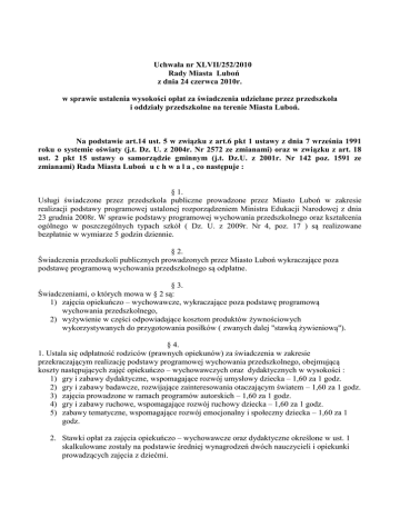 Uchwała nr XLVII/252/2010 Rady Miasta Luboń z dnia 24 czerwca 2010r. w sprawie ustalenia wysokości opłat za świadczenia udzielane przez przedszkola i oddziały przedszkolne na terenie Miasta Luboń. Na podstawie art.14 ust. 5 w związku z art.6 pkt 1 ustawy z dnia 7 września 1991 roku o systemie oświaty (j.t. Dz. U. z 2004r. Nr 2572 ze zmianami) oraz w związku z art. 18 ust. 2 pkt 15 ustawy o samorządzie gminnym (j.t. Dz.U. z 2001r. Nr 142 poz. 1591 ze zmianami) Rada Miasta Luboń u c h w a l a , co następuje : § 1. Usługi świadczone przez przedszkola publiczne prowadzone przez Miasto Luboń w zakresie realizacji podstawy programowej ustalonej rozporządzeniem Ministra Edukacji Narodowej z dnia 23 grudnia 2008r. W sprawie podstawy programowej wychowania przedszkolnego oraz kształcenia ogólnego w poszczególnych typach szkół ( Dz. U. z 2009r. Nr 4, poz. 17 ) są realizowane bezpłatnie w wymiarze 5 godzin dziennie. § 2. Świadczenia przedszkoli publicznych prowadzonych przez Miasto Luboń wykraczające poza podstawę programową wychowania przedszkolnego są odpłatne. § 3. Świadczeniami, o których mowa w § 2 są: 1) zajęcia opiekuńczo – wychowawcze, wykraczające poza podstawę programową wychowania przedszkolnego, 2) wyżywienie w części odpowiadające kosztom produktów żywnościowych wykorzystywanych do przygotowania posiłków ( zwanych dalej "stawką żywieniową"). § 4. 1. Ustala się odpłatność rodziców (prawnych opiekunów) za świadczenia w zakresie przekraczającym realizację podstawy programowej wychowania przedszkolnego, obejmującą koszty następujących zajęć opiekuńczo – wychowawczych oraz dydaktycznych w wysokości : 1) gry i zabawy dydaktyczne, wspomagające rozwój umysłowy dziecka – 1,60 za 1 godz. 2) gry i zabawy badawcze, rozwijające zainteresowania otaczającym światem – 1,60 za 1 godz. 3) zajęcia prowadzone w ramach programów autorskich – 1,60 za 1 godz. 4) gry i zabawy ruchowe, wspomagające rozwój ruchowy dziecka – 1,60 za 1 godz. 5) zabawy tematyczne, wspomagające rozwój emocjonalny i społeczny dziecka – 1,60 za 1 godz. 2. Stawki opłat za zajęcia opiekuńczo – wychowawcze oraz dydaktyczne określone w ust. 1 skalkulowane zostały na podstawie średniej wynagrodzeń dwóch nauczycieli i opiekunki prowadzących zajęcia z dziećmi. § 5. Opłaty o których mowa w § 4 ust. 1 ulegają, na wniosek rodziców (opiekunów) dziecka, obniżeniu o 25% w przypadku gdy: a) z usług przedszkola korzysta dziecko z rodziny, w której dochód na jedną osobę w rodzinie nie przekracza dochodu obowiązującego przy ustalaniu prawa do zasiłku rodzinnego. Podstawą obniżenia opłaty jest przedłożone zaświadczenia o otrzymywanym zasiłku. b) z usług przedszkola korzysta dwoje dzieci z tej samej rodziny – na drugie dziecko bez względu na wysokość dochodu w rodzinie. c) z usług przedszkola korzysta dziecko niepełnosprawne na które rodzice (opiekunowie ) otrzymują zasiłek pielęgnacyjny. § 6. 1. Wysokość stawki żywieniowej, o której mowa w § 2 pkt 2 , ustala dyrektor przedszkola w porozumieniu z organem prowadzącym , na podstawie sporządzonej kalkulacji kosztów uwzględniającej normy żywieniowe. 2. W przypadku nieobecności dziecka w przedszkolu stawka żywieniowa w miesiącu następującym po miesiącu, w którym dziecko było nieobecne podlega zmniejszeniu od drugiego dnia absencji dziecka w miesiącu poprzednim. 3. Wysokość zmniejszenia za każdy dzień nieobecności dziecka wylicza się dzieląc opłatę miesięczną, ustaloną stosownie do § 5 ust. 1 poprzez liczbę dni roboczych przedszkola w danym miesiącu. § 7. Wykonanie uchwały powierza się Burmistrzowi Miasta Luboń. § 8. Traci moc uchwała nr XXXII/167/2001 Rady Miasta Luboń z dnia 22 marca 2001r. w sprawie uchwały w sprawie opłat za korzystanie z przedszkola publicznego w Mieście Luboń. § 9. Uchwała podlega ogłoszeniu w Dzienniku Urzędowym Województwa Wielkopolskiego i wchodzi w życie z dniem 1 września 2010r. Uzasadnienie do uchwały nr XLVII/252/2010 Rady Miasta Luboń z dnia 24 czerwca 2010r. w sprawie ustalenia wysokości opłat za świadczenia udzielane przez przedszkola i oddziały przedszkolne na terenie Miasta Luboń. W myśl art.6 ustawy o systemie oświaty nauczanie i wychowanie w zakresie co najmniej podstawy programowej wychowania przedszkolnego w przedszkolach publicznych jest bezpłatne, co stanowi jedną z cech przedszkola o charakterze publicznym ( art. 6 pkt 1 ustawy ). Dodatkowo według § 10 ust. 2 pkt 1 rozporządzenia ministra edukacji narodowej z dnia 21 maja 2001r. w sprawie ramowych statutów publicznego przedszkola oraz publicznych szkół czas przeznaczony na realizację podstawy programowej wychowania przedszkolnego jest nie krótszy niż 5 godz. Przyjęte w uchwale nr XXXII/167/2001 Rady Miasta Luboń z dnia 22 marca 2001r. w § 1 określenie "opłata stała" jest niezgodne z prawem ( wyrok IV SA/wr 150/08, z dnia 5 lutego 2008r., III SA/Wr 622/07 z dnia 30 maja 2007r., IV SA/Wr 122/07 z dnia 24 września 2008r., III SA/Wr 358/08, z dnia 8 sierpnia 2006r. ,IV SA/Wr 94/06 z dnia 18 lipca 2007r.,IV SA/WR 213/07 z dnia 7 maja 2008r., III SA?Lu 167/08 z dnia 29 maja 2008r., III SA/Gd 476/08 z dnia 19 marca 2009r.) . W ustawie o systemie oświaty nie przewidziano pojęcia "opłaty stałej". Uprawnienie Rady Miasta obejmuje zatem ustalenie opłat za świadczenia prowadzonych przez gminę przedszkoli publicznych przekraczajce podstawę programową. Zgodnie z zasadą ekwiwalentności świadczeń opłatę wnosi się za konkretne świadczenia, przekraczające podstawę programową. Kompetencją rady jest więc jedynie utalenie opłat za dodatkowe świadczenia, których katalog oraz cennik określone zostały w niniejszej uchwale.