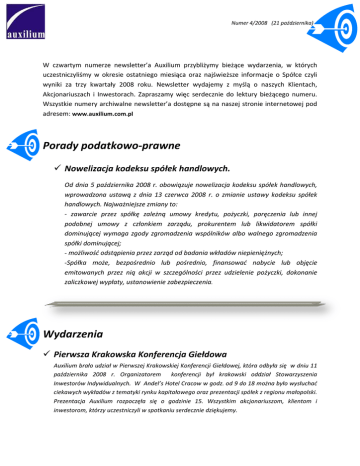 Numer 4/2008 /2008 (21 października) października W czwartym numerze newsletter’a newsle Auxilium przybliżymy przybliżymy bieżące wydarze wydarzenia, w których uczestniczyliśmy w okresie ostatniego miesiąca oraz najświeższe uczestniczyliśmy najświeższe informacje o Spółce czyli wyniki za trzy trz kwartały kwartał 2008 roku. Newsletter wydajemy z myślą o naszych Klientach, Klie Akcjonariuszach i Inwestorach Akcjonariuszach In ch. Zapraszamy apraszamy więc serdecznie do lektury bieżącego numeru. numeru Wszystkie numery archiwalne newsletter’a dostępne są na naszej stronie internetowej pod adresem www.auxilium.com.pl adresem: .auxilium.com.pl Porady podatkowo-prawne podatkowo prawne Nowelizacja Nowelizacja kodeksu spółek handlowych. Od dnia 5 października 2008 r. obowiązuje nowelizacja kodeksu spółek handlowych, wprowadzona ustawą z dnia 13 czerwca 2008 r. o zmianie ustawy kodeksu spółek handlowych. Najważniejsze zmiany to: - zawarcie przez spółkę zależną umowy kredytu, pożyczki, po poręczenia ręczenia lub innej podobnej umowy z członkiem zarządu, prokurentem lub likwidatorem spółki dominującej wymaga zgody zgromadzenia wspólników albo walnego zgromadzenia spółki dominującej; - możliwość odstąpienia przez zarząd od badania wkładów niepieniężnych niepieniężnych; -Spółka może, bezpośrednio lub pośrednio, finansować nabycie lub objęcie -Spółka emitowanych przez nią akcji w szczególności przez udzielenie pożyczki, dokonanie zaliczkowej wypłaty, ustanowienie zabezpieczenia. Wydarzenia Pierwsza Krakowska Konferencja Giełdowa Auxilium brało udział w Pierwszej Krakowskiej Konferencji Giełdowej, która odbyła się w dniu 11 października 2008 r. Organizatorem konferencji był krakowski oddział Stowarzyszenia Stowarzyszeni Inwestorów Indywidualnych. W Andel’s Hotel Hotel Cracow w godz. od 9 do 18 można było wysłuchać ciekawych wykładów z tematyki rynku kapitałowego oraz prezentacji spółek z regionu małopolski. Prezentacja Auxilium rozpoczęła się o godzinie 15. Wszystki Wszystkim akcjonariusz akcjonariuszom,, klientom klient i inwestorom, którzy uczestniczyli w spotkaniu serdecznie inwestorom, serdecznie dziękujemy. Numer 4/2008 (21 października) Auxilium wśród najlepszych MSP 17.10.2008r. w Gazecie Finansowej zostało opublikowane zestawienie 250 Najlepszych Małych i Średnich Przedsiębiorstw w Polsce. Auxilium znalazło się na 216 pozycji w tym zestawieniu oraz na 9 pozycji wśród 14 firm w zestawieniu Finanse inne wg. wielkości przychodów za I półrocze 2008 r. Udział w konkursie Gazele Biznesu i Innowacyjna Firma Czwarty kwartał obfituje w różnego rodzaju rankingi i konkursy podsumowujące mijający rok. Auxilium wysłało ankiety weryfikacyjne do dwóch istotnych konkursów. Pierwszym są Gazele Biznesu organizowane, a drugim Ranking Firm Innowacyjnych. Audyt programu Przedsiębiorstwo Fair Play 2008 W dniu 9 października Auxilium przeszło audyt przeprowadzony przez audytora zewnętrznego Instytutu Badań nad Demokracją i Przedsiębiorstwem Prywatnym. To kolejny audyt związany z Programem Przedsiębiorstwo Fair Play. Auxilium pod lupą już 4 listopada Chcąc zobaczyć co kryje się pod lupa Elektronicznego Biuletynu rynku NewConnect zapraszamy na jego łamy w dniu 4 listopada, gdzie Auxilium będzie miało prezentacje w zakładce „spółka pod lupą”. Nowe oddziały Spółki Gdyński oddział Auxilium końcem listopada będzie współorganizatorem konferencji dotyczącej zewnętrznych metod finansowania dla firm. We współudziale Gdańskiego Związku Pracodawców oraz UM Gdańsk, Gdynia, Sopot przygotowywana jest konferencja dla małych i średnich firm z Pomorza, której tematem będzie możliwość pozyskania kapitału dla rozwoju tego typu przedsiębiorstw. Oddział spółki w Łodzi wraz z Urzędem Miasta prowadzi cykl szkoleń dla przedsiębiorców z regionu w tematyce finansowo- podatkowej. Najbliższe szkolenie planowane jest na 17 listopada. W związku z dynamicznym rozwojem poszukujemy osób z regionu Wrocławia, Poznania i Katowic, gotowych do podjęcia wyzwania tworzenia i zarządzania oddziałami w tych miastach. Chcemy by kolejne nasze oddziały zlokalizowane były na terenie województw Dolnośląskiego, Wielkopolskiego i Śląska. Wygasła umowa z autoryzowanym doradcą Wymogi GPW określają, iż autoryzowany doradca przez okres jednego roku od debiutu emitenta na rynku pomaga spółce w wypełnianiu przez nią obowiązków spoczywających na emitencie papierów wartościowych. W związku z faktem, iż dnia 27 września 2008 r. minął rok od debiutu Auxilium S.A. na rynku NewConnect nasza umowa z Autoryzowanym Doradcą, którym była Kancelaria Forystek & Partnerzy Adwokaci i Radcowie Prawni z Krakowa wygasła z upływem powyższej daty. Wyniki za III kwartały 2008 roku Auxilium S.A. w okresie od 01 stycznia 2008 r. do 30 września 2008r. czyli za trzy kwartały 2008 r osiągnęło narastająco przychody ze sprzedaży w wysokości 3 791 959,21 złotych i są one wyższe o 67,9 % od przychodów ze sprzedaży narastająco w za trzy kwartały 2007 roku. Zysk operacyjny narastająco za trzy kwartały 2008 roku wyniósł 625 429,08 zł i jest on wyższy od zysku operacyjnego za trzy kwartały 2007 roku o 17%. Zysk finansowy za dziewięć miesięcy 2008 roku wynosi 51 542,72 zł i jest wyższy od zysku finansowego za analogiczny okres 2007 roku o 60,1%. Zysk netto za trzy kwartały 2008 roku wyniósł 546 147,80 złotych i jest on wyższy o 19% od zysku netto za trzy kwartały 2007 roku. Na koniec trzeciego kwartału Spółka ma podpisanych 239 umów ogółem w tym 53 umowy na prowadzenie księgowości i 186 umów na badanie sprawozdań finansowych. W okresie od 1 lipca 2008 roku do 30 września 2008 roku czyli w Numer 4/2008 /2008 (21 października) października trzecim kwartale 2008 roku przychody ze sprzedaży wyniosły 642 729,76 i były wyższe od prz
