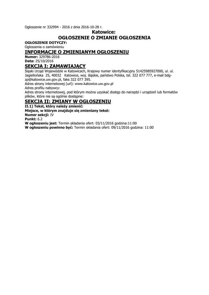 Ogłoszenie nr 332994 - 2016 z dnia 2016-10-28 r. Katowice: OGŁOSZENIE O ZMIANIE OGŁOSZENIA OGŁOSZENIE DOTYCZY: Ogłoszenia o zamówieniu INFORMACJE O ZMIENIANYM OGŁOSZENIU Numer: 329786-2016 Data: 25/10/2016 SEKCJA I: ZAMAWIAJĄCY Śląski Urząd Wojewódzki w Katowicach, Krajowy numer identyfikacyjny 51425985927000, ul. ul. Jagiellońska 25, 40032 Katowice, woj. śląskie, państwo Polska, tel. 322 077 777, e-mail [email protected], faks 322 077 395. Adres strony internetowej (url): www.katowice.uw.gov.pl Adres profilu nabywcy: Adres strony internetowej, pod którym można uzyskać dostęp do narzędzi i urządzeń lub formatów plików, które nie są ogólnie dostępne: SEKCJA II: ZMIANY W OGŁOSZENIU II.1) Tekst, który należy zmienić: Miejsce, w którym znajduje się zmieniany tekst: Numer sekcji: IV Punkt: 6.2 W ogłoszeniu jest: Termin składania ofert: 03/11/2016 godzina:11:00 W ogłoszeniu powinno być: Termin składania ofert: 09/11/2016 godzina: 11:00