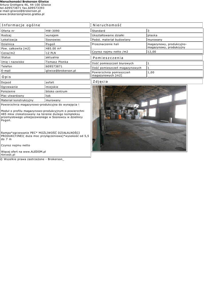Nieruchomości Brokerson Gliwice Artura Grottgera 46, 44-100 Gliwice tel.609573871 fax.609573393 e-mail:[email protected] www.brokersongliwice.gratka.pl Informacje ogólne Nieruchomość Oferta nr HW-3090 Standard 3 Rodzaj wynajem Ukształtowanie działki płaska Lokalizacja Sosnowiec Podst. materiał budowlany murowany Dzielnica Pogoń Przeznaczenie hali Pow. całkowita [m2] 485.00 m² magazynowy, produkcyjnomagazynowy, produkcyjny Cena/m2 12 PLN Czynsz najmu netto /m2 12,00 Status aktualna Pomieszczenia Imię i nazwisko Tomasz Płonka Telefon 609573871 E-mail [email protected] Opis Dojazd asfalt Ogrzewanie miejskie Położenie blisko centrum Plac utwardzany tak Materiał konstrukcyjny murowany Powierzchnia magazynowo-produkcyjna do wynajęcia ! Moduł o profilu magazynowo-produkcyjnym o powierzchni 485 mkw zlokalizowany na terenie dużego kompleksu przemysłowego umiejscowionego w Sosnowcu w dzielnicy Pogoń. Rampa*ogrzewanie PEC* MOŻLIWOŚĆ DZIAŁALNOŚCI PRODUKCYJNEJ( duża moc przyłączeniowa)*wysokość od 5,5 do 7 m Czynsz najmu netto Więcej ofert na www.ALEDOM.pl 4invest.pl © Wszelkie prawa zastrzeżone - Brokerson_ Ilość pomieszczeń biurowych 1 Ilość pomieszczeń magazynowych 1 Powierzchnia pomieszczeń magazynowych [m2] 1,00 Zdjęcia