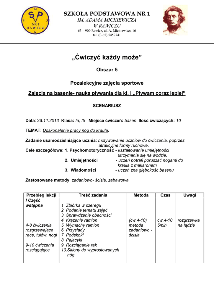 SZKOŁA PODSTAWOWA NR 1 IM. ADAMA MICKIEWICZA W RAWICZU 63 – 900 Rawicz, ul. A. Mickiewicza 16 tel. (0-65) 5452741 „Ćwiczyć każdy może” Obszar 5 Pozalekcyjne zajęcia sportowe Zajęcia na basenie- nauka pływania dla kl. I „Pływam coraz lepiej” SCENARIUSZ Data: 26.11.2013 Klasa: Ia; Ib Miejsce ćwiczeń: basen Ilość ćwiczących: 10 TEMAT: Doskonalenie pracy nóg do kraula. Zadanie usamodzielniające ucznia: motywowanie uczniów do ćwiczenia, poprzez atrakcyjne formy ruchowe. Cele szczegółowe: 1. Psychomotoryczność - kształtowanie umiejętności utrzymania się na wodzie. 2. Umiejętności - uczeń potrafi poruszać nogami do kraula z makaronem 3. Wiadomości - uczeń zna głębokość basenu Zastosowane metody: zadaniowo- ścisła, zabawowa Przebieg lekcji I Część wstępna Treść zadania 1. Zbiórka w szeregu 2. Podanie tematu zajęć 3. Sprawdzenie obecności 4. Krążenie ramion 4-8 ćwiczenia 5. Wymachy ramion rozgrzewające 6. Przysiady ręce, tułów, nogi 7. Podskoki 8. Pajacyki 9-10 ćwiczenia 9. Rozciąganie rąk rozciągające 10.Skłony do wyprostowanych nóg Metoda Czas Uwagi (ćw.4-10) metoda zadaniowo ścisła ćw.4-10 5min rozgrzewka na lądzie II Część główna ćw.1-7 cele szczegół. 1 i 2 ćw.4-8 cele szczegół.2 II Część końcowa ćw.1-2 uspakajające 1. Przemieszczenie po murku 2. Tor przeszkód przy murku 3. Wieloryb 4. Rozgrzanie nóg do kraula przy murku 5. Rozgrzanie nóg do grzbietu przy murku 6. Pływanie na samych nogach do kraula z makaronem 7. Pływanie na samych nogach do kraula z makaronem i deską 8. Skoki do wody 1.Wyławianie kółek w jacuzzi. 2.Relaks w jacuzzi. 3. Zbiórka w szeregu. 4. Ocena zajęć. 5. Pożegnanie. Michał Tomaszewski wszystkie ćw. 1-8, metoda zadaniowościsła ćw.1-5 10 min Ćw.6-7 15min zabawowa 5 min zadaniowościsła ćw.1-2 8 min 2min
