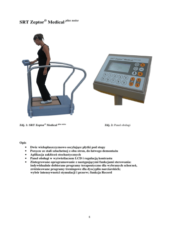 SRT Zeptor® Medical plus noise Zdj. 1: SRT Zeptor® Medical plus noise Opis • • • • • Zdj. 2: Panel obsługi Dwie wielopłaszczyznowo oscylujące płytki pod stopy Poręcze ze stali szlachetnej z obu stron, do łatwego demontaŜu Aplikacja zakłóceń stochastycznych Panel obsługi w wyświetlaczem LCD i regulacją kontrastu Zintegrowane oprogramowanie z następującymi funkcjami sterowania: indywidualnie dobierane programy terapeutyczne dla wybranych schorzeń, zróŜnicowane programy treningowe dla dyscyplin narciarskich; wybór intensywności stymulacji i przerw; funkcja Record 8 Dane techniczne Model 2 płytki pod stopy dł. x szer. (cm) Poziomy stymulacji (Level) MoŜliwa konfiguracja co 0,1 SRT Zeptor® Medical plus noise 60 x 21,5 1 – 12 Ustawianie czasu 1 sek. – 120 min. Funkcja przerw 1 sek. - 120 min. Obsługa / wyświetlacz Stałe programy, Medycyna i sport Tryb ręczny Funkcja record Wymiary dł. x szer. x wys. (cm) 135 x 75 x 125 Waga całkowita (ok.) 121 kg Udźwig maksymalny 150 kg Dane elektryczne Zasilanie Napęd Bezpiecznik główny 230 V 50/60 Hz Silnik AC 2 x 6,3 AT 9