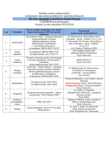 Szkolny zestaw podręczników i programów nauczania przedmiotów ogólnokształcących dla klas drugich technikum budowlanego na podbudowie gimnazjum (ważny w roku szkolnym 2013/2014) L.p. Przedmiot 1. Język polski 2. Język angielski 3. Język niemiecki 4. Wiedza o kulturze Nazwa i numer programu oraz numer dopuszczenia przez MEN do użytku szkolnego „Przeszłość to dziś” – program nauczania języka polskiego w liceum ogólnokształcącym, liceum profilowanym i technikum; wyd. Stentor Warszawa nr programu: DKOS-4015-143/02 Nr programu: DKOS-5002-47/03 Nr dopuszczenia: 331/2/2011/z1 Program nauczania języka niemieckiego w liceum ogólnokszt., liceum profil. i technikum. Numer dopuszczenia: 459/1/2012 „Człowiek – twórca kultury” – program nauczania wiedzy o kulturze kulturze liceum ogólnokształcącym, liceum profilowanym i technikum. nr programu: DKOS-5002-76/03 5. Matematyka Nr dopuszczenia: 378/1/2011 Nr dopuszczenia: 508/1/2012 6. Geografia „Program nauczania geografii – zakres rozszerzony” Wyd. Szkolne PWN 7. Podstawy przedsiębiorczości MEN: 467/2012 8. Religia Numer programu: AZ-4-01/10 (z dnia: 09.06.2010r.) Podręcznik (autor, tytuł, wydawnictwo) K. Mrowcewicz „Przeszłość to dziś. Literatura – język – kultura” kl. I, cz. II; A. Nawarecki, D. Siwicka „Przeszłość to dziś. Literatura – język – kultura” kl. II, cz.I wyd. Stentor, Warszawa 2002 John Hughes, Beata Polit „Matura Explorer Elementary” Wyd. Nowa Era „WELTTOUR 1”, Wyd. Nowa Era Z. Majchrowski, K. Mrowcewicz, P. Sitarski, D. Szwarcman „Człowiek – twórca kultury” wyd. Stentor Wojciech Babiański, Lech Chańko, Dorota Ponczek Pierwsza opcja: Seria: „MATeMAtyka” Druga opcja: Seria: „Prosto do matury”; Wyd. Nowa Era P. Czubla, E. Papieska „Geografia dla maturzysty – geografia fizyczna świata” Wyd. PWN Zbigniew Makieła, Tomasz Rachwał „Krok w przedsiębiorczość” Wyd. Nowa Era ks. prof. J. Szpet, D. Jackowiak „Moje miejsce w Kościele” Wyd. Księgarnia Św. Wojciecha