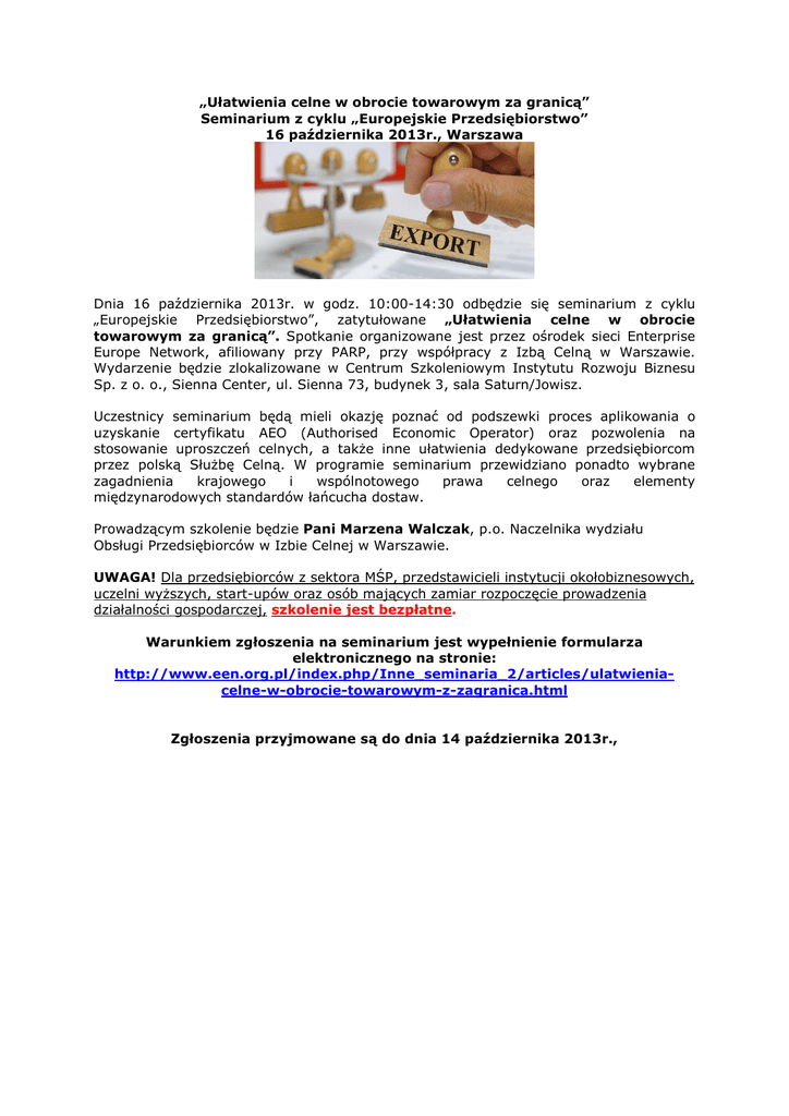 „Ułatwienia celne w obrocie towarowym za granicą” Seminarium z cyklu „Europejskie Przedsiębiorstwo” 16 października 2013r., Warszawa Dnia 16 października 2013r. w godz. 10:00-14:30 odbędzie się seminarium z cyklu „Europejskie Przedsiębiorstwo”, zatytułowane „Ułatwienia celne w obrocie towarowym za granicą”. Spotkanie organizowane jest przez ośrodek sieci Enterprise Europe Network, afiliowany przy PARP, przy współpracy z Izbą Celną w Warszawie. Wydarzenie będzie zlokalizowane w Centrum Szkoleniowym Instytutu Rozwoju Biznesu Sp. z o. o., Sienna Center, ul. Sienna 73, budynek 3, sala Saturn/Jowisz. Uczestnicy seminarium będą mieli okazję poznać od podszewki proces aplikowania o uzyskanie certyfikatu AEO (Authorised Economic Operator) oraz pozwolenia na stosowanie uproszczeń celnych, a także inne ułatwienia dedykowane przedsiębiorcom przez polską Służbę Celną. W programie seminarium przewidziano ponadto wybrane zagadnienia krajowego i wspólnotowego prawa celnego oraz elementy międzynarodowych standardów łańcucha dostaw. Prowadzącym szkolenie będzie Pani Marzena Walczak, p.o. Naczelnika wydziału Obsługi Przedsiębiorców w Izbie Celnej w Warszawie. UWAGA! Dla przedsiębiorców z sektora MŚP, przedstawicieli instytucji okołobiznesowych, uczelni wyższych, start-upów oraz osób mających zamiar rozpoczęcie prowadzenia działalności gospodarczej, szkolenie jest bezpłatne. Warunkiem zgłoszenia na seminarium jest wypełnienie formularza elektronicznego na stronie: http://www.een.org.pl/index.php/Inne_seminaria_2/articles/ulatwieniacelne-w-obrocie-towarowym-z-zagranica.html Zgłoszenia przyjmowane są do dnia 14 października 2013r.,
