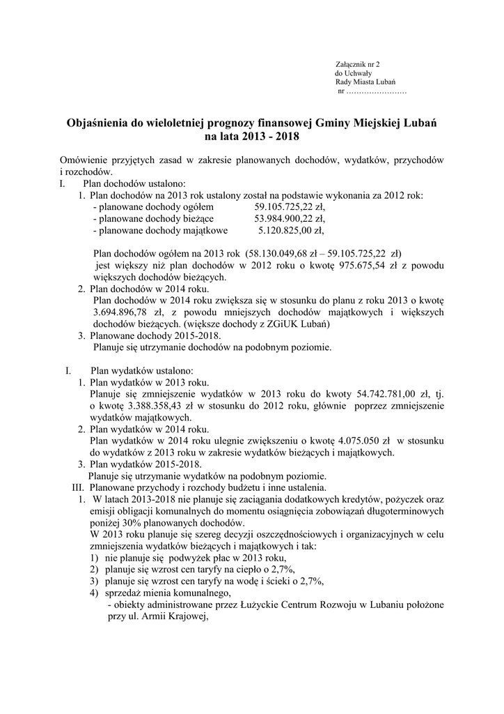 Załącznik nr 2 do Uchwały Rady Miasta Lubań nr …………………… Objaśnienia do wieloletniej prognozy finansowej Gminy Miejskiej Lubań na lata 2013 - 2018 Omówienie przyjętych zasad w zakresie planowanych dochodów, wydatków, przychodów i rozchodów. I. Plan dochodów ustalono: 1. Plan dochodów na 2013 rok ustalony został na podstawie wykonania za 2012 rok: - planowane dochody ogółem 59.105.725,22 zł, - planowane dochody bieżące 53.984.900,22 zł, - planowane dochody majątkowe 5.120.825,00 zł, Plan dochodów ogółem na 2013 rok (58.130.049,68 zł – 59.105.725,22 zł) jest większy niż plan dochodów w 2012 roku o kwotę 975.675,54 zł z powodu większych dochodów bieżących. 2. Plan dochodów w 2014 roku. Plan dochodów w 2014 roku zwiększa się w stosunku do planu z roku 2013 o kwotę 3.694.896,78 zł, z powodu mniejszych dochodów majątkowych i większych dochodów bieżących. (większe dochody z ZGiUK Lubań) 3. Planowane dochody 2015-2018. Planuje się utrzymanie dochodów na podobnym poziomie. I. Plan wydatków ustalono: 1. Plan wydatków w 2013 roku. Planuje się zmniejszenie wydatków w 2013 roku do kwoty 54.742.781,00 zł, tj. o kwotę 3.388.358,43 zł w stosunku do 2012 roku, głównie poprzez zmniejszenie wydatków majątkowych. 2. Plan wydatków w 2014 roku. Plan wydatków w 2014 roku ulegnie zwiększeniu o kwotę 4.075.050 zł w stosunku do wydatków z 2013 roku w zakresie wydatków bieżących i majątkowych. 3. Plan wydatków 2015-2018. Planuje się utrzymanie wydatków na podobnym poziomie. III. Planowane przychody i rozchody budżetu i inne ustalenia. 1. W latach 2013-2018 nie planuje się zaciągania dodatkowych kredytów, pożyczek oraz emisji obligacji komunalnych do momentu osiągnięcia zobowiązań długoterminowych poniżej 30% planowanych dochodów. W 2013 roku planuje się szereg decyzji oszczędnościowych i organizacyjnych w celu zmniejszenia wydatków bieżących i majątkowych i tak: 1) nie planuje się podwyżek płac w 2013 roku, 2) planuje się wzrost cen taryfy na ciepło o 2,7%, 3) planuje się wzrost cen taryfy na wodę i ścieki o 2,7%, 4) sprzedaż mienia komunalnego, - obiekty administrowane przez Łużyckie Centrum Rozwoju w Lubaniu położone przy ul. Armii Krajowej, 5) Planuje się skutecznie usprawnić działalność AMK w Lubaniu, w zakresie windykacji należności, jakości wykonywanych robót budowlanych na administrowanych obiektach oraz na nowo dokonać oceny stanu zatrudnienia. 6) Skutecznie poprawić działalność Urzędu Miasta Lubań w zakresie gospodarności szeroko pojętym zakresie zarządzania kadrami. 7) Podjąć działania połączenia wszystkich jednostek kultury (tj. Muzeum, Biblioteka, Miejski Dom Kultury) w jeden organizm publiczny. 8) Poprawić jakość przygotowywanych materiałów dotyczących inwestycji, tak aby nie było ciągłego wnioskowania o dodatkowe roboty w tym zakresie. W związku z tym, należy powołać zespół weryfikujący, który na etapie przygotowania inwestycji zweryfikuje sporządzony kosztorys robót i ich wycenę, a Radca Prawny zweryfikuje umowę do SIWZ. 9) Planu się skutecznie poprawić weryfikację wniosków składanych do pomocy społecznej dotyczących przyznania dodatków mieszkaniowych, zasiłków stałych, pomocy jednorazowej. Z uwzględnieniem bliskości położenia granic oraz sygnałów informujących, że większość osób pracuje w Niemczech i Czechach. Należy dokładnie zbadać sytuacje majątkową osób umieszczonych przez MOPS w Domach Pomocy Społecznej i Ośrodkach Opiekuńczo RehabilitacyjnychOpiekuńczych, w zakresie alimentacji członków rodzin (dzieci, rodziców) i opieki osób trzecich np. oddane mieszkanie w zamian za sprawowanie opieki. 10) Planuje się skutecznie zweryfikować działalność stołówek szkolnych, ich wydatków w ramach jednostki budżetowej ośrodka wsparcia, należy przeanalizować możliwość wprowadzenia firmy cateringowej, co spowodowałoby uzyskanie oszczędności. 11) Proponuje się powołać zespół szkół położonych przy ulicy Mickiewicza 1 (SP-1 i Gimnazjum Nr 2), w celu pozyskania oszczędności z zakresu zatrudnienia (dyrektor, księgowy). 12) Planuje się bezwzględnie przestrzegać zawartych umów dotyczących dotacji dla przedszkoli niepublicznych tj.: - dla Przedszkola nr 1, limit dotacji dla 125 dzieci, - dla Przedszkola Pani Trendewicz limit dotacji dla 100 dzieci. 13) Planuje się ograniczyć przynależność Gminy Miejskiej Lubań do dwóch organizacji tj. do Związku Gmin Kwisa i Związku Miast Polskich z pozostałych należy zrezygnować, to spowoduje powstanie kolejnych oszczędności. 14) Dokonać co roku w miesiącu XI przeglądów zasobów mieszkaniowych, pod względem zabezpieczenia przed zimą tj. instalacji elektrycznych, cieknących kranów, powybijanych szyb okien mieszczących się w piwnicach, klatkach schodowych, strychach, naprawa uszkodzonych drzwi, okien, w celu zapobiegania dalszych strat. 15) Wprowadzenie bezpośrednich umów między mieszkańcami a LPWIK Lubań w zakresie dostaw wody i odbioru ścieków, istnieje taka możliwość prawna (wiele gmin takie rozwiązanie wprowadziło na swoim terenie działania). 16) Aktywna pomoc przy odbudowie „IMKI” po tragicznym pożarze 17) Działania promocyjne powinny być nakierowane na pozyskanie inwestora, w celu stworzenia około 200 nowych miejsc pracy. 2. Rozchody budżetu. W 2013 roku planuje się spłatę kredytów, pożyczek i obligacji komunalnych na kwotę 3.962.606,00 zł. W latach 2014 -2018 planuje się zgodnie z zawartymi umowami spłaty kredytów, pożyczek i obligacji komunalnych. 3. Planowane na koniec roku następnego wydatki bieżące nie są większe niż planowane dochody bieżące, co spełnia wymogi art. 242 ustawy o finansach publicznych. 4. Planowanie dochodów budżetu jest realne, a wydatki budżetu wystarczające do realizacji najważniejszych zadań zaplanowanych w 2013 i w latach 2014-2018. 5. Zwiększono