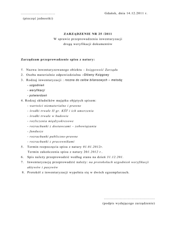 ............................... Gdańs k, dnia 14.12.2011 r. (pieczęć j ednost ki) ZARZĄDZENIE NR 25 /2011 W sprawie pr zeprowadzenia inwentar yzacj i drogą wer yfi kacj i dokumentów Zarządzam przeprow adzenie spisu z nat ury: 1. Nazwa inwentar yzowanego obiektu – księgowość Zarz ądu 2. Osoba materialnie odpowiedzialna –Główny Księgowy 3. Rodzaj inwentaryzacj i : roczna do celów bilansowych – metodą: - uzgodnień - weryfikacji - potwierdzeń 4. Rodzaj składni ków maj ątku obj ętych s pisem: - wartości niematerialne i prawne - środki trwałe II gr . KŚT i ich umorzenia - środki trwałe w budowie - rozliczenia międzyokresowe - rozrachunki z dostawcami – zobowiązania - fundusze - rozrachunki publiczno-prawne - rozrachunki z pracownikami 5. Ter min rozpoczęci a spisu z natur y 01.01.2012r. Termin zakończenia spisu z natur y 201.2012 r.. 6. Spis należy pr zeprowadzić według stanu na dzień 31.12.201. 7. Inwentar yzacj ę przepr owadzić należy: na pr otokołach uzgodnień weryfikacji aktywów i pasywów 8. Protokół z inwentar yzacj i wypełnia się w dwóch egzemplarzach. .............................................. (podpis wydaj ącego zarządzenie)