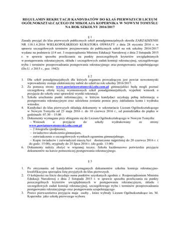 REGULAMIN REKRUTACJI KANDYDATÓW DO KLAS PIERWSZYCH LICEUM OGÓLNOKSZTAŁCĄCEGO IM MIKOŁAJA KOPERNIKA W NOWYM TOMYŚLU NA ROK SZKOLNY 2016/2017 §1 Zasady przyjęć do klas pierwszych publicznych szkół ponadgimnazjalnych określa ZARZĄDZENIE NR 110.1.4.2016 WIELKOPOLSKIEGO KURATORA OŚWIATY z dnia 28 stycznia 2016 r. w sprawie szczegółowych terminów przyjmowania do publicznych szkół na rok szkolny 2016/2017 wydane na podstawie §14 ust. 3 rozporządzenia Ministra Edukacji Narodowej z dnia 2 listopada 2015 r. w sprawie sposobu przeliczania na punkty poszczególnych kryteriów uwzględnianych w postępowaniu rekrutacyjnym, składu i szczegółowych zadań komisji rekrutacyjnej, szczegółowego trybu i terminów przeprowadzania postępowania rekrutacyjnego oraz postępowania uzupełniającego (Dz.U. z 2015 r., poz. 1942) 1. 2. 3. 4. 5. 6. §2 Dla szkół ponadgimazjalnych dla których organem prowadzącym jest powiat nowotomyski wprowadzony zostaje elektroniczny nabór do szkół na rok szkolny 2016/2017. Za pomocą strony www.powiatnowotomyski.edu.com.pl gimnazjaliści będą mogli poznać szczegółową ofertę wyżej wymienionych szkół ponadgimnazjalnych, wypełnić wniosek o przyjęcie do szkoły oraz sprawdzić wyniki rekrutacji. Szkoła uruchamia punkt informacyjny, w którym kandydaci uzyskają pełną informację o postępowaniu rekrutacyjnym oraz udzielona zostanie pomoc przy zakładaniu konta i wydruku wniosku. Kandydaci do klas pierwszych składają dokumenty w sekretariacie Liceum Ogólnokształcącego w Nowym Tomyślu od 23 maja 2016 r. do 10 czerwca 2016 r., od poniedziałku do piątku w godzinach: 07.30 – 15.00 Dokumenty wymagane przy ubieganiu się do Liceum Ogólnokształcącego w Nowym Tomyślu: Wniosek o przyjęcie do szkoły wydrukowany ze strony www.powiatnowotomyski.edu.com.pl 2 fotografie (podpisane), świadectwo ukończenia gimnazjum, zaświadczenie o szczegółowych wynikach egzaminu gimnazjalnego. Kopie świadectw i zaświadczeń muszą być dostarczone najpóźniej do 28 czerwca 2016 r. ( do godz. 15:00), oryginały do 25 lipca 2016 r. (do godz. 13:00) Dokumenty należy złożyć w wiązanej teczce. Szkoła każdorazowo potwierdza przyjęcie dokumentów na karcie pomocniczej postępowania rekrutacyjnego. §3 1. 2. 3. Po otrzymaniu od kandydatów wymaganych dokumentów szkolna komisja rekrutacyjnokwalifikacyjna sporządza listę przyjętych do klas pierwszych. O kolejności na liście decyduje suma punktów uzyskanych zgodnie z Rozporządzeniem Ministra Edukacji Narodowej z dnia 2 listopada 2015 r. w sprawie sposobu przeliczania na punkty poszczególnych kryteriów uwzględnianych w postępowaniu rekrutacyjnym, składu i szczegółowych zadań komisji rekrutacyjnej, szczegółowego trybu i terminów przeprowadzania postępowania rekrutacyjnego oraz postępowania uzupełniającego Prawo pierwszeństwa przyjęcia maja osoby , które wybrały Liceum Ogólnokształcące im. M. Kopernika jako szkołę pierwszego wyboru TERMINY POSTĘPOWANIA REKRUTACYJNEGO ORAZ POSTĘPOWANIA UZUPEŁNIAJĄCEGO, A TAKŻE TERMINY SKŁADANIA DOKUMENTÓW DO KLAS PIERWSZYCH SZKÓŁ PONADGIMNAZJALNYCH ROZPOCZYNAJĄCYCH NAUKĘ WE WRZEŚNIU Lp. Rodzaj czynności 1. Złożenie wniosku o przyjęcie do szkoły ponadgimnazjalnej wraz z dokumentami potwierdzającymi spełnianie przez kandydata warunków lub kryteriów branych pod uwagę w postępowaniu rekrutacyjnym 2. Przeprowadzenie prób sprawności fizycznej 3. Przeprowadzenie sprawdzianu kompetencji językowych 4. Podanie do publicznej wiadomości przez komisję rekrutacyjną listy kandydatów, którzy uzyskali pozytywne wyniki prób sprawności fizycznej lub pozytywny wynik sprawdzianu kompetencji językowych Uzupełnienie wniosku o przyjęcie do szkoły ponadgimnazjalnej o świadectwo ukończenia gimnazjum oraz o zaświadczenie o wynikach egzaminu gimnazjalnego Weryfikacja przez komisję rekrutacyjną wniosków o przyjęcie do szkoły ponadgimnazjalnej i dokumentów potwierdzających spełnianie przez kandydata warunków lub kryteriów branych pod uwagę w postępowaniu rekrutacyjnym, w tym dokonanie przez przewodniczącego komisji rekrutacyjnej czynności, o których mowa w art. 20t ust. 7 ustawy 5. 6. Termin w postępowaniu rekrutacyjnym od 23 maja 2016 r. do 10 czerwca 2016 r. od 4 maja 2016 r. do 18 maja 2016 r. do szkół ponadgimnazjalnych przeprowadzających próby sprawności fizycznej lub sprawdzian kompetencji językowych, sprawdzian uzdolnień kierunkowych Termin w postępowaniu rekrutacyjnym uzupełniającym od 27 lipca 2016 r. do 1 sierpnia 2016 r. od 20 maja 2016 r. do 31 maja 2016 r. 2 sierpnia 2016 r. do 3 czerwca 2016 r. 3 sierpnia 2016 r. od 24 czerwca 2016 r. do 28 czerwca 2016 r. nie dotyczy do 1 lipca 2016 r. do 4 sierpnia 2016 r. 7. 8. 9. Podanie do publicznej wiadomości przez komisję rekrutacyjną listy kandydatów zakwalifikowanych i kandydatów niezakwalifikowanych Wydanie przez szkołę prowadzącą kształcenie zawodowe skierowania na badanie lekarskie kandydatowi z listy kandydatów zakwalifikowanych, w przypadku złożenia przez kandydata oświadczenia o wyborze tej szkoły Potwierdzenie przez rodzica kandydata albo kandydata pełnoletniego woli przyjęcia w postaci przedłożenia oryginału świadectwa ukończenia gimnazjum i oryginału zaświadczenia o wynikach egzaminu gimnazjalnego (o ile nie zostały one do 22 sierpnia 2016 r. do 18 lipca 2016 r. (jeden dzień po rozpatrzeniu odwołania od rozstrzygnięcia komisji rekrutacyjnej; termin wynika z art. 20zc ustawy o systemie oświaty) do 20 lipca 2016 r. do 24 sierpnia 2016 r. do 25 lipca 2016 r. do 25 sierpnia 2016 r. do 26 lipca 2016 r. do 26 sierpnia 2016 r. do 26 lipca 2016 r. do 26 sierpnia 2016 r. złożone w uzupełnieniu wniosku o przyjęcie do szkoły ponadgimnazjalnej), 10. 11. a w przypadku szkoły prowadzącej kształcenie zawodowe - także zaświadczenia lekarskiego zawierającego orzeczenie o braku przeciwskazań zdrowotnych do podję