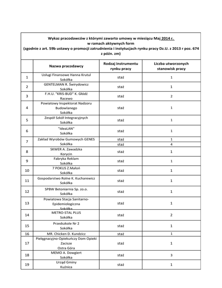 Wykaz pracodawców z którymi zawarto umowy w miesiącu Maj 2014 r. w ramach aktywnych form (zgodnie z art. 59b ustawy o promocji zatrudnienia i instytucjach rynku pracy Dz.U. z 2013 r poz. 674 z późn. zm) Nazwa pracodawcy 1 2 3 4 5 6 7 8 9 10 Usługi Finansowe Hanna Krutul Sokółka GENTELMAN R. Świrydowicz Sokółka F.H.U. "KRIS-BUD" K. Głódź Racewo Powiatowy Inspektorat Nadzoru Budowlanego Sokółka Zespół Szkół Integracyjnych Sokółka "IdeaLAN" Sokółka Zakład Wyrobów Gumowych GENES Sokółka SKWER A. Zawadzka Korycin Fabryka Reklam Sokółka 7 POKUS Z.Małoń Sokółka Rodzaj instrumentu rynku pracy Liczba utworzonych stanowisk pracy staż 1 staż 1 staż 2 staż 1 staż 1 staż 1 staż staż 1 4 staż 1 staż 1 staż 1 11 Gospodarstwo Rolne K. Kucharewicz Sokółka staż 1 12 SPBW Betoniarnia Sp. zo.o. Sokółka staż 1 staż 1 staż 2 staż 1 staż 1 staż 1 staż 3 staż 1 13 14 15 16 17 18 19 Powiatowa Stacja SanitarnoEpidemiologiczna Sokółka METRO-STAL PLUS Sokółka Przedszkole Nr 2 Sokółka MR. Chicken D. Kundzicz Pielęgnacyjno-Opiekuńczy Dom Opieki Zacisze Ostra Góra MEMO A. Dowgiert Sokółka Urząd Gminy Kuźnica 20 21 22 23 Sklep Spożywczo-Przemysłowy Pijalnia Piwa Nowowola P.H.U. L.S. L. Skibicki Janów Artykuły Przemysłowe Sokółka Jaskółka Sp.zo.o. Sokółka staż 1 staż 1 staż 1 staż 2 24 Zakład Meblowy W. Pezowicz Sokółka staż 1 25 Urząd Gminy Szudziałowo staż staż roboty publiczne 1 1 1 staż 1 staż 1 staż 1 staż 1 staż 1 staż 1 staż 1 staż 1 staż prace interwencyjne prace interwencyjne 1 1 1 prace interwencyjne 1 prace interwencyjne 1 prace interwencyjne 1 prace interwencyjne 1 roboty publiczne 3 roboty publiczne 1 26 27 28 29 30 31 32 33 34 35 36 37 38 39 40 Zakład Gospodarki Komunalnej Szudziałowo Gospodarstwo Rolne P. Borewicz Zubrzyca Mała Zakład Stolarski A. Kunda Sokółka Szkoła Podstawowa Nr 1 Sokółka DARK Skup złomu metali kolorowych i surowców wtórnych Wierzchlesie Przychodnia Weterynaryjna MEDICUS Sokółka Urząd Gminy Sidra "TransDecor" Sokółka Komenda Powiatowa Policji Sokółka Zespół Szkół Samorządowych Janów Urząd Gminy Janów Starostwo Powiatowe Sokółka Gminny Ośrodek Pomocy Społecznej Szudziałowo Urząd Gminy Sidra Urząd Gminy Korycin Sporz. Maciej Rudź