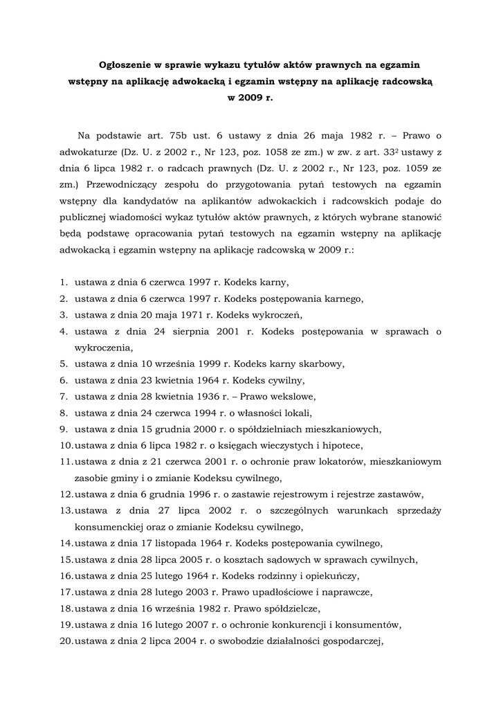 Ogłoszenie w sprawie wykazu tytułów aktów prawnych na egzamin wstępny na aplikację adwokacką i egzamin wstępny na aplikację radcowską w 2009 r. Na podstawie art. 75b ust. 6 ustawy z dnia 26 maja 1982 r. – Prawo o adwokaturze (Dz. U. z 2002 r., Nr 123, poz. 1058 ze zm.) w zw. z art. 332 ustawy z dnia 6 lipca 1982 r. o radcach prawnych (Dz. U. z 2002 r., Nr 123, poz. 1059 ze zm.) Przewodniczący zespołu do przygotowania pytań testowych na egzamin wstępny dla kandydatów na aplikantów adwokackich i radcowskich podaje do publicznej wiadomości wykaz tytułów aktów prawnych, z których wybrane stanowić będą podstawę opracowania pytań testowych na egzamin wstępny na aplikację adwokacką i egzamin wstępny na aplikację radcowską w 2009 r.: 1. ustawa z dnia 6 czerwca 1997 r. Kodeks karny, 2. ustawa z dnia 6 czerwca 1997 r. Kodeks postępowania karnego, 3. ustawa z dnia 20 maja 1971 r. Kodeks wykroczeń, 4. ustawa z dnia 24 sierpnia 2001 r. Kodeks postępowania w sprawach o wykroczenia, 5. ustawa z dnia 10 września 1999 r. Kodeks karny skarbowy, 6. ustawa z dnia 23 kwietnia 1964 r. Kodeks cywilny, 7. ustawa z dnia 28 kwietnia 1936 r. – Prawo wekslowe, 8. ustawa z dnia 24 czerwca 1994 r. o własności lokali, 9. ustawa z dnia 15 grudnia 2000 r. o spółdzielniach mieszkaniowych, 10. ustawa z dnia 6 lipca 1982 r. o księgach wieczystych i hipotece, 11. ustawa z dnia z 21 czerwca 2001 r. o ochronie praw lokatorów, mieszkaniowym zasobie gminy i o zmianie Kodeksu cywilnego, 12. ustawa z dnia 6 grudnia 1996 r. o zastawie rejestrowym i rejestrze zastawów, 13. ustawa z dnia 27 lipca 2002 r. o szczególnych warunkach sprzedaŜy konsumenckiej oraz o zmianie Kodeksu cywilnego, 14. ustawa z dnia 17 listopada 1964 r. Kodeks postępowania cywilnego, 15. ustawa z dnia 28 lipca 2005 r. o kosztach sądowych w sprawach cywilnych, 16. ustawa z dnia 25 lutego 1964 r. Kodeks rodzinny i opiekuńczy, 17. ustawa z dnia 28 lutego 2003 r. Prawo upadłościowe i naprawcze, 18. ustawa z dnia 16 września 1982 r. Prawo spółdzielcze, 19. ustawa z dnia 16 lutego 2007 r. o ochronie konkurencji i konsumentów, 20. ustawa z dnia 2 lipca 2004 r. o swobodzie działalności gospodarczej, 21. ustawa z dnia 15 września 2000 r. Kodeks spółek handlowych, 22. ustawa z dnia 26 czerwca 1974 r. Kodeks pracy, 23. ustawa z dnia 13 marca 2003 r. o szczególnych zasadach rozwiązywania z pracownikami stosunków pracy z przyczyn niedotyczących pracowników, 24. ustawa z dnia 13 października 1998 r. o systemie ubezpieczeń społecznych, 25. ustawa z dnia 25 czerwca 1999 r. o świadczeniach pienięŜnych z ubezpieczenia społecznego w razie choroby i macierzyństwa, 26. ustawa z dnia 7 kwietnia 1989 r. Prawo o stowarzyszeniach, 27. ustawa z dnia 7 lipca 1994 r. Prawo budowlane, 28. ustawa z dnia 12 marca 2004 r. o pomocy społecznej, 29. ustawa z dnia 27 marca 2003 r. o planowaniu i zagospodarowaniu przestrzennym, 30. ustawa z dnia 8 marca 1990 r. o samorządzie gminnym, 31. ustawa z dnia 14 czerwca 1960 r. Kodeks postępowania administracyjnego, 32. ustawa z dnia 30 sierpnia 2002 r. Prawo o postępowaniu przed sądami administracyjnymi, 33. Traktat z dnia 25 marca 1957 r. ustanawiający Wspólnotę Europejską – tekst skonsolidowany uwzględniający zmiany wprowadzone Traktatem z Aten, 34. Traktat z dnia 7 lutego 1992 r. o Unii Europejskiej – tekst skonsolidowany uwzględniający zmiany wprowadzone Traktatem z Aten, 35. ustawa z dnia 2 kwietnia 1997 r. Konstytucja Rzeczypospolitej Polskiej, 36. ustawa z dnia 23 listopada 2002 r. o Sądzie NajwyŜszym, 37. ustawa z dnia 27 lipca 2001 r. – Prawo o ustroju sądów powszechnych, 38. ustawa z dnia 25 lipca 2002 r. – Prawo o ustroju sądów administracyjnych, 39. ustawa z dnia 20 czerwca 1985 r. o prokuraturze, 40. ustawa z dnia 26 maja 1982 r. – Prawo o adwokaturze, 41. ustawa z dnia 6 lipca 1982 r. o radcach prawnych, 42. ustawa z dnia 15 lipca 1987 r. o Rzeczniku Praw Obywatelskich.