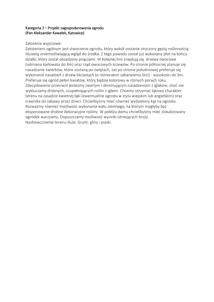 Kategoria 2 – Projekt zagospodarowania ogrodu (Pan Aleksander Kawałek, Katowice) Katowice) Założenia wyjściowe: Założeniem ogólnym jest stworzenie ogrodu, który wokół zostanie otoczony gęstą roślinnością liściastą uniemożliwiającą wgląd do środka. Z tego powodu został już wykonany płot na końcu działki, który został obsadzony pnączami. W kolejnej linii znajdują się drzewa owocowe (odmiana karłowata do 3m) oraz rząd owocowych krzewów. Po stronie północnej planuje się nasadzanie świerków, które zostaną po świętach, zaś po stronie południowej preferuje się wykonanie nasadzeń z drzew liściastych (o różnorakim zabarwieniu liści) - wysokości do 3m. Preferuje się ogród pełen kwiatów, który będzie kolorowy w różnych porach roku. Zdecydowanie przeciwni jesteśmy zwartym i dominującym nasadzeniom z iglaków, choć nie wykluczamy drobnych, uzupełniających roślin z igłami. Chcemy utrzymać łąkowy charakter terenu na zasadzie kwietnej łąki (ewentualnie ogrodu w stylu wiejskim lub angielskim) oraz trawnika do zabawy przez dzieci. Chcielibyśmy mieć również wydzielony kąt na ognisko. Rozważmy również możliwość wykonania wału ziemnego, na którym mogłyby być eksponowane drobne dekoracyjne rośliny. W pobliżu domu chcielibyśmy mieć zlokalizowany ogródek warzywny. Dopuszczamy możliwość wycinki istniejących brzóz. Nasłonecznienie terenu duże. Grunt: gliny i piaski.