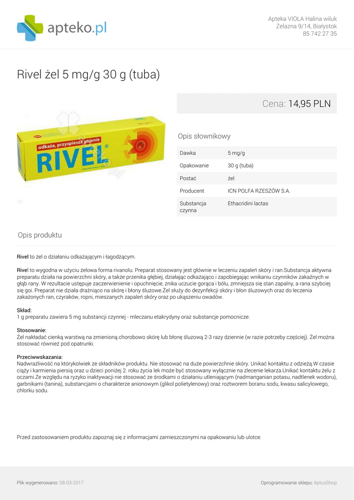 Apteka VIOLA Halina wiluk Żelazna 9/14, Białystok 85 742 27 35 Rivel żel 5 mg/g 30 g (tuba) Cena: 14,95 PLN Opis słownikowy Dawka 5 mg/g Opakowanie 30 g (tuba) Postać żel Producent ICN POLFA RZESZÓW S.A. Substancja czynna Ethacridini lactas Opis produktu Rivel to żel o działaniu odkażającym i łagodzącym. Rivel to wygodna w użyciu żelowa forma rivanolu. Preparat stosowany jest głównie w leczeniu zapaleń skóry i ran.Substancja aktywna preparatu działa na powierzchni skóry, a także przenika głębiej, działając odkażająco i zapobiegając wnikaniu czynników zakaźnych w głąb rany. W rezultacie ustępuje zaczerwienienie i opuchnięcie, znika uczucie gorąca i bólu, zmniejsza się stan zapalny, a rana szybciej się goi. Preparat nie działa drażniąco na skórę i błony śluzowe.Żel służy do dezynfekcji skóry i błon śluzowych oraz do leczenia zakażonych ran, czyraków, ropni, mieszanych zapaleń skóry oraz po ukąszeniu owadów. Skład: 1 g preparatu zawiera 5 mg substancji czynnej - mleczanu etakrydyny oraz substancje pomocnicze. Stosowanie: Żel nakładać cienką warstwą na zmienioną chorobowo skórę lub błonę śluzową 2-3 razy dziennie (w razie potrzeby częściej). Żel można stosować również pod opatrunki. Przeciwwskazania: Nadwrażliwość na którykolwiek ze składników produktu. Nie stosować na duże powierzchnie skóry. Unikać kontaktu z odzieżą.W czasie ciąży i karmienia piersią oraz u dzieci poniżej 2. roku życia lek może być stosowany wyłącznie na zlecenie lekarza.Unikać kontaktu żelu z oczami.Ze względu na ryzyko inaktywacji nie stosować ze środkami o działaniu utleniającym (nadmanganian potasu, nadtlenek wodoru), garbnikami (tanina), substancjami o charakterze anionowym (glikol polietylenowy) oraz roztworem boranu sodu, kwasu salicylowego, chlorku sodu. Przed zastosowaniem produktu zapoznaj się z informacjami zamieszczonymi na opakowaniu lub ulotce. Plik wygenerowano: 08-03-2017 Oprogramowanie sklepu: AptusShop Apteka VIOLA Halina wiluk Żelazna 9/14, Białystok 85 742 27 35 Plik wygenerowano: 08-03-2017 Powered by TCPDF (www.tcpdf.org) Oprogramowanie sklepu: AptusShop